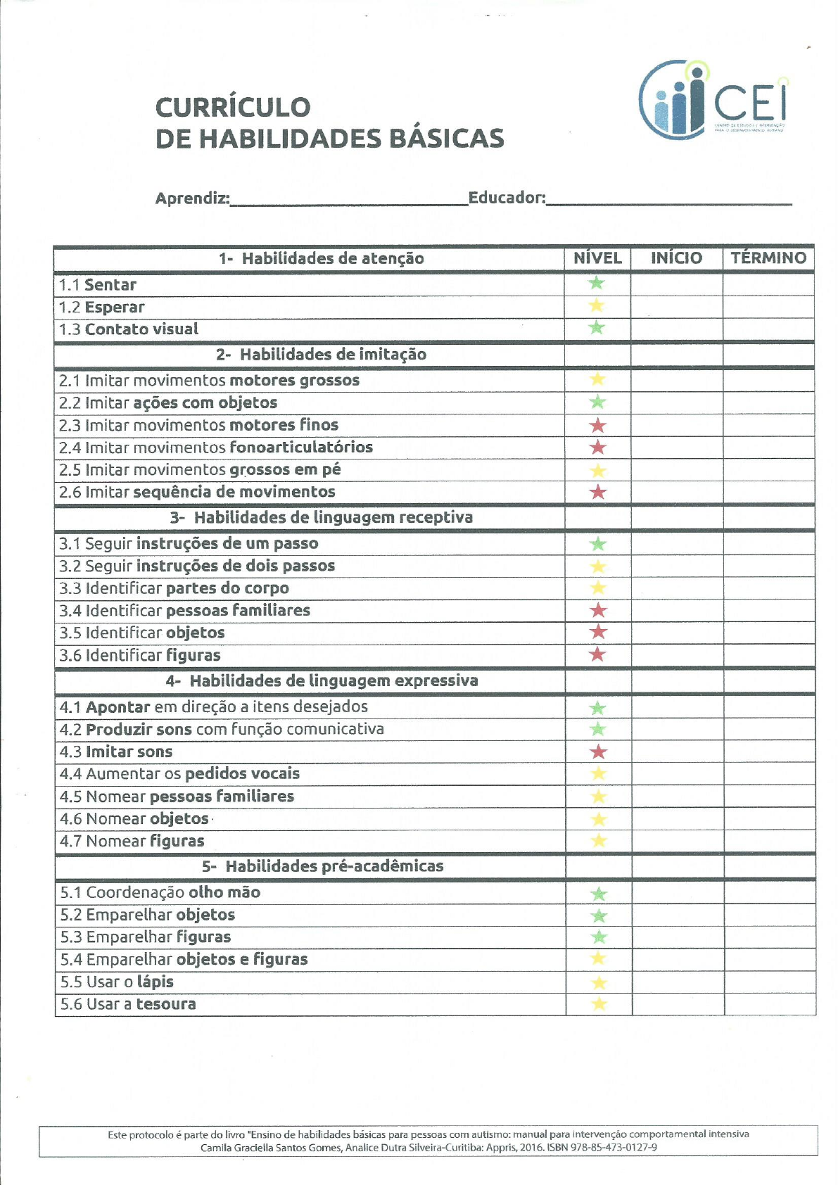 0 c. habiliades básicas 1.1 sentar 1.2 esperar 1.3 contato visual f1 1.3 contato visual f2 1.3 contato visual manutenção 2.1 imitar movimentos motores grossos f1 2.1 imitar movimentos motores grossos f2 2.2 imitar açoes com objetos f1 2.2 imitar açoes com objetos f2 2.2 imitar açoes com objetos manutenção 2.3 imitar movimentos motores finos f1 2.3 imitar movimentos motores finos f2 2.3 imitar movimentos motores finos manutenção 2.4 imitar movimentos fonoarticulatórios f1 2.4 imitar movimentos fonoarticulatórios f2 2.4 imitar movimentos fonoarticulatórios manutenção 2.5 imitar movimentos grossos em pé f1 2.5 imitar movimentos grossos em pé f2 2.5 imitar movimentos grossos em pé manutenção 2.6 imitar sequência de movimentos f1 2.6 imitar sequência de movimentos f2 2.6 imitar sequência de movimentos manutenção 3.1 imitar movimentos motores grossos manutenção 3.1 seguir instruções de um passo f1 3.1 seguir instruções de um passo f2 3.1 seguir instruções de um passo manutenção 3.2 seguir instruções de dois passo f1 3.2 seguir instruções de dois passo f2 3.2 seguir instruções de dois passo manutenção 3.3 identificar partes do corpo f1 3.3 identificar partes do corpo f2 3.3 identificar partes do corpo manutenção 3.4 identificar pessoas familiares manutenção 3.4 identificar pessoas familiares 3.5 identificar objetos manutenção 3.5 identificar objetos 3.6 identificar figuras manutenção 3.6 identificar figuras 4.1 apontar em direção a itens desejados 4.2 produzir sons com função comunicativa 4.3 imitar sons manutenção 4.3 imitar sons 4.4 aumentar os pedidos vocais manutenção 4.4 aumentar os pedidos vocais 4.5 nomear pessoas familiares manutenção 4.5 nomear pessoas familiares 4.6 nomear objetos manutenção 4.6 nomear objetos 4.7 nomear figuras manutenção 4.7 nomear figuras 5.1 coordenação olho mão 5.2 emparelhar objetos 5.3 emparelhar figuras 5.4 emparelhar objetos e figuras 5.5 uso do lápis 5.6 uso da tesoura