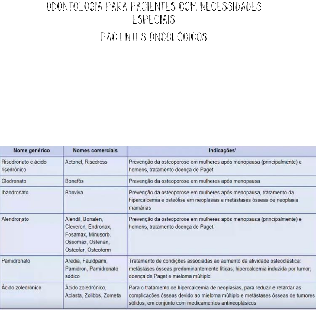 Bisfosfonatos - BFs São inibidores de reabsorção óssea mediada por osteoclastos Indicação: doenças ósseas metabólicas, hipercalcemia relacionada com mielo múltiplo, câncer de próstata, câncer de mama, osteoporose ou osteopenia e controle de metástases ósseas. Denosumab (anticorpo monoclonal) > ocasiona também A osteonecrose dos maxilares induzida por medicamentos tem que apresentar os três pontos para que seja o diagnóstico: ✓ Tratamento prévio ou atual com bisfosfonatos ✓ Osso necrótico nos maxilares a mais de 8 semanas ✓ Sem histórico de radioterapia em cabeça e pescoço (se ele tiver feito a radioterapia, vai ser classificado como osteoradionecrose) Exodontia em pacientes usando bisfosfonatos ✓ Mínimo trauma ✓ Fechamento primário da mucosa, fechar bem os bordos com a sutura pra ajudar a cicatrização do tecido. ✓ Uso de clorexidina 0,12% diário ✓ Cobertura antibiótica ✓ Uso de LBP, laser de baixa potência ✓ Uso de PRF (fibrina rica em plaquetas) Estagiamento da osteonecrose associada a bisfosfonatos Estágio 1: caracterizado por osso exposto sem nenhuma indicação de doença ou inflamação dos tecidos moles ou seu redor Estágio 2: áreas dolorosas no osso exposto acompanhadas por inflamação e/ou infecção nele e nos tecidos moles Estágio 3: estágio mais avançado. Presença de sequestração e/ou fratura, grande quantidade de exposição óssea e inflamação e/ou infecção em osso e tecidos moles. Varia de acordo com: ✓ Via de administração: Oral: aledronato tem prevalência de 0,5% Endovenoso: zoledronato tem prevalência de até 14,8% Exames hematológicos: Teloptídeo C-terminal Sérico (CTX) - Marcador de supressão óssea ✓ Valores de CTX menores que 100pg/ml: alto rico de exposição óssea ✓ Valores compreendidos entre 100pg/ml e 150pg/ml: risco moderado ✓ Valores acima de 150pg/ml: apresenta risco mínimo de exposição óssea Alto ou baixo, o cuidado deve ser o mesmo! Protocolo do prf Desbridamento do osso necrótico e depois insere o prf e instala para uma melhor recuperação. QUIMIOTERAPIA ✓ Pode-se intervir: pré, trans e pós quimio. ✓ Tem objetivo de eliminar células de rápido crescimento, ações no trato digestivo, pele e sangue são atingidas ✓ Terapia curativa ✓ Adjuvante ✓ Neoadjuvante ou prévio ✓ Paliativa Protocolo odontológico – trans-quimioterápico 1. Exame clínico semanal ou quinzenal 2. Exame clínico intra-oral – mucosite e sensibilidade dentária – tratamento paliativo e com fluoretação ATENÇÃO: Avaliar pacientes em uso de próteses – pode-se recomendar a suspensão das mesmas no período de tratamento. 3. Em casos de emergência (dor/infecção dental) – avaliar a possibilidade de procedimentos endodônticos em períodos inter-cíclicos e avaliar hemograma completo. UTILIZAR ANTIBIÓTICO. 4. Manter a salivação artificial 5. Avaliar a necessidade de prescrição de medicação antifúngica Protocolo odontológico – pós-quimioterápico 1. Exame clínico: avaliação bimestral 2. Exame clínico intra-oral – comprometimento pulpar, doença periodontal e lesões de tecido mole. AVALIAR presença de histórico clínico do caso, data de termino e quantidade de sessões. 3. Procedimentos cirúrgicos liberados após reconstituição medular – 2/3 meses após a quimioterapia. 4. Avaliar hemograma diante de necessidade de cirurgias entre o 1° e 2 ° ano, casos raros de não reconstituição medular. 5. Avaliar suspensão da salivação artificial 6. Proservação do paciente – principalmente radiográfica O tipo mais comum de câncer bucal é o cec A decisão sobre a melhor opção de tratamento é uma responsabilidade médica O tratamento depende: tmn, localização, idade do paciente e suas condições gerais. O tratamento cirugico é a primeira opção, mas ocasiona muitas sequelas: dificuldades de fonação e mastigação, extraorais, radiodermite, trismo, mucosite