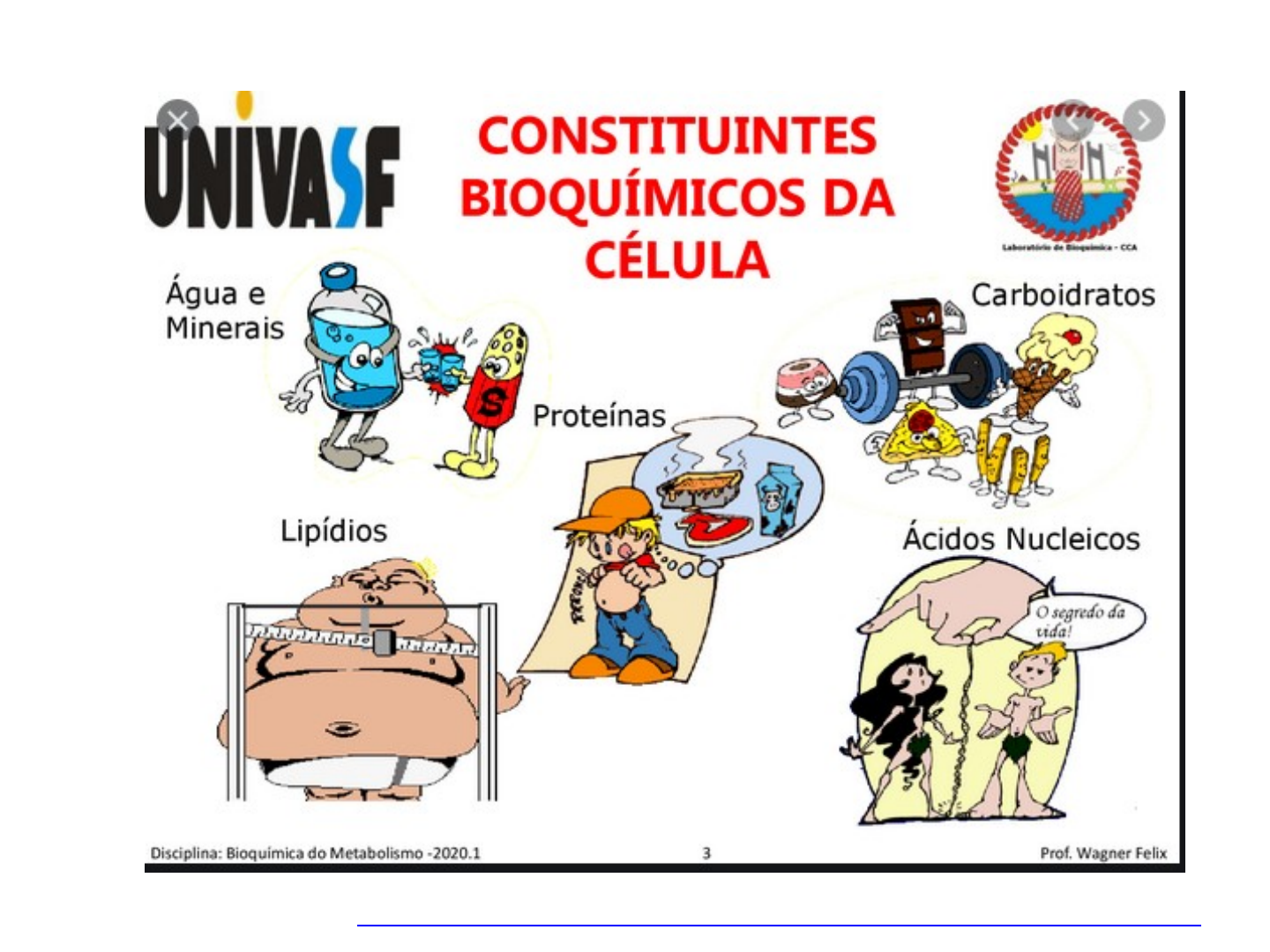 Bioquímica celular Imagem disponível em: https://www.docsity.com/pt/bioquimica-do-metabolismo/5466949/ Bioquímica celular Bioquímica celular: Ramo da biologia que estuda a composição e as propriedades químicas dos seres vivos. Elementos químicos que compõe a matéria viva: 96 elementos químicos ocorrem naturalmente no planeta, porém apenas 26 elementos são encontrados nos seres vivos. Elementos químicos mais abundantes da matéria viva são: Elemento Símbolo Percentuais médios nas células Oxigênio O 65% Carbono C 18% Hidrogênio H 10% Nitrogênio N 3% Fósforo P 1,2% Enxofre S O,25% Disponível em: https://planetabiologia.com/bioquimica-celular/ Bioquímica celular Principais substâncias presentes na matéria viva: Inorgânicas: Água e sais minerais. Orgânicas: Proteínas, lipídios, carboidratos, ácidos nucleicos, glicídios, outras. Disponível em: https://planetabiologia.com/bioquimica-celular/ Imagem disponível em: https://studylibpt.com/doc/5164965/subst%C3%A2ncias-org%C3%A2nicas 4 Imagem disponível em: https://www.goconqr.com/pt-BR/p/590585/note_page/263938 Substâncias Inorgânicas Água (H2O) Principal substância e a mais abundante nos seres vivos. 75 a 80% do peso corporal dos seres vivos. Essa proporção varia de acordo com a espécie e idade. Obtenção: Alimentos líquidos, sólidos e água potável. Disponível em: https://br.pinterest.com/pin/543739355015217100/ De acordo com a capacidade de dissolução na água as substâncias são classificadas como: Hidrofílicas: - Amiga da água. Hidrofóbicas: - Medo da água. Moléculas apolares (compostos formados apenas por C e H) não dissolvem em água. Composição da água H2O Importância da água Solvente universal : Possui grande poder de dissolução (a água dissolve quase todas as substâncias). Participa das reações químicas de hidrólise Hidrólise = quebra pela água Ex: Sacarose + H2O + Sacarase Glicose + Frutose + sacarase. Regulador térmico: - Impede variações bruscas de temperatura Mantém a temperatura celular constante Ex: Suor (responsável pela diminuição da temperatura corporal). Transporte de substâncias: Alimentos Gases respiratórios Excretas Seivas de plantas Imagem disponível em: https://blogdoenem.com.br/bioquimica-celular/ Proporção de água em alguns órgãos Imagem disponível em: https://www.sobiologia.com.br/conteudos/Agua/Agua2.php Importância da água Lubrificante - Olhos - Articulações Equilíbrio osmótico - A água é capaz de alterar as concentrações intra e extracelulares, com a finalidade de manter a homeostase ou equilíbrio das células. Imagem disponível em: http://aguam9.blogspot.com/2013/05/a-agua-como-regulador-termico.html Fatores que influenciam na quantidade de água no organismo Idade - Quanto maior a idade, menor é a quantidade de água no organismo. Ex: Feto: 94% de água Adulto: 70% de água Idoso: 60% de água Imagem disponível em: https://blogdoenem.com.br/bioquimica-celular/ Espécie - Homem adulto: 70% de água - Água viva: 98% de água - Sementes de planta: 15% de água Atividade metabólica do tecido - Encéfalo: 90% - Músculos: 80% - Dentina: 12% Fatores que influenciam na quantidade de água no organismo Imagem disponível em: https://www.vestcursos.com/APOSTILA%201%20-%20MO%CC%81DULO%20II%20-%20A%CC%81GUA%20e%20SAIS%20MINERAIS.pdf Continuação (substâncias inorgânicas) Sais Minerais Substâncias inorgânicas formadas por íons. São componentes reguladores do metabolismo celular. Obtenção: Água mineral e alimentos: frutos, verduras, cereais, leite, etc. Imagem disponível em: https://revistapilates.com.br/sais-minerais/ Imagem disponível em: http://biologia-no-vestibular.blogspot.com/2012/10/aula-bioquimica.html Imagem disponível em: https://anchor.fm/enzo-silva1 Substâncias Orgânicas: - Possuem átomos de carbono ligados covalentemente, além dos elementos H, O e N). - Desempenham inúmeras funções nos seres vivos: Metabolismo; Reserva; Estrutural; Informacional; Regulação. Essas se dividem em: Carboidratos; Lipídios, Proteínas, Vitaminas. Carboidratos: - Conhecidas também como hidratos de carbonos, glicídios, ou açúcares. Formadas fundamentalmente por átomos de carbono, hidrogênio e oxigênio. São as biomoléculas mais abundantes na natureza. Funções dos carboidratos: Principal (função energética). Estrutura dos ácidos nucleicos. Funções estruturais. Ex: celulose: compõe a parede celular das células vegetais. Tipos de Carboidratos Imagem disponível em: https://brainly.com.br/tarefa/28080965 Agora Mãos a Obra. Vamos estudar? Imagem disponível em: https://www.pressworks.com.br/noticia/app-maos-a-obra-e-apontador-firmam-parceria-no-ramo-construcao-civil-e-decoracao/ Quinta semana: Roteiro da aula 9 e 10 (Bioquímica celular). 1 Passo (Inicia com uma aula online sobre bioquímica celular). 2 Passo (Texto didático sobre o assunto para reforço do conteúdo). 3 Passo (Leitura do material disponibilizado na trilha 2 do seu caderno de apoio de biologia). 4 Passo (Momento mão na massa: Estudo dirigido sobre o assunto abordado. Obs: não esqueçam de estudar, colocar seus assuntos e atividades em dia