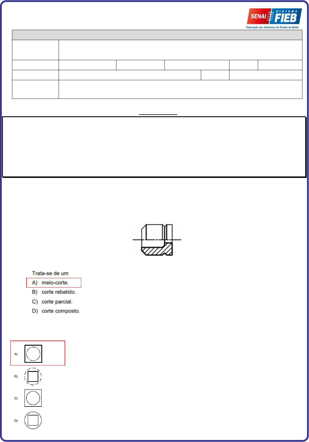 Página 1 de 5 INSTRUÇÕES: 1. Leia atentamente as questões antes de respondê-las; 2. Responda a prova com caneta azul ou preta; 3. Não será aceito qualquer tipo de consulta com a penalidade de anulação desta avaliação; 4. Seja organizado, evite rasuras; 5. Consulte seu professor só em caso de dúvidas quanto à legibilidade desta prova; 6. Antes de entregar sua prova, releia com atenção, observando se a grafia está legível e se há coerência nas respostas; 7. Não serão permitidas folhas de rascunho avulsas; 8. O celular deverá permanecer desligado. Caso o celular toque ou mesmo o aluno atenda o celular, a avaliação será anulada. 9. Esta avaliação contem 9 questões, totalizando 9,0 pontos. 1. Observe abaixo a projeção ORTOGONAL EM CORTE e assinale a resposta correta 2. Uma peça foi criada subtraindo-se um cilindro que estava contido num cubo. Uma vista ortográfica dessa peça está corretamente desenhada em: AVALIAÇÃO INDIVIDUAL NOME: TURNO: NOTURNO TURMA: DATA: CURSO: TÉCNICO DA QUALIDADE PROF.: LUIZ ERNESTO UNIDADE CURRICULAR: LEITURA E INTERPRETAÇÃO DE DESENHOS Página 2 de 5 3. Segundo as normas técnicas da ABNT, devem constar na Legenda das folhas de Desenho Técnico, A) Autoria do desenho e do projeto, identificação do cliente e escalas gráficas. B) Identificação do cliente, nome do projeto ou do empreendimento e planta-chave. C) Descrição da revisão, data, título do desenho, escalas e convenções gráficas. D) Título do desenho, escalas, indicação de revisão e indicação sequencial do projeto. 4. As vistas ortográficas frontal, superior e lateral esquerda que estão coerentes e corretamente desenhadas, segundo a teoria projetiva e as normas do Desenho Técnico, são: 5. De acordo com a NBR 8403:1984, que fixa os tipos e o escalonamento de larguras de linhas para uso em desenhos técnicos e documentos semelhantes, a linha denominada “traço dois pontos estrei- ta”, conforme ilustra a figura abaixo, tem sua aplicação geral em; Página 3 de 5 6. A NBR 8196:1999 fixa as condições exigíveis para o emprego de escalas e suas designações em desenhos técnicos. Ao medir o desenho em escala representado na figura por meio de uma régua milimetrada, identifica- se, para a distância entre centros dos furos, 60 mm, e, para o diâmetro de cada furo, 12 mm. 7. A NBR 6158:1995 estabelece o sistema de tolerâncias e ajustes aplicados em desenho técnico me- cânico. A cota da figura está representada com base nessa norma. A informação prescrita na cota é que: (A) A tolerância é de − 0,025 mm. (B) A dimensão mínima do eixo é de − 0,025 mm. (C) A dimensão máxima do eixo é 32,000 mm. (D) O afastamento inferior é 0,000 mm. Página 4 de 5 8. A perspectiva representada na figura é conhecida em desenho técnico como perspectiva (A) Exata (B) Bimétrica (C) Isométrica (D) Cavaleira a 30º (E) Cavaleira a 45º Página 5 de 5 9. Dada a perspectiva na figura acima, qual é a representação das vistas ortográficas no primeiro diedro, considerando os furos da base como passantes?