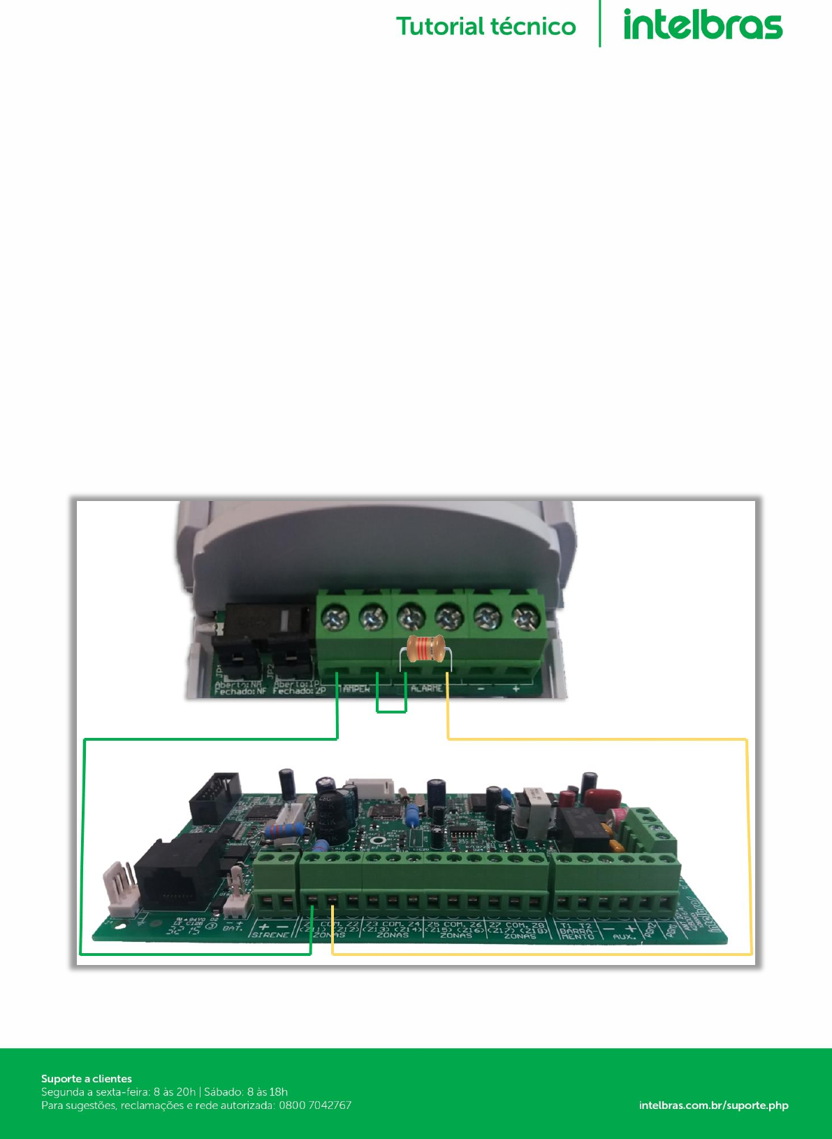 Ligando sensores nos alarmes Intelbras com uso de resistores. Santa Rita do Sapucaí, 14 de Novembro de 2018 Esquemas para ligação de zonas simples Ligações de zonas simples com uso de resistor aumentam a segurança do sistema 1°- Zona simples sem resistor de final de linha e com detecção de tamper. Com este modo de ligação se ocorrer a sabotagem do sensor, a chave tamper irá ser acionada e abrirá o borne TAMPER do sensor indicando que houve violação. O modo de ligação vale para todas as zonas com fio da central. OBS: O resistor deve ser instalado junto com o sensor e não deve ser instalado diretamente no borne da zona. 2°- Zona simples com resistor de final de linha e detecção de curto-circuito da fiação. Este modo de ligação detecta se o fio do sensor foi colocado em curto- circuito. Neste modo não há detecção de tamper. Este modo de ligação vale para todas as zonas com fio da central. OBS: O resistor deve ser instalado junto com o sensor e não deve ser instalado diretamente no borne da zona. 3°- Zona simples com resistor de final de linha, detecção de tamper e de curto-circuito da fiação. É o modo de ligação mais completo para zonas simples. O modo de ligação vale para todas as zonas. OBS: O resistor deve ser instalado junto com o sensor e não deve ser instalado diretamente no borne da zona. Esquemas para ligação de zonas duplas Com a função de Zona dupla habilitada, o sistema reconhece duas zonas por borne de entrada. 4°- Esquema de Zona dupla sem resistor de final de linha Está ligação não reconhece curto-circuito da fiação e não possui detecção de tamper. O sensor em que o resistor de 2K2 está conectado é reconhecido como zona baixa, já o sensor com o resistor de 3K9, é reconhecido como zona alta. O modo de ligação vale para todas as zonas. OBS: O resistor deve ser instalado junto com o sensor e não deve ser instalado diretamente no borne da zona. 5°- Zona dupla sem resistor de final de linha e com detecção de tamper O sensor em que o resistor de 2K2 está conectado é reconhecido como zona baixa, já o sensor com o resistor de 3K9, é reconhecido como zona alta. O modo de ligação vale para todas as zonas com fio da central. OBS: O resistor deve ser instalado junto com o sensor e não deve ser instalado diretamente no borne da zona. 6° - Zona dupla com resistor de final de linha, detecção de tamper e de curto-circuito da fiação. Neste tipo de ligação é necessário o uso de um terceiro resistor também de 2K2 entre um dos sensores e a zona. O sensor em que o resistor de 2K2 está conectado é reconhecido como zona baixa, já o sensor com o resistor de 3K9, é reconhecido como zona alta. A central detectará sabotagens de curto-circuito na fiação e abertura do tamper do sensor. O modo de ligação vale para todas as zonas com fio. OBS: O resistor deve ser instalado junto com o sensor e não deve ser instalado diretamente no borne da zona. 7°- Duplicação em paralelo com detecção de curto- circuito da fiação. Os sensores são ligados em paralelo na entrada da zona, como se fossem duas entradas independentes, e os resistores são ligados em série com os sensores. Este modo de ligação não possui detecção de tamper. A zona baixa é o sensor com resistor de 2K2 e a zona alta com o de 3K9. O modo de ligação vale para todas as zonas. OBS: O resistor deve ser instalado junto com o sensor e não deve ser instalado diretamente no borne da zona.