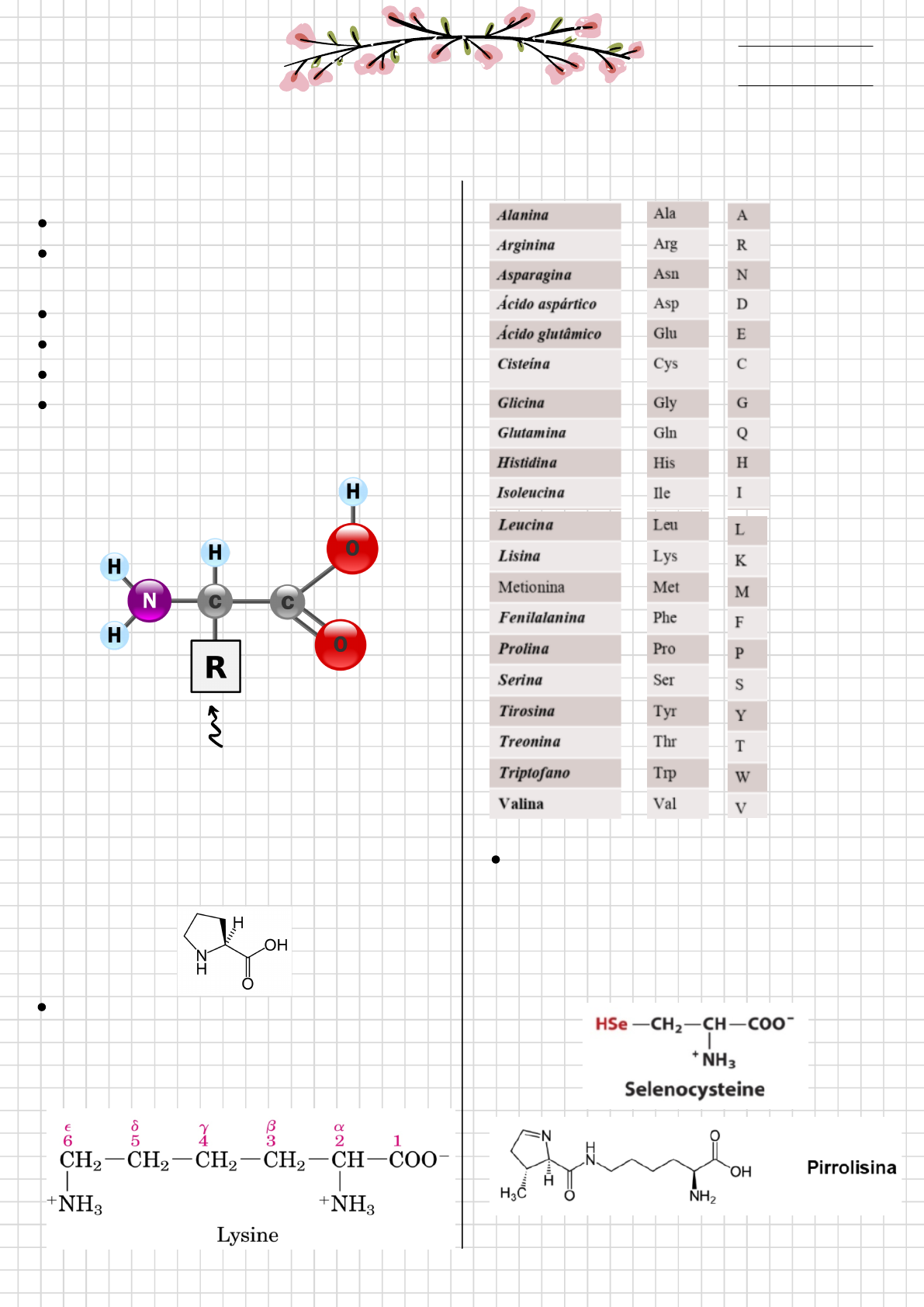 São as unidades formadoras das PROTEÍNAS. Os AA se caracterizam por possuir um grupo Carboxila (COOH) e um grupo Amina (NH2), ligados ao mesmo carbono. A este carbono também se liga um radical químico –R de estrutura variável e o H. A cadeia lateral (R) varia em tamanho, forma, carga, capacidade de formação de pontes de hidrogênio, caráter hidrófobo e reatividade química Com exceção da prolina, todos os aminoácidos apresentam esta estrutura geral. A prolina não é um aminoácido típico, e sim um iminoácido, uma vez que seu Cα e seu Nα fazem parte de um anel heterocíclico da molécula. Além dos 20 AAs, existem mais 2 aminoácidos que são determinados geneticamente, que só aparecem em alguns tipos de proteínas, a selenocisteína e a pirrolisina, identificada em bactérias do gênero Methanosarcina. Os átomos de carbono nos aminoácidos são denominados em sequencia usando o alfabeto grego (α, β, γ, δ, ε) começando no carbono ligado a carboxila. @Ríllary.monteir0 Aula 01 25 /05/21 Bioquímica AMINOÁCIDOS TABELA DE AMINOÁCIDOS Mensageiros químicos – neurotransmissores inibitórios (Glicina, ácido γ-aminobutírico (GABA); excitatórios (ác glutâmico, ác aspártico, epinefrina, norepinefrina) Creatina e carnitina – intervem no metabolismo energético (creatina-P fonte de energia no tecido muscular; carnitina participa no transporte de ácidos graxos) Componentes de nucleotídeos e ácidos nucléicos Intermediários metabólicos Formam peptídeos e proteínas @Ríllary.monteir0 Aula 01 25 /05/21 Bioquímica AMINOÁCIDOS AMINOÁCIDOS ESPECIAIS: São produzidos enzimaticamente, por modificação pós-tradução de um dos 20 aminoácidos clássicos FUNÇÕES DOS AMINOÁCIDOS CLASSIFICAÇÃO DOS AMINOÁCIDOS (Quanto a cadeia lateral) Apolares (hidrofóbicos) Polares (hidrofiicos) Essenciais: não são sintetizados no organismo, devendo ser obtidos através da dieta. São eles: fenilalanina, histidina, isoleucina, leucina, lisina, metionina, treonina, triptófano, valina (histidina é essencial na infância). Lisina e isoleucina (feijão), leucina e valina (arroz). Não essenciais: o organismo consegue sintetizá- los em quantidades adequadas. Essa classificação é dada em relação ao destino tomado pelo aminoácido quando o grupo amina é excretado do corpo na forma de uréia (mamíferos). Glicogênico - quando participam da gliconeogênese Cetogênico - quando geram corpos cetônicos (Lis-Leu) Glico-cetogênico - quando a rota metabólica leva a formação de glicose e de corpos cetônicos. @Ríllary.monteir0 Aula 01 25 /05/21 Bioquímica AMINOÁCIDOS CLASSIFICAÇÃO DOS AMINOÁCIDOS (Quanto as necessidades dietárias) CLASSIFICAÇÃO DOS AMINOÁCIDOS (Quanto ao destino) PROPRIEDADES DOS AMINOÁCIDOS São todos compostos sólidos, cristalinos, incolores. A maioria apresentam sabor adocicado; alguns sem sabor; e outros amargos. Atividade Óptica – com exceção da glicina, todos os aminoácidos naturais apresentam atividade óptica desviando a luz polarizada para a direita ou para a esquerda. Propriedade Elétrica (ácido/básica) – os aminoácidos possuem pelo menos dois grupos ionizáveis: um grupo carboxílico (-) e um grupo amínico (+). Solubilidade – é relativamente elevada em água e reduzida em solventes orgânicos. Ponto de Fusão – é bastante elevado (200-300°C) sendo normalmente acompanhado de decomposição da estrutura química original. Os AA são anfóteros pois, em solução aquosa, comportam-se como ácido e como base, formando íons dipolares. O grupamento carboxila ioniza-se em solução aquosa liberando próton e adquirindo carga negativa; O grupamento amina ioniza-se em solução aquosa aceitando prótons e adquirindo carga positiva; @Ríllary.monteir0 Aula 01 25 /05/21 Bioquímica AMINOÁCIDOS O Carbono α dos AA é assimétrico, um centro quiral, portanto opticamente ativo. Cada carbono assimétrico forma 2 imagens especulares que são denominadas estereisômeros ( D e L). Atividade óptica Ocorrência dos isômeros Os aminoácidos das proteínas têm todos a configuração L. Alguns AAs D livres ocorrem em tecidos vivos (D- serina e D-aspartato no tecido Nervoso; D-alanina e D-glutamato nas paredes celulares de bactérias,…). Ionização de aminoácidos Aminoácido Aminoácido em sol. aq com pH 7 composto iônico, são ligeiramente solúveis em água como compostos iônicos. Aminoácidos livres em solução existem predominantemente como íons dipolares (zwitterions). Na forma dipolar, o grupamento amino é protonado (NH3+) e o grupamento carboxila, desprotonado (COO-). O fato dos aminoácidos serem zwitterions afeta suas propriedades físicas. Todos os aminoácidos são sólidos com alto ponto de fusão o que é esperado para um Em meio básico, os AA tendem a doar prótons, comportando-se como ácidos e adquirindo carga negativa - ionizam-se em seus radicais carboxila. O valor de pH onde as cargas elétricas do aminoácido se igualam e se anulam chama-se PONTO ISOELÉTRICO (pI), ou pH ISOELÉTRICO. Em meio ácido, os AA tendem a aceitar prótons, comportando-se como base e adquirindo carga positiva - ionizam em seus radicais amina Reações do grupo α-COOH – esse dá as reações características dafunção carboxílica, sendo mais características: formação de amida,formação de ésteres, formação de haletos. Reações dos grupos α-NH2 e ε-NH2 – esses grupos são bastante reativos principalmente em sua forma desprotonada. Dentre as inúmeras reações desse grupo, destacam-se: reação com a ninidrina, reação de Sanger, reação de Edman. Reações dos radicais R – os principais grupos ativos dos radicais R dos aminoácidos além do grupo ε-NH2 são: -SH sulfidrilo (Cys), -OH fenólico (Tyr), imidazólico (His), guanidínico (Arg). Reação de Maillard é uma reação que ocorre entre os aminoácidos ou proteínas e os açúcares (carboidratos): quando o alimento é aquecido o grupocarbonila (C