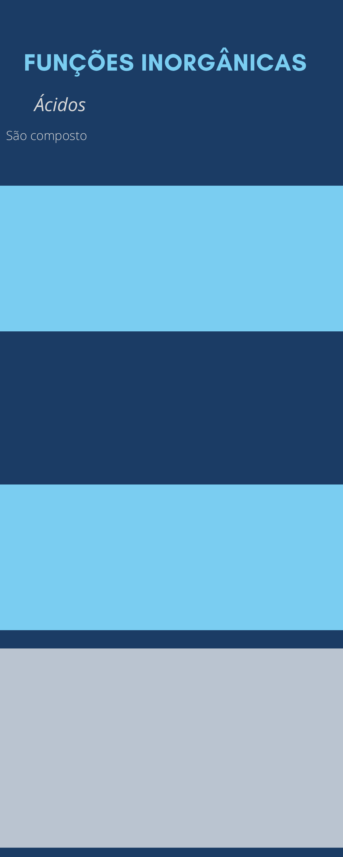 FUNÇÕES INORGÂNICAS Ácidos São compostos covalentes, que compartilham eletrons em suas ligações. Monoácidos: possuem apenas um hidrogênio ionizável. Exemplos: HNO3, HCl e HCN Diácidos: possuem dois hidrogênios ionizáveis. Exemplos: H2SO4, H2S e H2MnO4 Triácidos: possuem três hidrogênios ionizáveis. Exemplos: H3PO4 e H3BO3 Tetrácidos: possuem quatro hidrogênios ionizáveis. Exemplos: H4P7O7 Exemplo dos principais ácidos: cido clorídrico (HCl), ácido sulfúrico (H2SO4), ácido acético (CH3COOH), ácido carbônico (H2CO3) e ácido nítrico (HNO3). Amanda Almeida Óxidos são compostos binários (iônicos ou moleculares), que têm dois elementos. Possuem oxigênio na sua composição, sendo ele o seu elemento mais eletronegativo. Iônicos = oxigênio com metais. Exemplo: ZnO. Moleculares = oxigênio com não metálicos SO2 Básicos Em solução aquosa alteram o pH para maior que 7. Exemplo: Li2O ( e demais metais alcalinos e alcalinos terrosos). Ácidos Em solução aquosa reagem com a água e formam ácidos. Exemplos: CO2, SO3 e NO2. Neutros Alguns óxidos que não reagem com a água. Exemplo: CO. Anfóteros Podem se comportar como ácidos ou bases. Exemplo: ZnO. Peróxidos Em solução aquosa reagem com a água ou ácidos diluídos e formam água oxigenada H2O2. Exemplo: Na2O2. Saís são compostos iônicos que apresentam, no mínimo, um cátion diferente de H+ e um ânion diferente de OH-. Um sal pode ser obtido em uma reação de neutralização, que é a reação entre um ácido e uma base. Sais Neutros Quando são dissolvidos em água não alteram o pH. Exemplo: NaCl. Sais básicos Quando são dissolvidos em água fazem o pH da solução ficar maior que 7. Exemplo: CH3COONa. Sais ácidos Quando são dissolvidos em água fazem o pH da solução ficar menor que 7. Exemplo: NH4Cl. Principais sais Nitrato de potássio (KNO3), hipoclorito de sódio (NaClO), fluoreto de sódio (NaF), carbonato de sódio (Na2CO3) e sulfato de cálcio (CaSO4). Bases São compostos iônicos formados por cátions, na maioria das vezes de metais, que se dissociam em água liberando o ânion hidróxido (OH-). Monobases Possuem apenas uma hidroxila. Exemplos: NaOH, KOH e NH4OH Dibases Possuem duas hidroxilas. Exemplos: Ca(OH)2, Fe(OH)2 e Mg(OH)2 Tribases Possuem três hidroxilas. Exemplos: Al(OH)3 e Fe(OH)3 Tetrabases Possuem quatro hidroxilas. Exemplos: Sn(OH)4 e Pb(OH)4 Principais bases são hidróxido de sódio (NaOH), hidróxido de magnésio (Mg(OH)2), hidróxido de amônio (NH4OH), hidróxido de alumínio (Al(OH)3) e hidróxido de cálcio (Ca(OH)2). Amanda Almeida