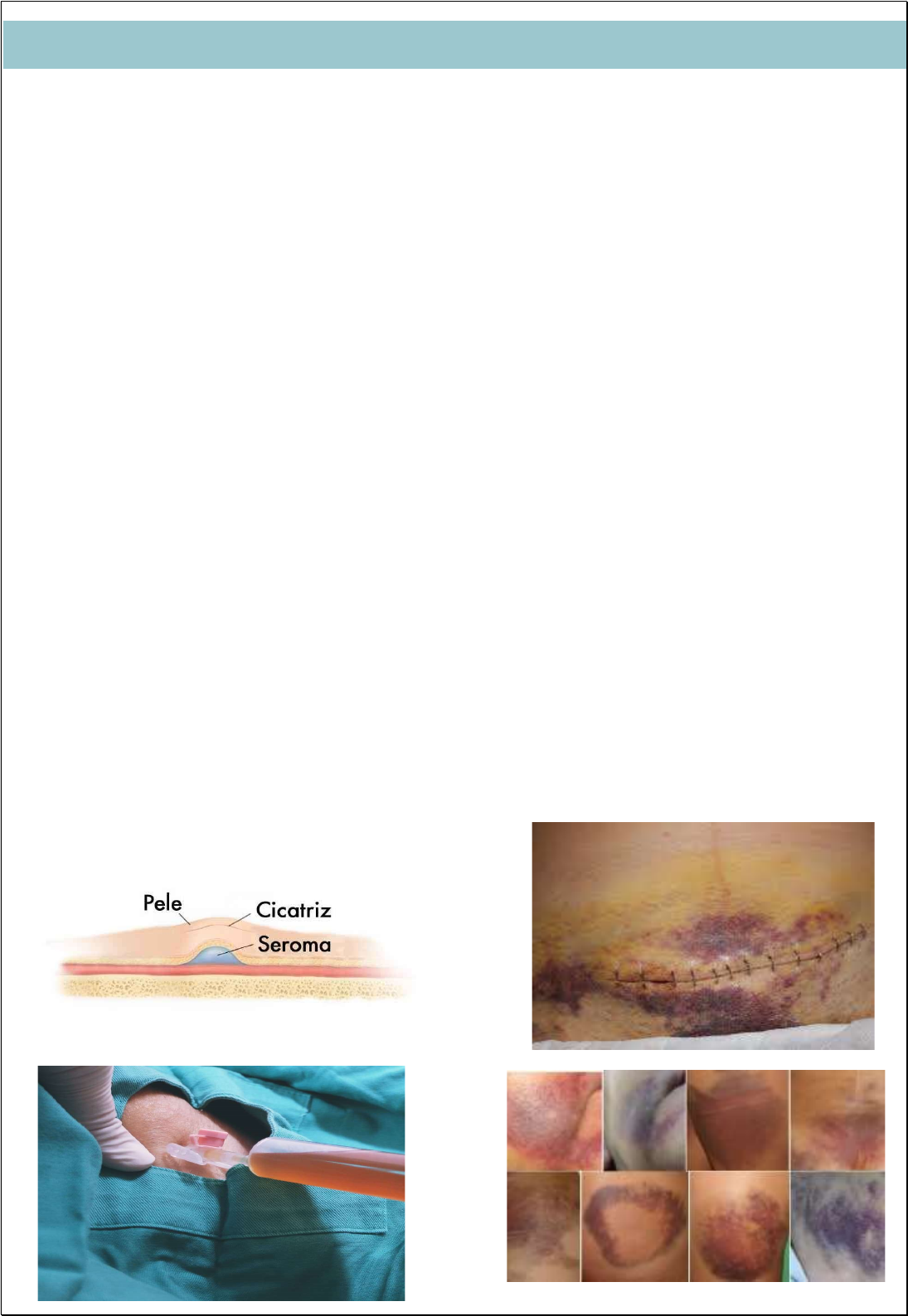 COMPLICAÇÕES CIRÚRGICAS Complicações da ferida cirúrgica Seroma É uma junção de gordura liquefeita, soro e líquido linfático que se forma sob a incisão; Geralmente, é claro, amarelado e um pouco viscoso localizado na camada subcutânea (abaixo da derme); Uma das complicações mais benignas do pós-operatório, sendo mais prováveis quando retalhos cutâneos grandes são necessários no procedimento cirúrgico. Ex: mastectomia, dissecção axilar, dissecção da região inguinal e grandes hérnias ventrais; Quadro clínico: edema localizado e bem circunscrito, com desconforto à pressão e eventual drenagem de líquido claro pela ferida não cicatrizada Pode ser prevenido com a colocação de drenos de sucção sob os retalhos, porém quando retirados precocemente são grandes causadores de seromas que necessitarão de aspiração sob condições estéreis com colocação de curativos compressivos; Aqueles que se acumulam após pelo menos duas aspirações são expelidos pelo orifício da incisão e limpados com gaze umedecida com solução salina para auxiliar a cicatrização por 2ª intenção; Seromas infectados também são tratados por drenagem aberta, porém na presença de telas sintéticas há uma dificuldade de cicatrização pela sua presença. Para tratá-la será necessário avaliar a gravidade e extensão da infecção; Quando não há sepse grave e celulite disseminada, mas uma infecção localizada, a tela deve ser deixada no local e removida posteriormente quando há cura do processo infeccioso. Entretanto, em situações como as primeiras, é indicado a remoção da tela e o tratamento da ferida deve ser com curativo de ferida aberta. Hematoma É uma espécie de acúmulo anormal de sangue, normalmente na camada subcutânea de uma incisão recente ou um espaço potencial na cavidade abdominal após exérese de um órgão; São ditos mais preocupantes que os seromas pela sua suscetibilidade de infecções secundárias; Sua presença está relacionada com: hemostasia, depleção dos fatores de coagulação e presença de coagulopatia (decorrentes de inúmeros fatores como distúrbios mieloproliferativos, doenças hepáticas, insuficiência renal, medicamentos e outros); Principais medicamentos associados à coagulopatia são os antiplaquetários (AAS/aspirina, ASA, clopidogrel, ticlopidina e etc) e anticoagulantes (heparina não fracionada – HNF; heparina de baixo peso molecular – HBPM como a enoxaparina, dalteparina de sódio e a tinzaparina; e antagonista da vitamina K – AVK como a varfarina sódica). Sendo assim, indica-se a descontinuação desses medicamentos antes dos procedimentos cirúrgicos, entretanto, SEMPRE É NECESSÁRIO AVALIAR A RELAÇÃO RISCOxBENEFÍCIO DE CADA PACIENTE; Manifestações clínicas: poderão variar de acordo com seu tamanho, localização e presença de infecção, assim, pode causar desde dor, comprometimento local (via aérea, quando no pescoço), íleo paralítico, anemia ou sangramento e até síndrome do compartimento (cavidade abdominal); Ao exame: consiste em uma tumefação macia localizada com descoloração azul-purpúrica da pele. Variando de pequena à grande, podendo ser sensível à palpação ou associada à drenagem de líquido (coloração vermelho-escuro); A avaliação de pacientes que apresentam hematomas, sobretudo os grandes e expansivos, deve incluir fatores de risco preexistentes e parâmetros de coagulação (Ex: tempo de protrombina, tempo de protrombina parcial ativado, INR, contagem de plaquetas e tempo de sangramento), bem como, o tratamento mais adequado a situação. complicacoes cirurgicas Deiscência da Ferida Deiscência em suma é a separação das camadas musculoaponeuróticas no início do pós-operatório; É uma das complicações mais temidas pelos cirurgiões, devido as chances de evisceração, intervenção imediata e probabilidade aumentada de deiscência repetida, infecção da ferida e formação de hérnia incisional; Ocorrem em 1-3% dos pacientes que passam por cirurgias, mais comumente entre 7 e 10 dias de pós-operatório. Contudo, pode ocorrer a qualquer hora entre o 1 e mais de 20 dias; Importante ressaltar acerca do cuidado com o fechamento contínuo em pacientes com risco aumentado, já que a ruptura do fio em um ponto poderá enfraquecer todo o fechamento; Fatores associados à deiscência da ferida: 1. Erro técnico no fechamento aponeurótico; 2. Cirurgia de emergência; 3. Infecção intra-abdominal; 4. Idade avançada; 5. Seroma, hematoma e infecção da ferida; 6. Pressão intra-abdominal aumentada; 7. Obesidade; 8. Uso crônico de corticosteroides; 9. Deiscência de ferida anterior; 10. Desnutrição; 11. Quimioterapia e radioterapia; 12. Doenças sistêmicas (Ex: DM). A prevenção é uma função de grande cuidado e atenção a técnica de fechamento da aponeurose (espaçamento adequado da sutura, profundidade do pedaço ou porção pega da fáscia, relaxamento do paciente durante o fechamento e alcançar um fechamento livre de tensão); Pacientes de alto risco indicado fechamento com sutura em pontos separados; Para tratar a deiscência, será necessário avaliar a extensão da separação da fáscia e da presença de evisceração e/ou patologia intra-abdominal significativa (Ex: deiscência intestinal, peritonite); Uma deiscência quando pequena, sobretudo na porção proximal da incisão na linha média superior 10 a 12 dias após a cirurgia, pode ser tratada de maneira conservadora com compressas de gaze umedecida com solução salina na ferida e o uso de uma cinta abdominal; Em caso de evisceração, os intestinos eviscerados devem ser cobertos com uma compressa estéril umedecida com solução salina e preparando o paciente para retornar à sala de cirurgia após um período muito curto de reanimação volêmica. Infecção da ferida Infecções do sítio cirúrgico (ISCs) ainda continuam a ser um problema significativo para os cirurgiões mesmo após se