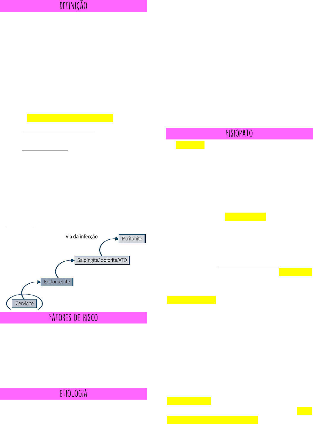 Doença inflamatória pélvica (DIP) Síndrome clinica secundária à ascensão (via canalicular) de microrganismos da vagina e/ou colo do útero ao trato genital feminino superior acometendo útero, tubas uterinas, ovários, superfície peritoneal e/ou estruturas contiguas desse trato. → infecção adquirida em comunidade iniciada por um agente sexualmente transmissível (Clamydia trachomatis e Neisseria gonorrhoeae); → infecção polimicrobiana; → sério problema de saúde pública: • Emergência hospitalar: ruptura do ATO (abscesso tubo-ovariano) e pelviperitonive; • Longo prazo: infertilidade, gravidez ectópica e dor pélvica crônica. → padrão clínico subagudo, oligossintomática e dor abdominal em intensidade variável (sintoma obrigatório). CID-10 → doenças inflamatórias dos órgãos pélvicos femininos (CID N70-N77): • DIP gonocócica: N74.3; • DIP clamídia: N74.4. Mulheres jovens (maior chance de recorrência), comportamento sexual de risco, múltiplos parceiros (parceiro portador de uretrite), baixo nível socioeconômico, nuliparidade, história anterior ou atual de IST, uso de DIU (cervicite na época da inserção), tabagismo, uso de duchas vaginais. Polimicrobiana: à medida que ocorre a evolução do processo o ambiente vai se tornando anaeróbio aumentando a presença de microrganismos anaeróbicos. Além do gonococo e clamídia, a infecção pode ser causada também por bactérias da classe Molicutes (Mycoplasma hominis, M. genitalium – frequencia crescente e resistência a antibióticos usuais - e Ureoplasma ureolyticum) e por bactérias presentes na microbiota vaginal (Gardnerella vaginalis, Bacterioides spp. e outros responsáveis por vaginoses – 9 a 23% dos casos) → presença de agentes de vaginoses aumenta em ~2vezes o risco de DIP. 1. cervicite (estádio 0 ou pré-DIP → chance de 20 a 30% de desenvolver DIP sendo maior quanto menor a idade). 2. ascensão e chegada ao endométrio (principalmente na época menstrual ou pós- menstrual imediata – menstruação pode ser um meio de cultura além de alcalinizar o meio, modificação do muco cervical [barreira mecânica]) → endometrite (geralmente fugaz, pode haver sangramento discreto); ** microrganismos da microbiota vaginal também ascendem. 3. ascensão e chegada a tuba uterina, onde há formação de conteúdo purulento a partir da reação tecidual (endossalpinge) → salpingite 4. passagem do conteúdo purulento para o peritônio pélvico a partir das fimbrias → pelviperitonite. ** maior acúmulo do fundo do saco de Douglas (dispaurenia – dor durante ou após o ato sexual – e dor ao toque vaginal, principalmente nessa região). ** alças intestinais e epíplon tendem a bloquear o processo purulento formando o complexo tubo-ovariano. 5. aumento da viscosidade desse conteúdo → fusão das fimbrias tubárias, aprisionamento de pus no seu interior (↓O2, ↑anaeróbios) → piosalpingite. 6. propagação para o ovário → ATO (Abscesso Tubo-Ovariano). ** pode ser esterilizado e formar uma massa multicística com conteúdo citrino estéril (hidossalpinge – sequela do processo inflamatório e infeccioso). ** conteúdo do ATO pode aumentar a tensão intra-abscesso e se romper → quadro grave com grande derramamento de pus no peritônio, choque séptico e até levar a óbito (baixíssima frequência). Dor: resulta da entrada desses agentes na cavidade uterina, torna-se maior quando afeta a cavidade pélvica e máxima quando há ruptura do ATO. Sensação dolorosa diminuída quando há fusão das fímbrias. Ampla variação de sinais e sintomas (sinais leves até dor abdominal intensa). Diagnóstico diferencial em mulheres de 15 a 44 anos. Diagnóstico de certeza é muito difícil pois nem a história clínica, nem o exame físico ou testes laboratoriais são sensíveis ou específicos o suficiente para isso. → diagnóstico clínico + laparoscopia: valor preditivo positivo de 65 a 90%. Paciente pode apresentar-se assintomática (60%) ou ter sintomas (36% leves a moderados e 4% mais graves) como: → dor abdominal ou pélvica (começa com um desconforto e podendo progredir; bilateral); → febre, calafrios; → corrimento vaginal ou cervical, coceira ou odor; → sangramento vaginal (anormal e de pouca quantidade após a menstruação – spotting, comum em mulheres que usam anticoncepcional de baixa dosagem; endometrite fugaz – aumento ou prolongamento da menstruação) → dispaurenia (inflamação dos ligamentos pélvicos/peritonite); → disúria (associado à dor, principalmente quando há uretrite); → dor lombar, náusea e vômitos. Deve ser feito com manifestações uroginecológicas, gastrointestinais e musculoesqueléticas. Elevada suspeição na presença de um ou mais dos critérios mínimos diagnósticos, implantando terapêutica antibiótica precoce, reduzindo chance de sequelas. Principais: ➢ Gravidez ectópica; ➢ Tumor, torsão ou cisto ovariano; ➢ Aborto séptico incompleto; ➢ Endometriose, adenomiose, leiomioma uterino, endometrioma roto; ➢ Nefrolitiase, pielonefrite, cistite; ➢ Litíase urinaria; ➢ Apendicite, síndrome do intestino irritável e outras doenças gastrointestinais. Hemograma completo (leucocitose e/ou bastonetose – sugestão de processo inflamatório). Exames de urina tipo I e urocultura (afastar infecção do trato urinário). Provas bioquímicas inflamatórias (velocidade de hemossedimentação – VHS – e PCR). ** ajuda no raciocínio diagnóstico mesmo sendo inespecíficas. Exame bacterioscópio (avaliar presença de vaginose bacteriana). Identificação do agente (provas de biologia molecular para diagnóstico de clamídia e gonococo – cultura para este com antibiograma e determinação da resistência). Teste de gravidez (afastar possibilidade de gravidez ectópica). Ultrassonografia transvaginal (USTV): método de escolha para avaliação inicial de dor pélvica, na imagem pode ser visto: ➢ Espessamento da pa