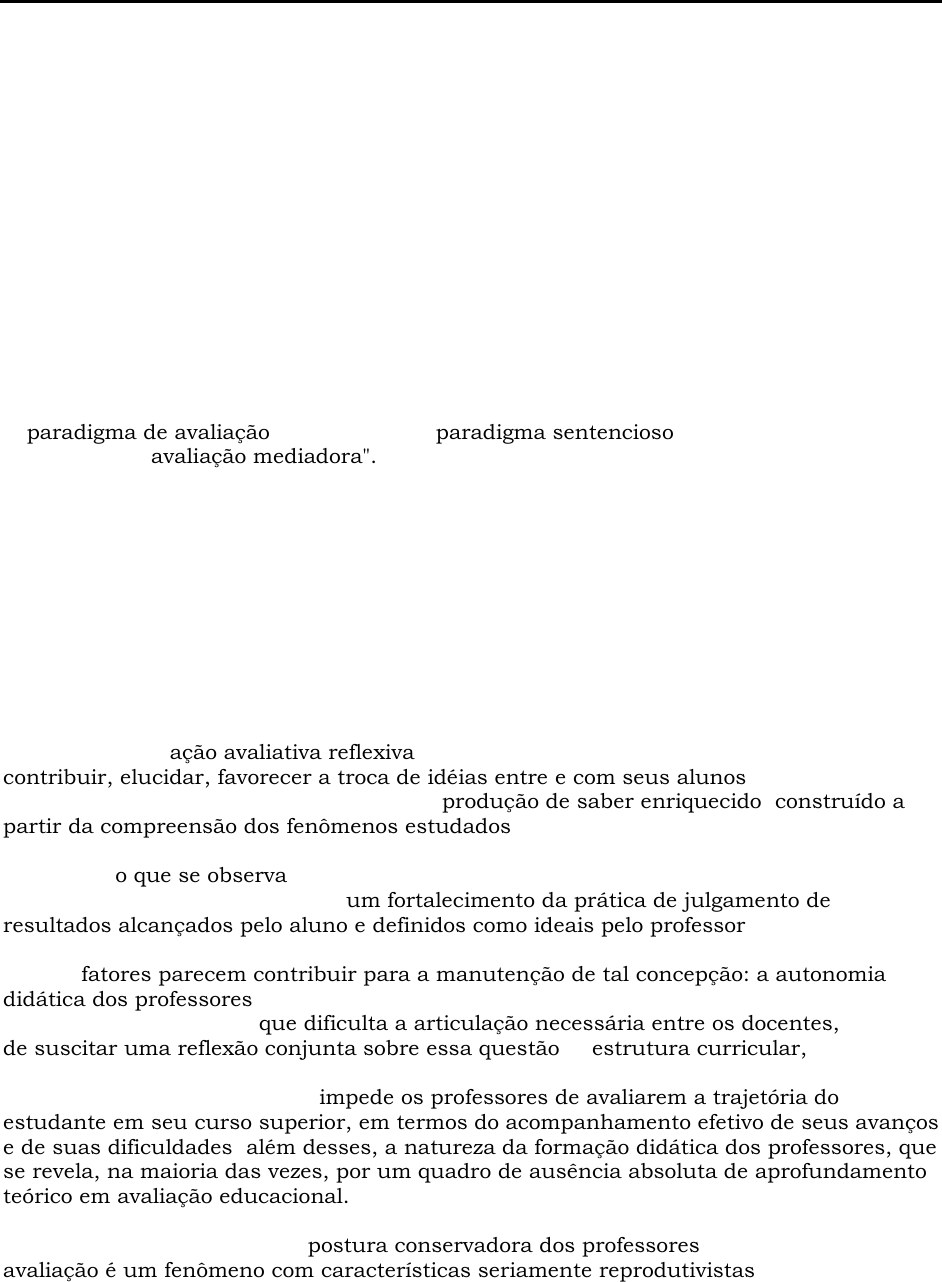 Jussara Maria Lerch Hoffmann(1) Avaliação Mediadora: Uma Relação Dialógica na Construção do Conhecimento O paradigma de avaliação que se opõe ao paradigma sentencioso, classificatório é o que denomino de "avaliação mediadora". "O que pretendo introduzir neste texto é a perspectiva da ação avaliativa como uma das mediações pela qual se encorajaria a reorganização do saber. Ação, movimento, provocação, na tentativa de reciprocidade intelectual entre os elementos da ação educativa. Professor e aluno buscando coordenar seus pontos de vista, trocando idéias, reorganizando-as. "(HOFFMANN, 1991, p. 67) Tal paradigma pretende opor-se ao modelo do "transmitir-verificar-registrar" e evoluir no sentido de uma ação avaliativa reflexiva e desafiadora do educador em termos de contribuir, elucidar, favorecer a troca de idéias entre e com seus alunos, num movimento de superação do saber transmitido a uma produção de saber enriquecido, construído a partir da compreensão dos fenômenos estudados. E, de fato, o que se observa na investigação da prática avaliativa dos três graus de ensino é, ao contrário de uma evolução, um fortalecimento da prática de julgamento de resultados alcançados pelo aluno e definidos como ideais pelo professor. Alguns fatores parecem contribuir para a manutenção de tal concepção: a autonomia didática dos professores, decorrente de suas especializações em determinadas disciplinas e/ou áreas de pesquisa, que dificulta a articulação necessária entre os docentes, a ponto de suscitar uma reflexão conjunta sobre essa questão; a estrutura curricular, por exemplo, do 39 Grau, com o regimento de matrícula por disciplinas que, desobrigando à seriação conjunta dos alunos, impede os professores de avaliarem a trajetória do estudante em seu curso superior, em termos do acompanhamento efetivo de seus avanços e de suas dificuldades; além desses, a natureza da formação didática dos professores, que se revela, na maioria das vezes, por um quadro de ausência absoluta de aprofundamento teórico em avaliação educacional. Tomando ainda mais grave a postura conservadora dos professores, observamos que a avaliação é um fenômeno com características seriamente reprodutivistas, ou seja, a (1) Professora-assistente da Universidade Federal do Rio Grande do Sul - UFRGS. 51 Jaqueline Tavares Realce Jaqueline Tavares Realce Jaqueline Tavares Realce Jaqueline Tavares Realce Jaqueline Tavares Realce Jaqueline Tavares Realce Jaqueline Tavares Realce Jaqueline Tavares Realce Jaqueline Tavares Realce Jaqueline Tavares Realce Jaqueline Tavares Realce Jaqueline Tavares Realce Jaqueline Tavares Realce Jaqueline Tavares Realce Jaqueline Tavares Realce Jaqueline Tavares Realce Jaqueline Tavares Realce Jaqueline Tavares Realce Jaqueline Tavares Realce Jaqueline Tavares Realce prática que se instala nos cursos de Magistério e Licenciatura é o modelo que vem a ser seguido no 1° e 2° Graus. Muito mais forte do que qualquer influência teórica que o aluno desses cursos possa sofrer, a prática vivida por ele enquanto estudante passa a ser modelo seguido quando professor. O que tal fenômeno provoca é, muitas vazes, a reprodução de práticas avaliativas ora permissivas (a partir de cursos de formação que raramente reprovam os estudantes), ora reprovativas (a partir de cursos, como os de Matemática, que apresentam abusivos índices de reprovação nas disciplinas). Muitos professores nem mesmo são conscientes da reprodução de um modelo, agindo sem questionamento, sem reflexão, a respeito do significado da avaliação na Escola. Aponto, então, algumas perguntas relacionadas à complexidade dessa questão: • Como superar o descrédito de muitos professores relativo a sua perspectiva de avaliação enquanto ação mediadora? • Quais serão as questões emergências na discussão dessa perspectiva, levando-se em conta a superficialidade da formação dos professores nessa área? • Em que medida prevalece uma visão de conhecimento positivista fortalecedora da concepção classificatória da avaliação? O que se pretende é refletir sobre as origens desse descrédito e sobre o impacto que tal postura pode causar nas relações que se estabelecem entre professor e aluno e em todas as estruturas do ensino. "Uma vez estabelecidos os procedimentos de avaliação, os instrumentos e as medidas, a atribuição de conceitos e sua aplicação, ou seja, as classificações segundo determinados padrões, passam (esses procedimentos) a ser vistos como atividades técnicas e neutras ao invés de formas interpretativas e expressivas das relações sociais que estão incorporadas dentro da própria idéia de avaliação." (BARBOSA et alii, p. 2) Considero reveladoras de tal postura de resistência dos professores algumas perguntas formuladas por eles em seminários e encontros para discussão do tema Avaliação. Algumas questões, repetidamente formuladas, serão ponto de partida dessa análise: • Não estaremos nós, professores, sendo responsabilizados pelo fracasso de alunos desinteressados e desatentos? • Como é possível alterar nossa prática, considerando o número de alunos com que trabalhamos e o reduzido tempo em que permanecemos com as turmas? • Não é necessário, nessa proposta, uma enorme disponibilidade do professor para atendimento aos alunos? 52 Jaqueline Tavares Realce Jaqueline Tavares Realce Jaqueline Tavares Realce Jaqueline Tavares Realce • Em que medida formaremos um profissional competente sem uma prática avaliativa exigente e classificatória (competitiva)? • Será possível alterar o paradigma da avaliação diante das exigências burocráticas do sistema? Não se deveria começar por alterá-las? Pretendo, inicialmente, analisar o conteúdo das perguntas que vêm sendo formuladas pelos professores e refletir sobre suas concepções. É preciso dizer que serão apontadas algumas hipóteses sobre concepções