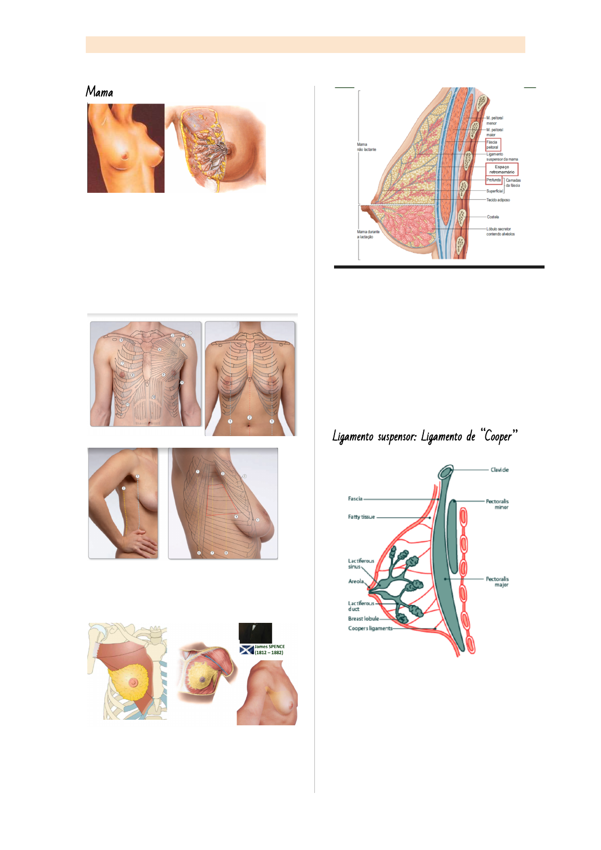 . Anatomia da Glândula Mamária . Leticia Lourenço Mama Localização Inicia na 2-3º espaço costal e vai até o 6º espaço; Medial-lateral: linha imaginária esternal; Lateral: 1ª linha axilar Processo axilar: ‘‘ Cauda axilar de Spence’’ Mama até a região axilar. Está situada acima dos músculos peitoral maior e menor; Observa-se a fáscia profunda da mama → espaço retromamário (permite a motilidade/mobilidade da mama) → fáscia do músculo peitoral. Ligamento suspensor: Ligamento de ‘‘Cooper’’ São ligamento fibroso que permite a fixação da glândula mamária e epiderme; . Anatomia da Glândula Mamária . Leticia Lourenço Em patologias pode causar a retração da mama (ligamentos suspensores de Cooper puxando a mama) Anatomia das Estruturas da Mama ● Aréola da Mama Tem 10-15 elevações (glândulas areolares) que aumentam a secreção de substâncias oleosas para a lubrificação durante a amamentação, também para auxiliar na pega do bebê, pois o óleo veda para que não engole ar. ● Papila Mamária Tem várias fissuras que permite a abertura dos ducto lactíferos para eliminação do leite; Composto por músculo liso (não contém glândulas, gordura e pêlos), se contrai durante a amamentação, contrai também o seio lactífero para expulsar o leite. Parênquima da Glândula Mamária O ligamento suspensor de Cooper faz a sustentação da mama, mas também divide a glândula em lóbulos: lobos→ lóbulos → ducto lactíferos → seio lactífero → papila mamária (fissuras). Locais em que não há lóbulos é preenchido por tecido adiposo; Esse tecido adiposo é o responsável pelas caraterísticas da mama, ou seja, mamas maiores, menores, mais caídas… . Anatomia da Glândula Mamária . Leticia Lourenço A diferença entre grávidas e não grávidas está em aumentos dos lóbulos para a produção do leite materno em resposta a hormônios. Irrigação É irrigado por artérias mamárias mediais e ramos perfurantes, artérias mamária laterais e perfurantes; a. subclávia → a. torácica interna → ramos intercostais → ramos mediais a. axilar → a. torácica interna → ramos laterais ↳ ramos intercostais posteriores⤴ Drenagem venosa Plexo venoso superficial → veia torácica lateral → artéria axilar Plexo venoso profundo → veias intercostais anteriores → v. torácica interna → v. braquiocefálica Mamas: Quadrantes 4 quadrantes; a maior incidência de câncer de mama é no quadrante superior lateral. Drenagem linfática Linfonodos axilares drenam a maior parte e são encontrados na região lateral da mama e apical; . Anatomia da Glândula Mamária . Leticia Lourenço Linfonodos interpertoriaria drenam a glândula superiormente face posterior e joga para o linfonodos axilares; Linfonodos paraesternais que drena a porção medial e joga para o linfonodos cervicais. Classificação Clínica Delimitação pelo músculo peitoral menor: Nível 1 - lateral e abaixo do músculo → axilares Nível 2- acima e abaixo do músculo → axilares e interpeitorais Nível 3- medial ao músculo → paraesternais Inervação Nervo cutâneo medial (origem do ramo intercostal anterior) e nervo cutâneo posterior (r. intercostal posterior); Nervo supraclavicular e Nervo intercostobraquial. Prótese Mamária Politelia Mastectomia . Anatomia da Glândula Mamária . Leticia Lourenço Lesão do nervo torácico longo Linfonodo Sentinela