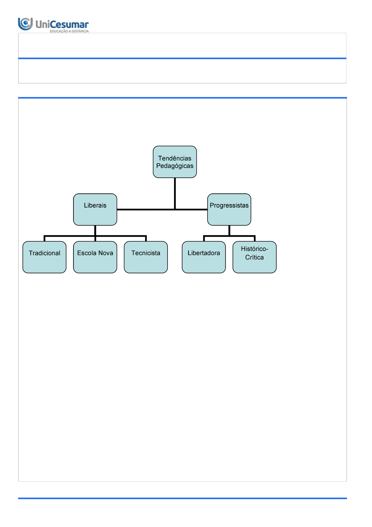 08/07/2021 Unicesumar - Ensino a Distância 1/6 PREPARE-SE - 2021 - MAT - CARACTERÍSTICA DAS TENDÊNCIAS PEDAGÓGICAS SOB O OLHAR DA DIDÁTICA Período:14/06/2021 09:00 a 28/06/2021 23:59 (Horário de Brasília) Status:ENCERRADO Gabarito:Gabarito será liberado no dia 29/06/2021 00:00 (Horário de Brasília) 1ª QUESTÃO O estudo das Tendências Pedagógicas possui o objetivo de compreender as dimensões educacional e políticas que estão implícitas nas propostas pedagógicas das instituições educacionais. Neste sentido, se torna essencial compreender as Tendências Pedagógicas, as quais são organizadas em dois grupos, sendo: grupo liberal e o grupo progressista. Cada grupo possui as suas tendências, conforme a organização da figura abaixo: MENDONÇA, Camila Tecla Mortean; CORDEIRO, Suzi Maria Nunes. Didática. Maringá - PR, Unicesumar, 2019. Neste sentido, a partir deste contexto, leia as afirmativas e assinale a alternativa correta. I – A Tendência Pedagógica Escola Nova pertence ao grupo das Tendências Liberais. Foi marcada por amplamente pelo papel do professor: aquele que propicia condições para que o processo de aprendizagem dos alunos aconteça. II – A Tendência Pedagógica Libertadora pertence ao grupo das Tendências Progressista. Possui como sua maior característica a relação horizontalizada entre professores e alunos. III – A Tendência Pedagógica Escola Nova propicia que os alunos, por meio do processo de ensino e de aprendizagem, modifiquem a forma como percebem a realidade. Este processo é possível, pois o professor é o facilitador do processo de ensino e de aprendizagem. IV – Na Tendência Escola Nova o professor e os alunos seguem as orientações do plano de aula, desta forma, o foco do processo de ensino e de aprendizagem é a técnica, ou seja, a forma como se ensina e se aprende. Está correto o que se afirma em: ALTERNATIVAS 08/07/2021 Unicesumar - Ensino a Distância 2/6 I, II e III apenas. I, III e IV apenas. II, III e IV apenas. I, II e IV apenas I, II, III e IV. 2ª QUESTÃO Observe as Tendências Pedagógicas do grupo Progressista: MENDONÇA, Camila Tecla Mortean; CORDEIRO, Suzi Maria Nunes. Didática. Maringá - PR, Unicesumar, 2019. O grupo progressista possui duas Tendências Pedagógicas, cada uma com suas características e com a teoria que subsidia a ação pedagógica. Neste sentido, leia e analise as afirmativas que seguem em relação a Tendência Pedagógica Libertadora: I - A Tendência Libertadora possui a sua base teórica nas ideias de Paulo Freire, um grande educador que ganhou destaque internacional devido ao seu método que revolucionou o processo de ensino dos jovens e adultos. II – A Tendência Libertadora possui sua base na psicologia behaviorista de Burrhus Frederic Skinner, a qual buscava ensinar o aluno por meio do treinamento. III - Nesta Tendência Pedagógica entende-se que a educação consiste em um ato político, pois por meio do conhecimento é possível a construção de uma sociedade mais justa, livre, humana, ética e solidária. IV - A pedagogia de Paulo Freire, como ficou conhecida, possui o ensino baseado na realidade social dos alunos, desta forma, tanto professores quanto alunos analisam os problemas frente a realidade da sociedade, da economia, da cultura da comunidade local. Está correto o que se afirma em: ALTERNATIVAS 08/07/2021 Unicesumar - Ensino a Distância 3/6 I e II, apenas I e III, apenas III e IV, apenas I, III e IV, apenas II, III e IV, apenas 3ª QUESTÃO A tendência pedagógica Tecnicista surgiu no Brasil por volta da década de 1950, mas foi se consolidar somente por volta da dácada de 1960. Esta tendência estava: Inspiradas nas ideias de Augusto Comte (1798-1857) e sua teoria positivista, além da psicologia americana behaviorista de Burrhus Frederic Skinner (19041990), a tendência buscava ensinar o aluno por meio do treinamento. Dentre os princípios do positivismo, destacamos: “a sociedade humana é regulada por leis naturais, ou por leis que tem todas as características das leis naturais, invariáveis, independentes da vontade e da ação humana” (LÖWY, 2007, p. 36). MENDONÇA, Camila Tecla Mortean; CORDEIRO, Suzi Maria Nunes. Didática. Maringá - PR, Unicesumar, 2019. Partindo deste contexto, leia as afirmativas que seguem: I – A tendência tecnicista visa a descoberta individual dos alunos, a sua curiosidade e o interesse espontâneo. II – A tendência tecnicista buscou organizar racionalmente o trabalho pedagógico. III – Buscaram-se técnicos e especialistas, em sua maioria americana, para a formulação de instruções. IV – O controle de todo o processo educativo na tendência tecnicista era realizado por meio de questionários. Está correto o que se afirma em: ALTERNATIVAS II e III, apenas III e IV apenas. I, II e III apenas. II, III e IV apenas. I, II, III e IV. 4ª QUESTÃO 08/07/2021 Unicesumar - Ensino a Distância 4/6 Leia o excerto abaixo: A Tendência Pedagógica Histórico-Crítica possui como base teórica o materialismo histórico dialético de Karl Marx (1818-1889) e Friedrich Engels (1820-1895), com afinidades relacionadas a psicologia histórico-cultural, que possui como principal autor Lev Vygotsky (1896-1934). MENDONÇA, Camila Tecla Mortean; CORDEIRO, Suzi Maria Nunes. Didática. Maringá - PR, Unicesumar, 2019. Levando em consideração o contexto acima, avalie as asserções a seguir e a relação proposta entre elas. I – O objetivo da tendência pedagógica histórico-crítica é resgatar a importância da escola e reorganizar o processo educativo, ressaltando assim o conhecimento sistematizado. PORQUE II – É por meio do processo educativo que a escola assume o seu papel e sua responsabilidade de formar cidadãos críticos, reflexivos, participantes e conscientes. A respeito dessas asserções, assinale a opção correta. ALTERNATIVAS As asserções I e II são proposições verdadeiras e a II é uma justificativa corret