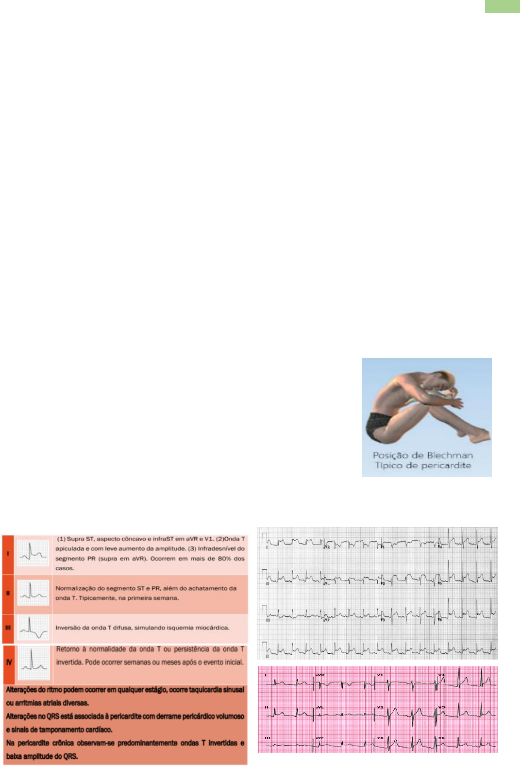 1 MEDICINA DE EMERGÊNCIA Laura Borges PERICARDITE AGUDA E TAMPONAMENTO CARDÍACO PERICÁRDIO: É um saco fibroelástico formado por camadas viscerais e parietais separadas por um espaço (potencial), a cavidade pericárdica o Comporta de 15 a 50ml de um ultrafiltrado de plasma Doenças: o Pericardite aguda e recorrente o Derrame pericárdico sem grande comprometimento hemodinâmico o Tamponamento cardíaco o Pericardite constritiva PERICARDITE: Definições: o Inflamação do saco pericárdico o Pode acometer o miocárdio Miopericardite ou Perimiocardite – vai ter elevação das enzimas cardíacas (Troponina e CKMB) e pode ser comportar como uma Insuficiência cardíaca Etiologia: o Em países desenvolvidos a maioria dos casos é considerada de origem viral possível ou confirmada, embora a etiologia exata da maioria dos casos permaneça indeterminada após uma abordagem diagnóstica tradicional o Em países em desenvolvimento pensar em HIV e Tuberculose (se suspeitar pedir PPD ou Interferon- gama) Clínica: o Variedade de sinais e sintomas inespecíficos o Dor torácica aguda e pleurítica que melhora ao sentar-se e inclinar-se para frente (Posição de Blechman) o Pacientes com etiologia infecciosa febre e leucocitose o Precedida por sintomas respiratórios ou gastrintestinais semelhantes aos da gripe o Sinais ou sintomas específicos de sua doença subjacente como Neoplasia ou Doença Autoimune o Ausculta cardíaca: é específica, presença de atrito pericárdico intermitente Paciente com o tronco inclinado para frente na borda esternal esquerda ECG: 2 MEDICINA DE EMERGÊNCIA Laura Borges o Nem sempre resulta nessas alterações típicas o Alterações atípicas no ECG são vistas em 40% dos pacientes o Significado: inflamação do epicárdio o Pericardite urêmica (deposição proeminente de fibrina, mas pouca ou nenhuma inflamação) geralmente não mostra nenhuma das alterações associadas a pericardite o Arritmias sustentadas são incomuns na pericardite aguda, exceto no cenário pós-toracotomia o A presença de arritmias atriais ou ventriculares é sugestiva de miocardite concomitante ou de uma doença cardíaca não relacionada Avaliação inicial em casos suspeitos: o ECG o Radiografia de Tórax: É geralmente normal em pacientes com pericardite aguda Embora os pacientes com derrame pericárdio substancial possam exibir uma silhueta cardíaca aumentada com campos pulmonares claros, esse achado é incomum na pericardite aguda, pois pelo menos 200ml de líquido pericárdio devem se acumular antes que a silhueta cardíaca aumente No entanto, a pericardite aguda deve ser considerada na avaliação de um paciente com cardiomegalia nova e inexplicada o Hemograma completo, nível de Troponina, VHS e PCR Pode ter aumento dos biomarcadors séricos de lesão miocárdica como troponina I ou T indicando uma Miopericardite o Ecocardiograma: mesmo um pequeno derrame pode ser útil para confirmar o diagnóstico de pericardite, embora a ausência de um derrame não exclua o diagnóstico Costuma ser normal em pacientes com síndrome clínica de pericardite aguda, a menos que haja um derrame pericárdio associado Embora o achado de derrame pericárdico em paciente com pericardite conhecida ou suspeita apoie o diagnóstico, a ausência de derrame pericárdio ou outras anormalidades ecocardiográfica não o exclui Derrames pericárdicos grandes e/ou hemodinamicamente significativos são raros como apresentação inicial de pericardite aguda o POCUS – importante para identificar um derrame pericárdico associado, principalmente em pacientes instáveis Testes adicionais: o Hemoculturas se houver febre > 38°C, sinais de sepse ou infecção bacteriana concomitante e documentada (ex: pneumonia) o Estudos virais não são obtidos rotineiramente, uma vez que o rendimento é baixo e o manejo não é alterado para a grande maioria dos pacientes o FAN em casos selecionados (por exemplo em mulheres jovens, especialmente aquelas em que a história sugere um distúrbio reumatológico) o Teste cutâneo de tuberculina ou ensaio de liberação de interferon-gama, se não realizado recentemente (pensando em Tuberculose) Outros exames de imagem: o Tomografia de Tórax: Pode ser útil para confirmar o diagnóstico e avaliar doenças pleuropulmonares concomitantes e linfadenopatias, sugerindo assim uma possível etiologia de pericardite (isto é, tuberculose, câncer de pulmão) O espessamento pericárdico não calcificado com derrame pericárdico é sugestivo de pericardite aguda. Além disso, com a administração de meio de contraste iodado, o realce 3 MEDICINA DE EMERGÊNCIA Laura Borges das superfícies visceral e parietal espessadas do saco pericárdio confirma a presença de inflamação ativa o Ressonância magnética cardíaca: Fornece uma avaliação útil da inflamação pericárdica, uma vez que o pericárdio inflamado é brilhante e espessado na imagem ponderada em T2 (edema) e realçado após a injeção de contraste (realce tardio com gadolínio) Miocardite o A evidência de inflamação pericárdica com TC ou RMC é um achado de suporte para o diagnóstico de pericardite em casos duvidosos (por exemplo: apresentação atípica, dor torácica sem elevação de PCR ou outra evidência objetiva da doença) Indicações para avaliação invasiva em Pericardite aguda: Diagnóstico: o 2 dos seguintes critérios: Dor torácica típica (aguda e pleurítica, melhora ao sentar-se e inclinar-se para frente) Atrito pericárdico Mudanças sugestivas no ECG (normalmente elevação generalizada do Segmento ST) Derrame pericárdico novo ou piorando Tratamento: o Objetivos: Alívio da dor Resolução da inflamação (e, se houve, do derrame pericárdico) Prevenção de recorrência o Quando internar? Pacientes de maior risco: Febre > 38°C Curso subagudo ao longo de dias a semanas (sem início agudo de dor torácica) Evidências que sugerem tamponamento cardíaco Derrame pericárdio moderado a grande (>20mm) 