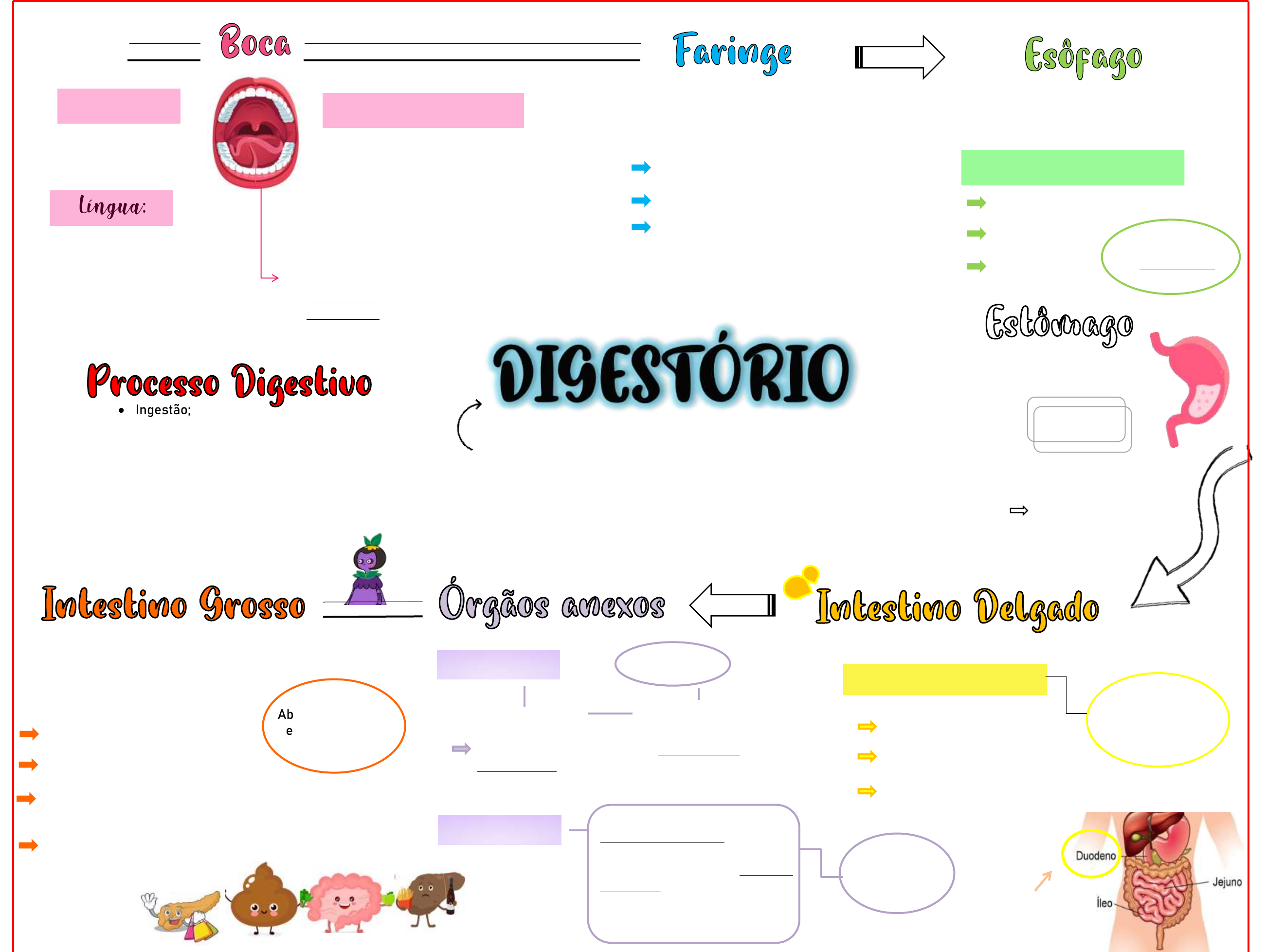 Língua: Responsável por obter do alimento ingerido os nutrientes necessários para o organismo. É dividido em tubo digestório e órgãos digestórios anexos. Entrada de alimento, onde é mastigado pelo dente, preparado pela língua e umedecido pela saliva. É dividido em: Palato duro Palato mole Parótidas, submandibulares e sublinguais, secretam saliva e possuem enzimas amilase e lipase salivar. Movimenta o alimento, e em sua porção dorsal se encontra as papilas filiformes, fungiformes e valadas. Dente: Encaixa-se nos alvéolos, sendo classificadas por sua forma e função. Sistema Criado por: Ana Keyla Glândulas salivares: Responsável pela passagem do alimento da boca para o estômago. Divide-se: Parte nasal – nasofaringe Parte oral – orofaringe Parte laríngea – laringofaringe Tubo muscular que empurra o alimento deglutido para o estômago. Cervical Torácica Abdominal. Movimentos Peristálticos Local de armazenamento temporário do alimento. Digestão das proteínas pela enzima pepsina. Quimo pH ácido Ingestão; Propulsão (deglutição e peristalse); Decomposição mecânica; Digestão Absorção; Defecação. Regiões: Cárdia; Fundo; Corpo; Antro-Pilórica; Pilórica. UNE-SE AO ESTÔMAGO NO ÓSTIO CÁRDICO PARTE INICIAL DO INTESTINO DELGADO. SECRETA A BILE. Tubo retorcido que absorve grande parte dos nutrientes. Projeções: Pregas circulares Vilosidades Microvilosidades. Ajudam na decomposição e absorção dos nutrientes. Último órgão do tubo digestório, O material que chega até ele é um resíduo altamente digerido que contém poucos nutrientes. Absorção de água e sais minerais Divide-se: Ceco Apêndice – expansão do ceco, Colo – Transverso; Ascendente; Descendente, Reto – armazena e elimina fezes. Fígado Produz Bile Vesícula Biliar Armazenado Possui duas faces: Visceral e diagramática, sendo a maior e mais volumosa glândula do organismo. Pâncreas É ao mesmo tempo uma Glândula exócrina (secreta dois hormônios: insulina e glucagon); e uma Glândula endócrina (produz a maioria das enzimas que digerem os alimentos no intestino delgado). Regulador de glicose no sangue.