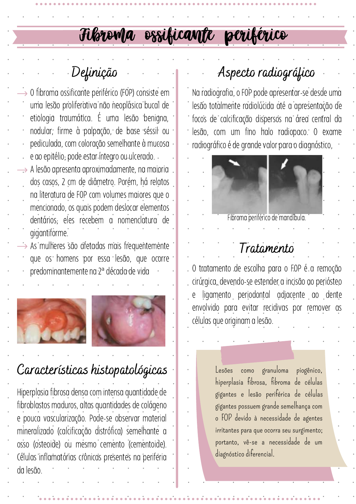 Definição O fibroma ossificante periférico (FOP) consiste em uma lesão proliferativa não neoplásica bucal de etiologia traumática. É uma lesão benigna, nodular, firme à palpação, de base séssil ou pediculada, com coloração semelhante à mucosa e ao epitélio; pode estar íntegro ou ulcerado. A lesão apresenta aproximadamente, na maioria dos casos, 2 cm de diâmetro. Porém, há relatos na literatura de FOP com volumes maiores que o mencionado, os quais podem deslocar elementos dentários; eles recebem a nomenclatura de gigantiforme. As mulheres são afetadas mais frequentemente que os homens por essa lesão, que ocorre predominantemente na 2ª década de vida Fibroma ossificante periférico Características histopatológicas Hiperplasia fibrosa densa com intensa quantidade de fibroblastos maduros, altas quantidades de colágeno e pouca vascularização. Pode-se observar material mineralizado (calcificação distrófica) semelhante a osso (osteoide) ou mesmo cemento (cementoide). Células inflamatórias crônicas presentes na periferia da lesão. Aspecto radiográfico Na radiografia, o FOP pode apresentar-se desde uma lesão totalmente radiolúcida até a apresentação de focos de calcificação dispersos na área central da lesão, com um fino halo radiopaco. O exame radiográfico é de grande valor para o diagnóstico, Fibroma periférico de mandíbula. Tratamento O tratamento de escolha para o FOP é a remoção cirúrgica, devendo-se estender a incisão ao periósteo e ligamento periodontal adjacente ao dente envolvido para evitar recidivas por remover as células que originam a lesão. Lesões como granuloma piogênico, hiperplasia fibrosa, fibroma de células gigantes e lesão periférica de células gigantes possuem grande semelhança com o FOP devido à necessidade de agentes irritantes para que ocorra seu surgimento; portanto, vê-se a necessidade de um diagnóstico diferencial.