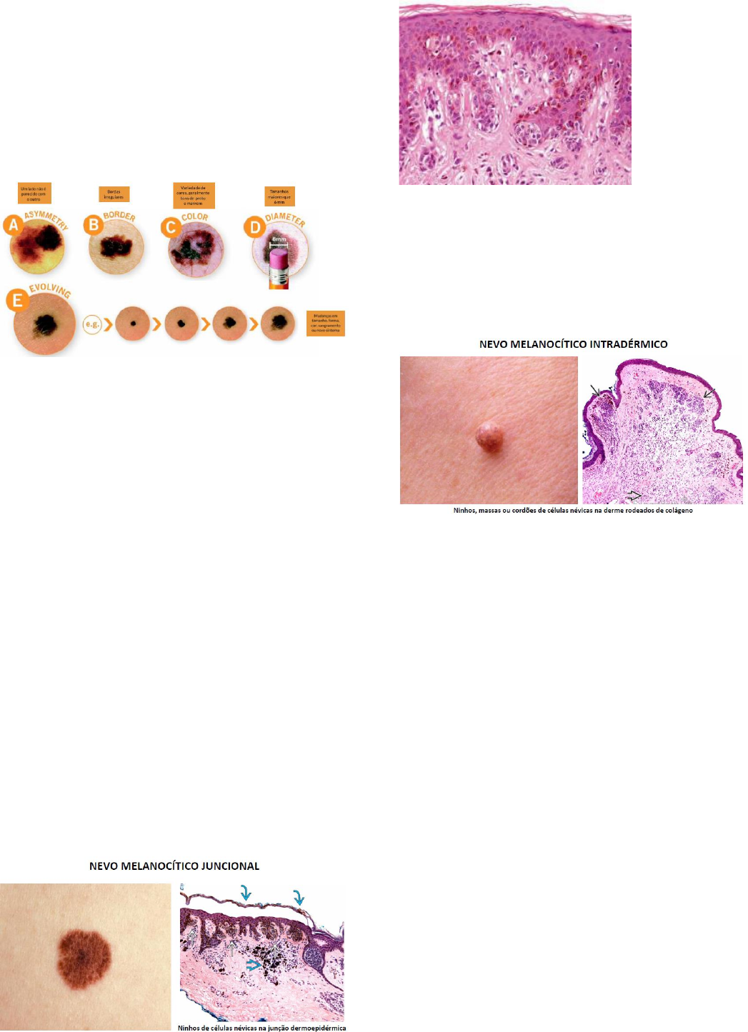 NEOPLASIAS MELANOCÍTICAS - ascensão pagetoide: é quando os melanócitos sobem para outras camadas que não a camada basal - proliferação lentiginosa: grande quantidade de melanocitos na camada basal Lesão melanocítica - analisar ABCDE. Nevos melanocíticos e células névicas - células névicas: células derivadas de melanócitos, pigmentadas ou capazes de formar pigmento (DOPA-positivas) - nevos melanocíticos: regiões sólidas, castanhas a marrons, uniformemente pigmentadas, pequenas (geralmente < 6mm de largura), da pele relativamente achatada (máculas) a elevadas (pápulas) com bordas arredondadas bem definidas NEVOS “BANAIS” 1) nevo melanocítico juncional - é benigno - quando tem ninhos de celular nevicas na junção dermoepidermica. - os nevos geralmente ficam concentrados no topo das papilas dérmicas - manifestações clínicas: lesão mais macular - na microscopia: crista epidérmica com nevos em seu topo. 2) nevo melanocítico intradérmico - proliferação de células nevicas dentro da derme - manifestação clínica: lesão mais nodular/papular - maturação das células: • A: epiderme com melanocitos na camada basal • B: nevo melanocitico juncional (células nevicas sem prolongamentos e se reúnem em grupos na crista epidérmica • C: células nevicas pulam para a derme (não é invasão). Tem componente juncional e intradermico → nevo melanocitico composto • D: grupos do nevo juncional somem e ficam só o nevo intradermico → so vai ter amadurecimento do nevos (A→ B → C) • E: predomínio das células do tipo C. nevo já está neurotizado - geralmente é visto em criança e adolescentes - na região mais superficial tem células epitelioides → grupos de células mais coesos e com mais citoplasma. • Células tipo A: células epitelioides • Células tipo B: células com aspecto de linfócitos (sem citoplasma) • Células tipo C: células fusifomes → célula neural • O amadurecimento das células A → B → C significa benignidade 3) nevo melanocitico composto - tem o componente juncional (região mais macular) e o componente intradermico (lesão fica mais elevada) NEVO AZUL - lesão simétrica, papular, com bordas regulares, coloração homogênea e não apresenta mais de 6 mm. - caracterizada por grande quantidade de melanina, que estão tanto de melanocitos quanto de macrófagos (melanofagos → que digerem melanina) - na microscopia também consegue ver que é simetria → benigna - no maior aumento: NEVO HALO - halo branco ao redor de um nevo banal - halo = infiltrado de linfócitos e de histiocitos na derme - associado à nevo, mas pode acontecer com outras lesões de pele também NEVO DISPLASICO OU NEVO DE CLARK - maiores que a maioria dos nevos adquiridos (geralmente > 5mm de largura) - esporádico: menos risco de evolução para melanoma - síndrome do nevo displasico: numerosos nevos displásicos – maior risco de evolução para melanoma - características histológicas de nevo displasico: • Nevo composto com atipias celulares • Hiperplasia epidérmica • Infiltrado inflamatório mononuclear • Fibrose dérmica (fibroplasia) - progressão de um tumor em nevos displasicos: • A: pele normal • B: melanocitos viram células nevicas que começam a se proliferar mas sem acompanhar a crista epidérmica • C: união das cristas epidérmicas, podendo ver atipias. Nevo displasico composto (intraepidérmico e juncional) • D: mutções de células, atipias, ascensão pagetoide → melanoma invasor • E: melanoma invasor (invasão angiolinfática) MELANOMA - Nível de Clark: é a profundidade de melanoma na pele - medida de Breslow: medida de profundidade do melanoma. Medida em mm. > 7mm pode ser metastatico - fase de crescimento: • Radial: crescimento horizontal (para os lados) o Clark I e II • Vertical: crescimento em profundidade o Clark III, IV, V - tipos de melanomas: • Lentigos maligno ou lentigo maligno melanoma: melanoma que dá em pele fotoexposta. A diferença entre eles é que o lentigo maligno é um melanoma in situ e que ocorre em pele fotoexposta enquanto que o lentigo maligno melanoma é invasor da pele fotoexposta • Melanoma extensivo superficial: pode ser in situ ou invasor e é de área não exposta. Geralmente tem crescimento mais radial • Melanoma acral lentiginoso: acontece el palma da mao ou palma do pé e é lentiginoso. É quando tem proliferação de melanoma atípico na camada basal. Geralmente acomete maior população negra • Melanoma nodular: lesão nodular com áreas de necrose, ulceração e hemoragia - na histologia: - ninhos de tamanhos diferentes, células isoladas, ascensão pagetoide. No maior aumento: ninho na crista, mas também tem no alto da papila dérmica. - derme toda comprometida. No maior aumento tem células pleiomorficas. Núcleos com diferentes tamanhos e cores diferentes. Nucléolos mais evidentes e mais eosinofilicos (nucléolo em cereja → caracteristica de um melanoma). Padrão epitelioide do melanoma, pois tem grande quantidade de citoplasma e são muito grudadas umas nas outras (muita coesão). - fatores prognósticos de melanoma: • Nível de Clark • Breslow • Ulceração: vasos ficam mais suscetíveis à infecção ou células neoplásicas entrarem nos vasos e levarem metástases • Infiltração linfocitária tumoral: menos pior o prognostico. Linfócitos identificam as células neoplásicas, o que é bom. • Áreas de regressão (ausência ou redução do número de melanocitos malignos + infiltrado inflamatório mononuclear): sinal de pior prognostico. • Número de mitoses • Invasão angiolinfáticas e perineural: maior chance de recidiva no local da lesão