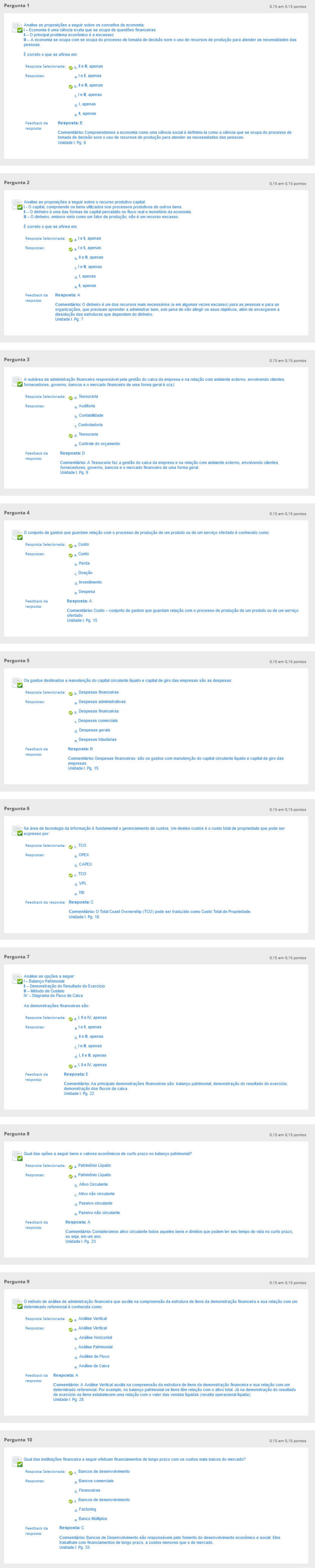 Pergunta 1 0,15 - 0,15 pontos Anaíse as proposições a seguir sobre os conceitos de I- Economia é uma ciência exata que se ocupa de questões financeiras 1- 0 principal problema económico é a escassez - A economia se ocupa com se ocupa do processo de tomada de decisão sore o uso de recursos de produção para atender as necessidades das pessoas. É correto o que se afirma em: economia: Resposta Selecionada: ^ bIeI, apenas a lei, apenas ^ b.Ie , apenas c Iel, apenas a. I, apenas eI, apenas Resposta:BFeedback da Comentário:Compreendemos a economia como uma ciência social é definimo-la como a ciência que se ocupa do processo de tomada de decisão sore o uso de recursos de produção para atender UnidadeI. Pg. 6 necessidades das pessoas. Pergunta 2 0.15 - 0,15 pontos Analise as proposições a seguir sobre o recurso produtivo capital: I - O capital, compreende os bens utilizados nos processos produtivos de outros bens. 1- 0 dinheiro é uma das formas de capital percebido no fluxo real e monetário da economia. - 0 dinheiro, embora visto como um fator de produção, não é um recurso escasso. É correto o que se afirma em: Resposta Selecionada: ^ a IeI, apenas ^ a.lel, apenas b Ie , apenas cl ei, apenas a.I, apenas eI, apenas Feedback da Resposta: A resposta: Comentário:O dinheiro é um dos recursos mais necessários (e em algumas vezes escasso) para as pessoas e para as organizações, que precisam aprender a administrar bem, sob pena de não atingir os seus objetivos, além de enxergarem a dissolução das estruturas que dependem do dinheiro. UnidadeI. Pg. 7 Pergunta 3 0,15 - 0,15 pontos A subárea da administração financeira responsável pela gestão do caixa da empresa e na relação fornecedores, governo, bancos e o mercado financeiro de uma forma geral é o(a): ambiente externo, envolvendo cientes, Resposta Selecionada: ^ d Tesouraria a Auditoria b Contabidade c Controladoria TesourariaO d- e Controle do orçamento Resposta:DFeedback da resposta: Comentário: A Tesouraria faz a gestão do caixa da empresa e na relê fornecedores, governo, bancos e o mercado financeiro de uma forma ç UnidadeI. Pg. 9 ambiente externo, envolvendo cientes, Pergunta 4 0,15. 0.15 pontos ^ O conjunto de gastos que guardam relação com o processo de produção de Resposta Selecionada: ^ a Custo ^ a Custo b Perda c Doação produto ou de um serviço ofertado é conhecido como: d Investimento e Despesa Resposta: AFeedback da Comentário:Custo- conjunto de gastos que guardam relação com o processo de produção de ofertado UnidadeI. Pg. 15 produto ou de ; serviço Pergunta 5 0.15 - 0,15 pontos Os gastos destinados a manutenção do capital circulante fcquido e capital de giro das empresas são as despesas: Resposta Selecionada: ^ b Despesas financeiras a Despesas administrativas ^ b Despesas financeiras c Despesas comerciais d Despesas gerais e Despesas tributárias Resposta:BFeedback da Comentário:Despesas financeiras: são os gastos com manutenção do capital circulante Équido e capital de giro das empresas. UnidadeI. Pg. 15 Pergunta 6 0.15 - 0,15 pontos - Na área de tecnologia da informação é fundamental o gerenciamento de custos. Um destes custos é o custo total de propriedade que pode Q expresso por: Resposta Selecionada: ^ c TCO a OPEX b CAPEX O c. TC0 d.VPL e. TIR Feedback da resposta: Resposta:C Comentário:O Total Coast Ownership (TCO) pode ser traduzido como Custo Total de Propriedade. UnidadeI. Pg. 18 Pergunta 7 0.15 - 0,15 pontos Analise as opções a seguir: QI- Balanço Patrimonial I- Demonstração do Resultado do Exercício - Método de Custeio IV - Diagrama do Fluxo de Caixa As demonstrações financeiras são: Resposta Selecionada: ^ e I,IeIV, apenas a leI, apenas bIei, apenas c I eI, apenas d I,Ie H. apenas ^ e I, e IV, apenas Resposta: EFeedback da Comentário:As principais demonstrações financeiras são: balanço patrimonial; demonstração do resultado do exercício; demonstr UnidadeI. dos fluxos de caixa. 22 Pergunta 8 0.15 - 0,15 pontos Qual das opões a seguir bens e valores económicos de curto prazo no balanço patrimonial? Resposta Selecionada: ^ a Património Liquido ^ a Património Liquido b Ativo Circulante c Ativo não circulante d Passivo circulante e Passivo não circulante Resposta: AFeedback da Comentário:Consideramos ativo circulante todos aqueles bens e direitos que podem ter seu tempo de vida no curto prazo, ou seja, em um ano. UnidadeI. Pg. 23 Pergunta 9 0,15 - 0,15 pontos • O método de análise de administração financeira que auxia na compreensão da estrutura de itens da demonstração financeira e sua relação com um Qdeterminado referencial é conhecida como: Resposta Selecionada: ^ a Análise Vertical ^ 3 Análise Vertical b Análise Horizontal c Anáíse Patrimonial d Análise de Fluxo e Análise de Caixa Feedback da Resposta: A resposta: Comentário:A AnáSse Vertical auxfta na compreensão da estrutura de itens da demonstração determinado referencial. Por exemplo, no balanço patrimonial os itens têm relação com o ativo tot de exercício os itens estabelecem uma relação com o valor das vendas fquídas (i UnidadeI. Pg. 28 financeira e sua rela al. Já na demonstraç receita operacional fcquida). i com um io resultado Pergunta 10 0,15 - 0.15 pontos Qual das instituições financeira a seguir efetuam financiamentos de longo prazo com os custos mais baixos do mercado?m Resposta Selecionada: ^ c Bancos de desenvolvimento 3 Bancos comerciais b Financeiras ^ c Bancos de desenvolvimento d Factoring e Banco Múltiplos Resposta:CFeedback da Comentário:Bancos de Desenvolvimento são responsáveis pelo fomento do desenvolvimento económico e social. Eles trabalham com financiamentos de longo prazo, a custos menores que o de mercado. UnidadeI. Pg. 33