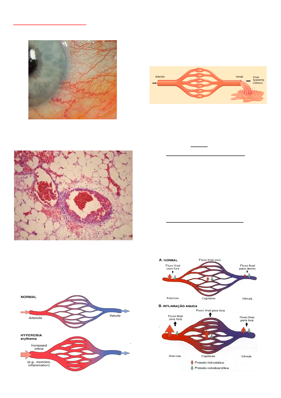 1 DISTÚRBIOS CIRCULATÓRIOS HIPEREMIA MACROSCOPICAMENTE: evidenciação dos vasos sanguíneos do local; podem ser vermelhos escuros (sangue venoso) ou claro (sangue arterial). MICROSCOPICAMENTE: vasos sanguíneos bastante dilatados e muito preenchidos com hemácias (geralmente as hemácias são removidas durante o processamento histológico, só aparecem se houver muito sangue no vaso - hiperemia). - HIPEREMIA ATIVA Gasto de energia para produzir um fenômeno que culmine na vasodilatação com o objetivo de ter mais espaço para receber sangue (já que houve um aumento do fluxo sanguíneo) - vasodilata por meio de substâncias pró-inflamatórias ou aminas vasoativas (histaminas - mastócitos). Mais sangue chega e mais pressão ele faz → aumento da pressão hidrostática (pressão sobre as paredes) → extravasamento de líquidos, pressão oncótica permanece igual → sai mais líquido e retorna a mesma coisa que na condição normal = desequilíbrio hemodinâmico = edema. 1. HIPEREMIA ATIVA FISIOLÓGICA: ligada a processos/reflexos naturais: aumento da circulação ao redor do cérebro na leitura; aumento da circulação para oxigenar os músculos durante atividade física; aumento da circulação nas mamas durante a lactação para produzir mais leite; aumento da circulação no trato gastrointestinal na digestão → aumento do metabolismo e vergonha: rosto corado. 2. HIPEREMIA ATIVA PATOLÓGICA: casos de inflamação: recrutamento de leucócitos através do sangue → vasodilatação: mediadores químicos da inflamação → prostaglandinas e mastócitos liberando histaminas. 2 Na segunda imagem é possível notar uma hiperemia devido a gengivite. Estômago normal. Estômago com gastrite: mucosa/pregas espessas (acúmulo de líquido - hiperemia), tecido mais avermelhado (mais sangue), mais brilhoso (acúmulo de água faz brilhar na fotografia). MICROSCOPICAMENTE: vasos dilatados e preenchidos por hemácias. - HIPEREMIA PASSIVA Fenômeno que restringe o retorno de sangue: aumento do volume sanguíneo por obstrução → células de câncer, cicatrização do vaso, aterosclerose. → Aumento da pressão hidrostática gera edema. → Chamado também de congestão venosa. 1. HIPEREMIA PASSIVA LOCAL Vaso pulmonar com obstrução devido a células de câncer. 3 2. HIPEREMIA PASSIVA POR INSUFICIÊNCIA CARDÍACA 2.1. HIPEREMIA PASSIVA PULMONAR Pulmão com aspecto vermelho escuro - aspecto hepatizado - fibrose pulmonar. Congestão pulmonar - vasos repletos de hemácias. 2.2. HIPEREMIA GENERALIZADA Fígado necrosado devido à hiperemia generalizada - fígado em “noz moscada”.