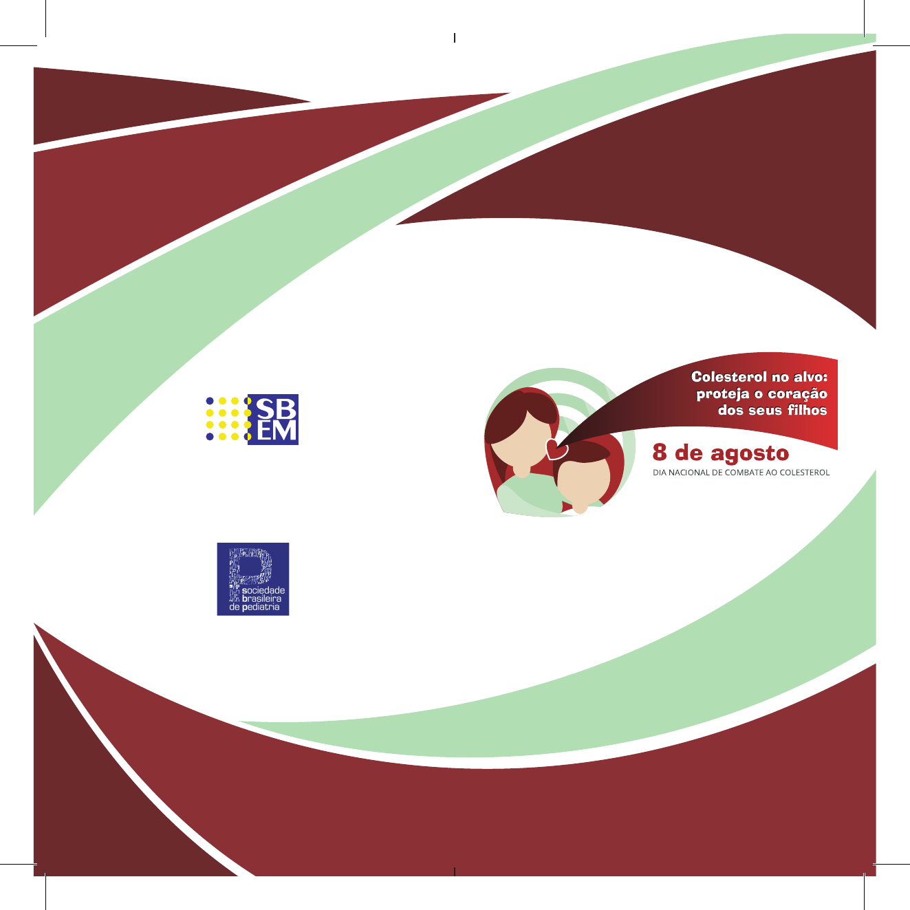 Sociedade Brasileira de Endocrinologia e Metabologia Departamento de Dislipidemia e Aterosclerose www.endocrino.org.br www.sbp.com.br Departamento Científico de Endocrinologia Quando dosar o COLESTEROL DO SEU FILHO? QUAIS SÃO AS CAUSAS DE COLESTEROL ALTO NA INFÂNCIA E NA ADOLESCÊNCIA? A principal causa de colesterol alto é a alimentação rica em gorduras, o excesso de peso e o sedentarismo. Entretanto, algumas crianças e adolescentes terão colesterol alto mesmo seguindo uma dieta saudável. O COLESTEROL ALTO PODE SER FAMILIAR? HIPERCOLESTEROLEMIA FAMILIAR (HF) Algumas crianças podem ter colesterol alto por causa genética (HF). Nestes casos, fazer dieta não é suficiente: medicações seguras devem ser utilizadas para controlar o colesterol e prevenir doença do coração no futuro. A HF é uma doença familiar que pode ser detectada ainda na infância e que, com tratamento adequado, pode evitar o infarto do coração entre os 40 e 50 anos de idade. QUANDO SUSPEITAR DE HF? • Quando existirem pessoas na família com o colesterol muito alto ou história de infarto do coração ou morte súbita- antes do 55 anos (homens) ou antes dos 60 anos (Mulheres). •Quando o LDL colesterol na criança for maior do que 130mg/dl. Procure seu pediatra ou endocrinologista! CONTROLE O COLESTEROL COM PEQUENAS MUDANÇAS NO DIA A DIA DO SEU FILHO EVITE: • Biscoitos recheados, bolo, chocolate, sorvete, hamburguer, batata frita, refrigerante, frituras e alimentos ultraprocessados em geral. •Muito tempo de tela (TV, videogame, ipad). A infância e a adolescência são fases importantes na prevenção de doenças do coração. Os hábitos de vida são formados nesta fase e são fundamentais para a qualidade de vida do adulto. PREFIRA: • Verduras, legumes e frutas, peixe e frango, leite, queijo branco. • Brincadeiras ao ar livre, corridas, esportes. O colesterol alto do seu filho não é brincadeira. Proteja sua família. Procure seu pediatra ou seu endocrinologista. As doenças cardiovasculares, como o infarto do miocárdio e o acidente vascular cerebral (AVC ou derrame cerebral) são algumas das maiores causas de morte no mundo. VOCÊ SABIA QUE COLESTEROL ALTO PODE SER PERIGOSO TAMBÉM PARA A CRIANÇA E O ADOLESCENTE? Em pequenas quantidades, o colesterol é um tipo de gordura saudável e necessária para o organismo. Entretanto, quando em níveis altos no sangue, e sob determinadas condições (diabetes, hipertensão, fumo, e obesidade), o excesso de colesterol pode ser perigoso e se depositar na parede das artérias, causando a aterosclerose. Esse processo pode começar desde a infância. Quando não controlado, pode levar a temíveis complicações como o infarto do miocárdio e o AVC. Sim. O importante é saber se a pessoa tem um colesterol alto de família ou apenas porque ela abusa da alimentação. O colesterol familiar é o vilão maior porque começa na infância e pode causar infarto precoce nas pessoas. É a chamada Hipercolesterolemia familiar ou HF. • Crianças de 2 a 8 anos obesas, com diagnóstico de diabetes ou que tenham pais com histórico de doença cardíaca ou colesterol alto, devem ter seu colesterol dosado. • Toda criança entre 9 e 12 anos de idade deve ter seu colesterol avaliado pelo menos uma vez na vida. Não precisa de jejum! Se o LDL-colesterol do seu filho ( que é a fração “ruim” do colesterol do sangue) estiver acima de 130 mg/dl, procure um pediatra ou um endocrinologista!
