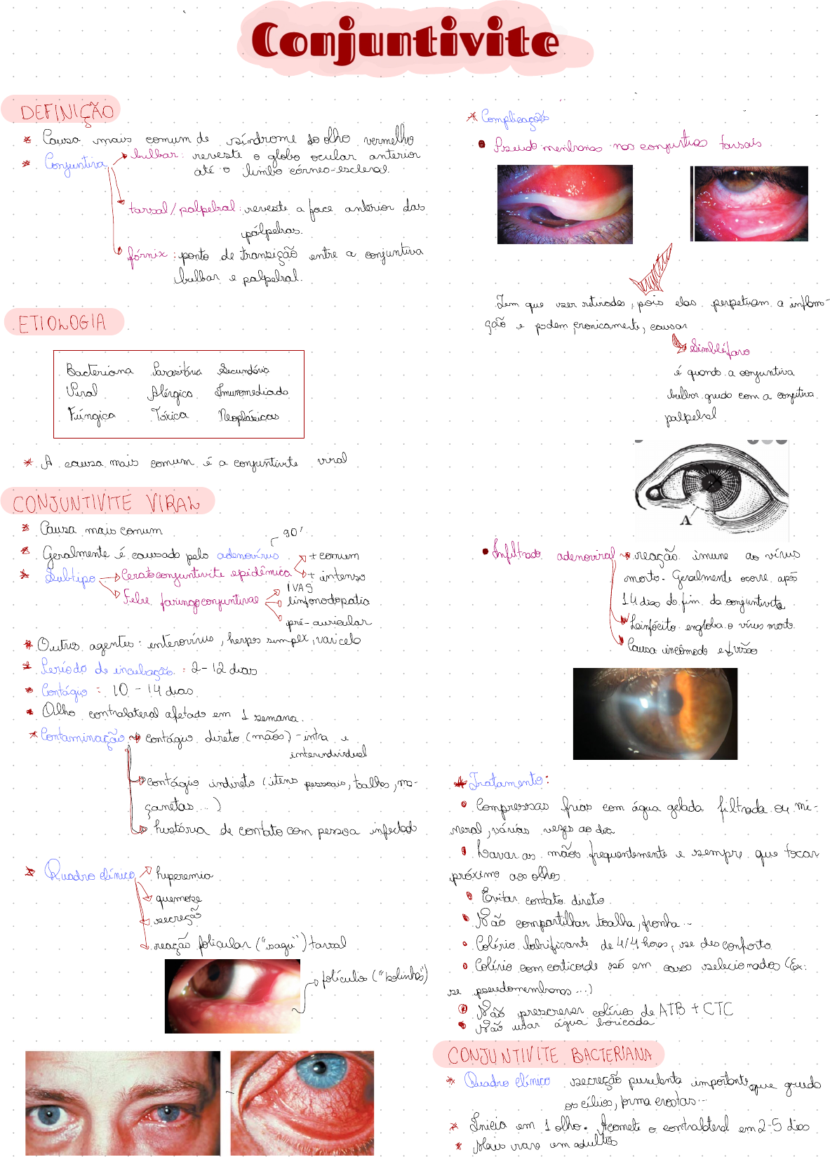 e a DEFINIÇÃO * Complicações . - _ * Causa mais comum de síndrome do olho vermelho ao pseudo membranas nos conjuntos tarsais * Conjuntiva A. lulbar : reveste o globo ocular anterior até o limbo córneo-escuro . f- tarsal / palpelral : reveste a face anterior daspálpebras . fórnix : ponto de transição entre a conjuntiva bilhar e palpdral . JUAN Sem que ser retirados , pois elas perpetuam a inflam - ETIOLOGIA são e podem çronicamute , causar Geo Simbléforo Bacteriana Parasitária Secundária é quando a conjuntiva Penal Alérgica tmuromediado bolha gruda com a eoyutioa Fúngica Tóxica Neoplásico palpehd * A causa mais comum é a conjuntivite viral CONJUNTIVITE VIRAL * Causa mais comum , só . • Geralmente é causado pelo adenovírus µ + comum ao Infiltrado adenooiral → reação imune ao vírus * Subtipo→Gratoconjuntivite epidêmica→+ intenso morto . Geralmente ocorre apã ↳ febre faringoeoryuntivae If "As linfonodopatio 14 dias do fim da conjuntivite pré- auricular HWfoinfo-a.to engloba o vírus morto 7- Outros agentes : enterovírus , herpes simple , varicela Causa incômodo efusão * Período de incubação = 2- 12 dias • Contágio = 10 - 14 dias • Olho contralateral afetado em 1 semana . * Contaminação ao contágio direto (mãos) - intra e inteundiuduel [µeontágio indireto ( itens pessoais , toalhas , no - *Jratamento :garotas . . . ) • Compressas frias com água gelada filtrada ou mi - história de contato com pessoa infectado moral , várias vezes ao dia • Lavar as mãos frequentemente e sempre que tocar * Quadro clínicos heperemio próximo aos olhos • Evitar contato direto☒ queimousecreção • Não compartilhar toalha , ponha . . reação folicular ( "saga " ) tava • Colírio lubrificante de 4 / 4horas , se desconforto • Colírio com corticoide só em casos selecionados (Gx : ✓ o folículos ( " bolinhos ") se pseudomembranosa . . . ) • Não prescrever colírios de ATBTCTC • vão usar água bonieada CONJUNTIVITE BACTERIANA # Quadro clínico secreção purulenta importanteque grudo- os cílios , toma crostas . . . * Inicia em 1 olho . Acomete o contralateral em 2-5 dias • Mais raro em adultos ** Loteamento * Curso de7- 10 dias • Controle ambiental • Compressas frias • Não coçar Revisão eeratoeone • Controle sistêmico com anti - histamínicos V0 • Colírios inibidores de mastócitos = alopata dine 1 ou2x por dia ( monitoração ) * Etiologia✓ • adultos : estafilococos , pneumococos , H . influenzae • Colírios esteroides , se ceratite / papilas / tenho gelo - conjuntivite forma grave , lesma . tirou amoooo ¢ç uma DST • Se necessário , manutenção com Tacrolimes Contato não- genitália - não- olho .Tofu . 0°" 'Hiperaguda ll - 7- das)Risco de úlcera de córnea perfurado - CONJUNTIVITE QUÍMICA * Representa 10% dos casos - se 751 . são consequência de acidentes ocupa -ovário fujamospor clamídia mais crônica currais • Bases ( álcalis) são piores que ácido[ não responsiva a ATB • 7 Potencial destrutivo padrão em pacientes sexual - • Reação de saponificação da córnea mente atrás ° Queimadura * itdransmessão contágio ( contato com secreções ) o Penetração e perfusão • Reação papila. hiperplasia do epitélio • Efeitos desastrosos - Imã para recuperar • Exames : PCR , Gramm , Giemsa , Sorologias * Jateamento tecidos • Colírio de antibiótico Pciproflaãmo→ noflóoomo }4-6×1 dia por 5- 7- dias7¥etrouongwoetdramiane *Conduta no PS • Compressas gelados • Lavagem imediata de superfície rubi • Pomadas oftálmica ( crianças) (mínimo 21130min ) • Usar : SF , RL , H2O . " - • Não usar água boiando CONJUNTIVITE ALÉRGICA * Inatamente : • Pacientes atópico : rinite alérgica , dermatite de contato , bronquite • Lubrificantes , anti - inflamatórios, ATB, vita - * Mais comum em crianças e pré - adolescentes * Não é transmissível mina C (VO) , atropina ( dor) , anti- hipertensivos• Piore muito na primavera ( por causa do pólen) ( PP / dor ) , analgésicos ( VO) . se Sinais e sintomas : *Medidas extremas : • Hiperosmia conjuntiva bilateral + róseo • Toarsorrafia ; membrana amniótica ; Tx límbico; • Queimou → edema na conjuntura Tx córner • Secreção mucosa / aquosa CONJUNTIVITE AUTOIMUNE • Espessamento conjuntural * Lipo mais raro de conjuntivite• Prurido intenso & São secundárias a doenças autoimunes * Penhigoede cicatricial• Reação papilar → papeles gigantes • Doença idiopática , autoimune ( HLA -B12) • Úlcera corneal em escuso • Senhoras : tradicionais • Quadro clínico bolhas conjunturais → úlcera → lesões • foumbo gelatinoso cioahecvais → Seimhlítãouf nódulos de • Tratamento : corticoide ( tópico + V0) ; imusooupvNO Horner - Trentas * Síndrome de Stevens Johnson • tipo grave de hipersensibilidade mediado porcélulas C D8 citotóxico • Sintomas : tradicionais • Quadro clínico : reação papila→ formação de membranas→ queratinezogao conjuntiva→ metapbsia dos céus e disfunção lacrimal NO Reação papilar • Gratamente : idêntico ao penfigoide - n -