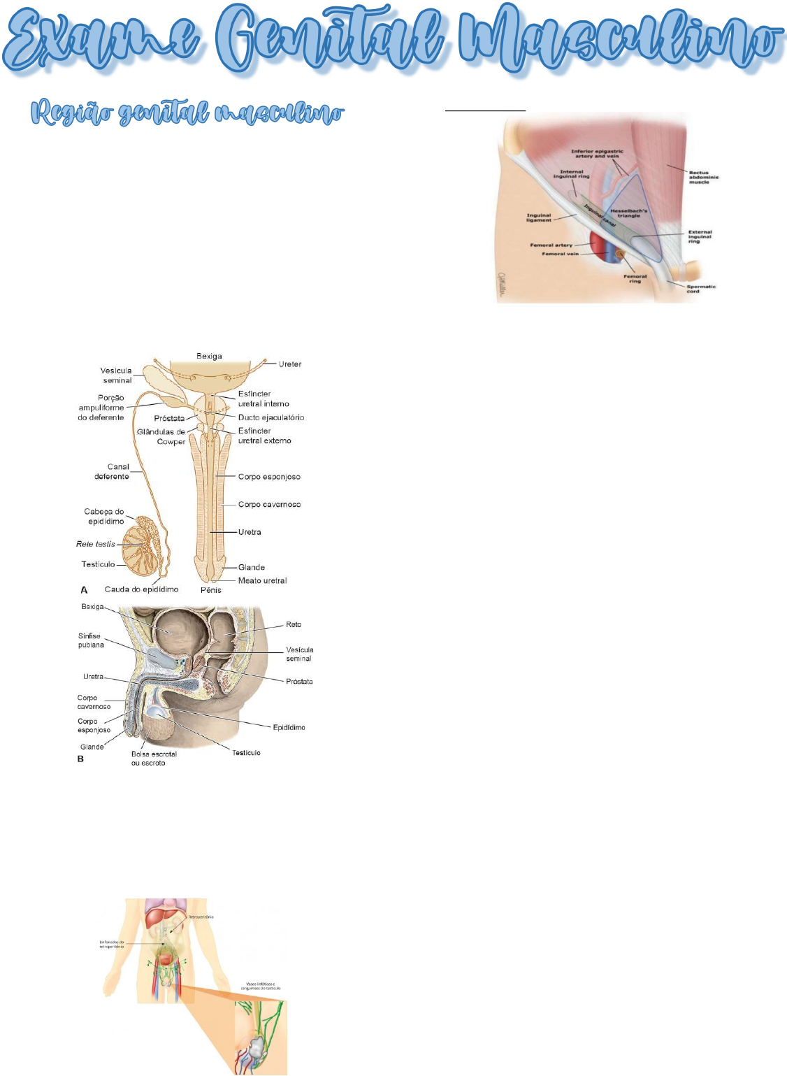 ♥ Pênis (órgão de cópula, prepúcio, meato uretral, uretra, coroa, corpos cavernoso e esponjoso, glande, musculatura ) ♥ Bolsa escrotal (testículos (gametogênese, produção hormônios), epidídimo, cordão espermático (ducto deferente, artérias, veias, vasos linfáticos e nervos) ♥ Glândulas sexuais acessórias: Vesículas seminais, próstata e glândula bulbouretral ♥ Uretra (urinário e genital) SEMIOTÉCNICA ♥ Faz-se o exame segundo ao do abdome, incluindo as regiões inguinais, principalmente para se localizar linfonodos relacionados à rede linfática perineal e pélvica ♥ o exame dos órgãos externos: Inspeção e Palpação -> Paciente de pé ou deitado e o examinador deve utilizar luvas INSPECIONAR ♥ Pênis: Pele , prepúcio (retração), pêlos, cor, uretra (secreções - smegma; coloração rosada e borda lisa), glande (úlceras, cicatrizes, nódulos), base do pênis ( escabiose,tumefações, lesões elementares), glande ♥ Escroto: face anterior e posterior, forma, tamanho, pele, massas, inflamação, contorno da bolsa escrotal, cistos epidermóides, observar assimetria, massas, edema ou tumefação ♥ Pênis e a bolsa escrotal, observando se : Paciente circuncisado, Tamanho do pênis, Tamanho do escroto, Presença de lesões, Presença de secreções (corrimento) -> se houver o observador deve observar suas características (Contínuo ou intermitente, Purulento ou sanguinolento) ♥ Obs: em condições normal no prepúcio pode haver o esmegma, substância caseosa esbranquiçada ♥ Hérnias: em pé, examinador sentado, assistente, regiões inguinais e genitália, valsalva PALPAÇÃO ♥ Exame dos órgãos internos: Toque retal ♥ PÊNIS: face anterior e posterior, forma, tamanho, pele, massas, inflamação, contorno da bolsa escrotal, cistos epidermóides, observar assimetria, massas, edema ou tumefação ♥ ESCROTO: oval, consistência amolecida e contorno indolor, polegar e 2 dedos, epidídimo (indolor, forma vírgula, macio), cordão espermático (fino, redondo, indolor a palpação), transiluminação (hidrocele) ♥ HÉRNIA: hérnia direita -> indicador direito palpar cordão espermático -> lig inguinal, anel inguinal externo + valsalva (direta), anel inguinal interno + valsalva (indireta), femoral (tossir/valsalva) ♥ HÉRNIA INGUINO ESCROTAL: Paciente deitado, quando hérnia, massa retorna ao abdome, se não reduz, auscultar rha+transiluminação – avalia hidrocele CLASSIFICAÇÃO DE TANNER TRANSILUMINAÇÃO DA BOLSA ESCROTAL ♥ Recurso complementar e simples ♥ Técnica: em uma sala escura, uma fonte luminosa é aplicada a cada lado da bolsa escrotal ♥ As estruturas vasculares, tumores, sangue, hérnia e o testículo normal não são transiluminados - exame negativo ♥ A transmissão da luz com um brilho vermelho - indica presença de líquido seroso ( hidrocele e espermatocele ) ♥ Indicado : Paciente com bolsa escrotal de tamanho aumentado ♥ Hidrocele e no cisto do cordão: transiluminação positiva ♥ Hematocele, tumor testicular e hérnia inguinoescrotal : negativa ♥ Ultrassonografia: detalhes da presença de liquido e ausência de conteúdo herniário ♥ Órgão masculino muda dependendo da idade -> relacionar dados médicos com a fase do paciente ♥ Essa região é constituída: Períneo e Ânus SEMIOTÉCNICA ♥ Inspeção e palpação ( toque retal ) ♥ Posição mais adequada é a genupeitoral, pode se adotar a posição de Sims, que consiste em decúbito lateral esquerdo, com coxa fletida 90º ♥ Deve ser realizado com boa iluminação e o uso de luvas é obrigatório INSPEÇÃO ♥ Nota-se que a pele da região perianal é mais pigmentada e frequentemente pregueada de modo radiado ♥ Observa-se a região perianal e sacrococcígea ♥ Primeiramente analisar: Espessamento, Escoriações (costumam acompanhar prurido anal), Lesões mais comuns: hemorroidas (dilatação das veias hemorroidárias), Fissuras, Condilomas, Prolapsos , Neoplasias, nódulos, úlceras, inflamações PALPAÇÃO PALPAÇÃO DIGITAL DO CANAL ANAL ♥ É necessário lubrificar o dedo enluvado ♥ Paciente realiza força para baixo ♥ Deve-se investigar: Tônus do esfíncter externo , Sensibilidade, Presença de tumores, Irregularidades que podem indicar (Hemorróidas, Neoplasias, Abcessos, Condilomas, Pólipos), sangue PRÓSTATA E VESÍCULA SEMINAL ♥ O exame destes órgãos é realizado pelo toque retal, o qual examina a próstata na face anterior do reto ♥ Do lado está a vesícula seminal ♥ Anamnese da próstata: disúria,jato miccional fraco ♥ sangramento, poliúria, urgência ♥ Miccional ♥ EXAME ANUAL APÓS 50 ANOS ♥ Deve se avaliar: Volume (Tamanho de uma castanha - 15 a 40g, Aumentado), Forma (Triangular, Globosa , Disiforme), Limites (Nítidos, Imprecisos) Superfície (Lisa ou Nodular) Consistência (Muscular , Amolecida, fibroelástica, Dura ou pétrea) Sensibilidade (Dolorosa, Extremamente dolorosa, Sensibilidade diminuída, Dolorosa ao toque) TOQUE RETAL ♥ Paciente deve urinar, esvaziando a bexiga o máximo que puder; ♥ SEMPRE ESCLARECER AO PACIENTE O QUE SERÁ FEITO!! ♥ Durante o exame ele pode ter a sensação de que está evacuando! ♥ Introduz-se o dedo, lenta e suavemente, por meio de movimentos rotatórios (horário e anti-horário), e com os dedos lubrificados ♥ A introdução digital deve ser feita delicadamente para que não haja Afecções ♥ INFANTILISMO Presença de órgãos genitais internos e externos menores do que o esperado em relação à idade Ocorre geralmente devido hipopituitarismo (falta de hormônio) ♥ VIRILISMO contrário do infantilismo. Exame mostra uma criança com genitália de adulto, podendo inclusive apresentar ejaculações Ocorre nos tumores suprarrenais, da hipófise e do 3º ventrículo) -> excesso de produção de andrógenos ♥ ESTADOS INTERSEXUAIS A genitália é dúbia, pois há órgãos sexuais externos e internos rudimentares de ambos os sexos O que às vezes, to