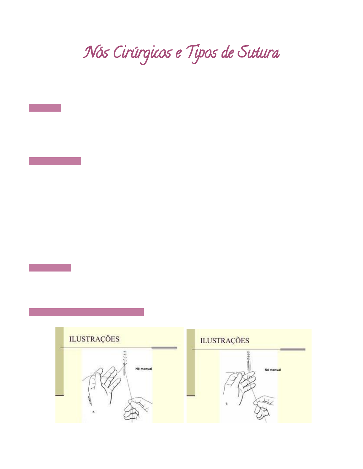 Nós Cirúrgicos e Tipos de Sutura N� cirúrgic� ● É o entrelaçamento ordenado e inteligente feito com as extremidades livres do fio cirúrgico CONFECÇÃO ● Composto por 3 seminós 1. Contenção 2. Fixação 3. Segurança PRINCIPIOS GERAIS ● Deve ser firme ● Menor volume possível -> cuidado com fios de alta memória ● A fricção entre as extremidades do fio deve ser evitada ● Tensão excessiva -> quebra do fio, maior dano tecidual ● Após o 1º seminó é necessário manter a tração em uma das extremidades do fio para evitar perda da laçada ● Seminós mais que necessários só adicionam volume ao nó, não aumentando a resistência ● “Lei dos nós”: - Movimentos iguais de mãos opostas executam um nó perfeito - A ponta do fio que muda de lado após a execução do primeiro seminó deve voltar ao lado inicial para realizar o outro seminó CLASSIFICAÇÃO ● Quanto a estrutura geométrica: - Nós comuns (nó quadrado e nó antideslizante) e nó especial (nó de cirurgião) TÉCNICA DE ELABORAÇÃO DO NÓ CIRÚRGICO ● Os nós cirúrgicos podem ser realizados manualmente ou com o uso de instrumental cirúrgico N� Antidesl�ant� N� co� a� dua� mã� - Técnic� d� Pauche� co� � ded� indicador N� d� Sapateir� N� d� Cirurgiã� o� N� Dupl� Técnic� Mist� co� Port�-Agulh�