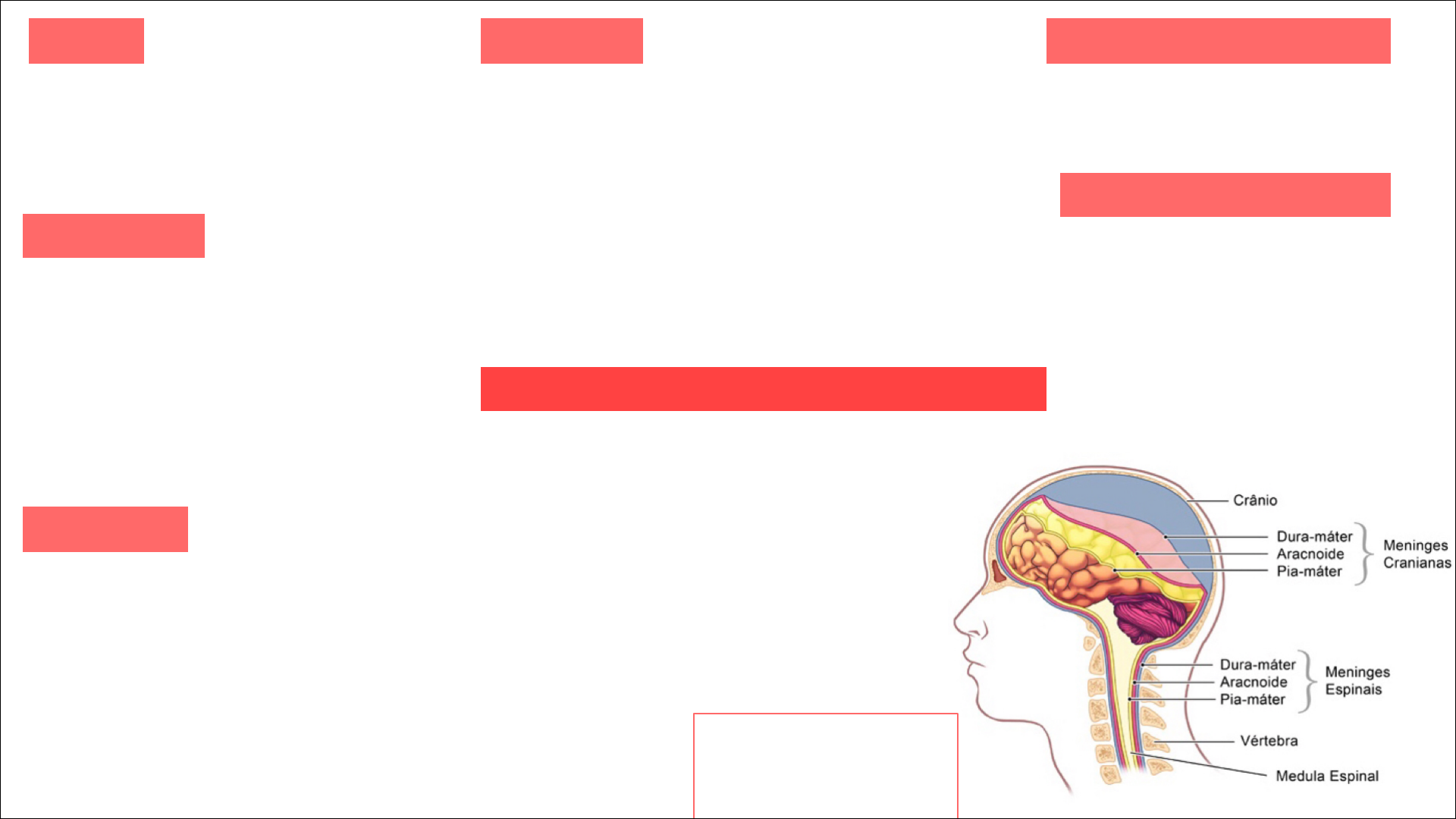 Membranas do Sistema Nervoso Central Crânio • Composto por ossos • Proteção do cérebro • Suporte das estruturas faciais • Dura-máter • Aracnóide • Pia-máter As meninges cranianas: As meninges espinais: • Dura-máter • Aracnóide • Pia-máter Dura-máter • É a membrana mais externa • Envolve o cérebro e a medula espinhal e é responsável por manter o líquido cefalorraquidiano Aracnóide • A aracnóide encontra-se justaposta à dura máter, da qual separa-se pelo espaço subdural, e sobreposta à pia-máter, da qual separa-se pelo espaço subaracnóideo. O espaço subdural é preenchido por líquido lubrificante, enquanto o espaço subaracnóideo é preenchido por líquido cefalorraquidiano Pia-máter • É a camada mais interna e delicada • A pia-máter permite que os vasos sanguíneos atravessem e nutram o cérebro. O espaço perivascular entre os vasos sanguíneos e a pia-máter é proposto como parte de um sistema pseudo-linfático para o cérebro *Quando a pia-máter fica irritada e inflamada, o resultado é chamado de meningite.