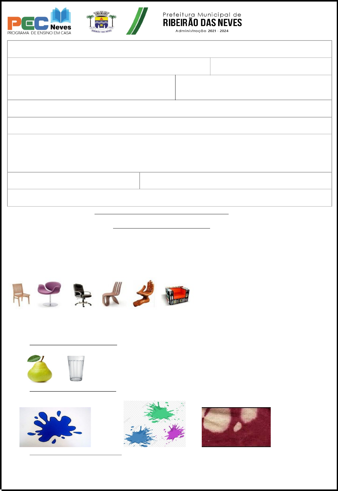 ESCOLA MUNICIPAL: ESCOLA MUNICIPAL CARLINDA RITTA DA SILVA ANO: 3º ANO ENSINO FUNDAMENTAL DATA: 19/04/2021 a 23/04/2021 IDENTIFICAÇÃO DA TURMA/MÓDULO: 301, 302, 303, 304 PROFESSOR: Audrey, Ivana, Maria Aparecida, Márcia Patrícia COMPONENTE CURRICULAR: Artes Visuais OBJETOS DE CONHECIMENTO: Elementos da linguagem (formas); Materialidade. HABILIDADES: (EF15AR02) Explorar e reconhecer elementos constitutivos das artes visuais; (EF15AR04) Experimentar diferentes formas de expressão artística, fazendo o uso sustentável de materiais, instrumentos, recursos e técnicas convencionais e não- convencionais; CARGA HORÁRIA: 2h DIA (S) DA (S) SEMANA: segunda e sexta- feira ORIENTAÇÕES DE EXECUÇÃO: Lave bem as mãos antes de fazer as atividades, faça no caderno e com capricho. Componente Curricular: Artes Visuais Formas(Elementos Visuais) QUANDO OLHAMOS A NOSSA VOLTA, PERCEBEMOS QUE TODOS OS OBJETOS TÊM UMA FORMA. A PORTA DA NOSSA CASA, O OVO DA GALINHA, O NOSSO SOFÁ, A BOLA QUE VOCÊ BRINCA. OBSERVE NAS CADEIRAS ABAIXO A DIFERENÇA ENTRE ELAS. CADA UMA TEM UMA FORMA. MAS NO ENTANTO, TEM A MESMA UTILIDADE. POIS, SERVE PARA NOS ACOMODAR. AS FORMAS NO DESENHO, NA PINTURA OU NAS DEMAIS OBRAS ARTÍSTICAS PODEM SER CLASSIFICADAS EM: FORMAS FIGURATIVAS OU IMAGENS REAIS, FORMAS ABSTRATAS E FORMAS GEOMÉTRICAS. · FORMAS FIGURATIVAS: SÃO AS FORMAS REAIS. POIS SÓ DE OLHARMOS PARA O OBJETO JÁ CONSEGUIMOS FALAR O SEU NOME E IDENTIFICÁ-LO. · FORMAS ABSTRATAS: SÃO AS FORMAS INDEFINIDAS. EX: QUANDO VOCÊ DERRAMA A TINTA NO PAPEL. · FORMAS GEOMÉTRICAS: PODEMOS PERCEBER ESSAS FORMAS NA MAIORIA DOS OBJETOS QUE NOS CERCAM, POIS SÃO PROJETADAS A PARTIR DE FIGURAS GEOMÉTRICAS. EX: A BOLA É PROJETADA A PARTIR DA FORMA GEOMÉTRICA DO CÍRCULO. O QUADRO DA NOSSA ESCOLA, ONDE ESCREVEMOS, ELE É PROJETADO A PARTIR DA FORMA GEOMÉTRICA RETÂNGULO. ATIVIDADE DE FIXAÇÃO 1- PROCURE EM JORNAIS OU REVISTAS OU DESENHE CASO VOCÊ ACHAR MELHOR, TRÊS FORMAS FIGURATIVAS NO CADERNO DE ARTES VISUAIS. 2- AGORA VOCÊ É O ARTISTA! FECHE OS SEUS OLHOS, PEGUE O LÁPIS E DESENHE UM DESENHO DE FORMA ABSTRATA. DEPOIS COLARA-O BEM BONITO! 3- NESSA ATIVIDADE, IREMOS FAZER UMA COLAGEM, UTILIZANDO AS FORMAS GEOMÉTRICAS. VOCÊS DEVERÃO UTILIZAR UMA FOLHA PARA CADA COLAGEM QUE ESCOLHER. PARA ISSO, VOCÊS PODERÃO USAR: · PAPÉIS COLORIDOS · TESOURA · COLA · CADERNO · FOLHA BRANCA · LÁPIS DE COR OBS: CASO VOCÊ NÃO TENHA O PAPEL COLORIDO, VOCÊ PODERÁ COLORIR COM LÁPIS DE COR O PAPEL BRANCO, RECORTAR E FAZER A COLAGEM MESMO ASSIM. NA COLAGEM, VOCÊ PRIMEIRO RECORTA AS FORMAS GEOMÉTRICAS, PARA DEPOIS MONTAR AS FIGURAS COM AS FORMAS. E DEPOIS DE MONTAR DEIXE O CADERNO ABERTO ATÉ SECAR! VEJA OS EXEMPLOS E ESCOLHA QUAIS AS COLAGENS VOCÊ IRÁ FAZER. ESCOLA MUNICIPAL CARLINDA RITTA DA SILVA ANO: 2021 DATA: 12.04 a 17.04. 2021 IDENTIFICAÇÃO DA TURMA: 301, 302, 303,304 PROFESSOR: AUDREY, IVANA, MARIA APARECIDA, MÁRCIA PATRÍCIA COMPONENTE CURRICULAR: LÍNGUA PORTUGUESA OBJETOS DE CONHECIMENTO: GÊNERO TEXTUAL: LETRA DE CANÇÃO, ESCRITA DAS PALAVRAS COM L OU LH, SEPARAÇÃO E CLASSIFICAÇÃO DE SÍLABAS, PRODUÇÃO DE TEXTO, ALFABETO CURSIVO MAIÚSCULO E MINÚSCULO. HABILIDADES: · IDENTIFICAR A FUNÇÃO SOCIAL DE TEXTOS QUE CIRCULAM EM CAMPOS DA VIDA SOCIAL DOS QUAIS PARTICIPA COTIDIANAMENTE (A CASA, A RUA, A COMUNIDADE, A ESCOLA) E NAS MÍDIAS IMPRESSA, DE MASSA E DIGITAL, RECONHECENDO PARA QUE FORAM PRODUZIDOS, ONDE CIRCULAM, QUEM OS PRODUZIU E A QUEM SE DESTINAM. · IDENTIFICAR A IDEIA CENTRAL DO TEXTO, DEMONSTRANDO COMPREENSÃO GLOBAL, ORDEM ALFABÉTICA. CARGA HORÁRIA: 4 horas DIAS DAS SEMANA: SEGUNDA-FEIRA= 2º E 3º HORÁRIO. SEXTA-FEIRA=2 º E 3º HORÁRIO ORIENTAÇÕES DE EXECUÇÃO: ANTES DE INICIAR AS ATIVIDADES LAVE BEM AS MÃOS, PROCURE UM LUGAR TRANQUILO, FAÇA MARGEM NO CADERNO E COMECE AS ATIVIDADES, NÃO ESQUEÇA DE CAPRICHAR NA LETRA E SEMPRE QUE TIVER DÚVIDAS PROCURAR ESCLARECER COM A PROFESSORA. VOCÊ É DEMAIS!!!!! 1- LEIA E CANTE O TEXTO BONECA DE LATA E RESPONDA AS PERGUNTAS: 1- QUAL O TÍTULO DA MÚSICA? 2- O QUE VIVIA ACONTECENDO COM A BONECA DE LATA? 3- O QUE ERA SEMPRE FEITO COM A BONECA DE LATA? 4- CRIE OUTRO TÍTULO PARA A MÚSICA. 5- QUANTO TEMPO LEVOU PARA ARRUMAR: · O NARIZ DA BONECA DE LATA. · A CABEÇA DA BONECA DE LATA. 6- ESCREVA AS PALAVRAS NO CADERNO E SEPARE EM SÍLABAS: BONECA CABEÇA HORA LATA BATEU NARIZ 7- IDENTIFIQUE DAS PALAVRAS ABAIXO QUAL ESTÁ ESCRITA ERRADA: FICAR DESAMAÇA LEVOU CHÃO BOA 8- ESCREVA AS PALAVRAS NO CADERNO, DIVIDINDO ENTRE OS CONCEITOS ABAIXO: ALFAIATE- ALICATE- AMORA- ABACATE- BANCÁRIO-BEGE-BANANA-BORBOLETA-ABACAXI-ABELHA-ARROZ-AVIÃO-AZUL-BRANCO-BOLACHA-BOMBEIRO-BONECA-ARCO-ANEL-AMEIXA-ÁRVORE-ARMÁRIO-BLUSA-BACIA-BOLA-BULE-BESOURO-APITO-ÁGUIA-ARGOLA-AMARELA-BODE-BATATA-BALEIA-BICO-BATOM-ABRIL-AGOSTO-AÇÚCAR-ADVOGADO-BALDE-BAÚ-BERMUDA-BOI CORES-______________________________________________________________________________ ANIMAIS-_____________________________________________________________________________ FRUTAS-______________________________________________________________________________ PLANTA-______________________________________________________________________________ MÓVEL-______________________________________________________________________________ PROFISSÕES-__________________________________________________________________________ MESES-_______________________________________________________________________________ ALIMENTOS-__________________________________________________________________________ TRANSPORTE-________________________________________________________________________ OBJETOS-_____________________________________________________________________________ 9- ATIVIDADE SERÁ ON LINE, O LINK SERÁ ENVIADO NO GRUPO. ATIVIDADE COM SÍLABAS COMPLEXAS, TIRAR O PRINT E MANDAR PARA A PROFESSORA. https://www.liveworksheets.com/em1214627ov 10- PRODUÇÃO DE TEXTO · NO CADERNO COPIE AS FRASES ABAIXO E COMPLETE CRIANDO UMA 