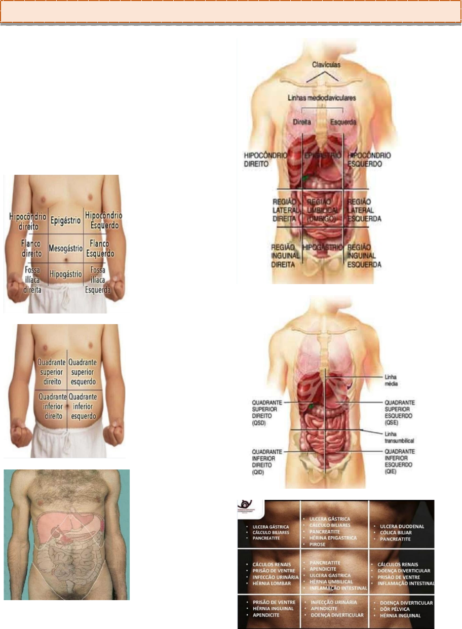 O exame físico do abdome deve ser realizado com o paciente em decúbito dorsal, ideal é ficar em 15 graus, pode ser com travesseiro ou erguer um pouco a maca O paciente deve estar relaxado com os braços estendidos ao longo do corpo A sala deve estar aquecida com privacidade e boa iluminação A cama não deve ser rígida e nem fria As mãos aquecidas e limpas Divisões Exame Físico do Abdome Inspeção Pela inspeção, são observadas as alterações da superfície cutânea, a forma e o volume do abdome Dentre as alterações superficiais mais comumente encontradas estão as cicatrizes operatórias, as estrias, a distribuição anormal de pelos pubianos, as anomalias da cicatriz umbilical e a circulação colateral O abdome normal é levemente abaulado e simétrico Em condições patológicas, pode apresentar-se globoso, como na obesidade, ascite e neoplasias - ou retraído, escavado, como nas doenças consuntivas O abdome assimétrico é encontrado em hepatoesplenomegalias, neoplasias, hérnias da parede, megacólon e síndromes obstrutivas Na inspeção o abdome pode apresentar-se escavado, quando há acentuada desnutrição, com a forma globosa que é o volume aumentado (tal aumento pode se dever ao maior conteúdo líquido e gasoso das alças intestinais, como ocorre nos pacientes com má absorção ou abdome plano Durante a inspeção, é importante observar a movimentação da parede abdominal com a respiração DISTENSÃO ABDOMINAL Caracteriza-se por aumento do volume do ventre e pode traduzir várias condições, tais como ascite, meteorismo, fecaloma, neoplasias Regra dos 6 F Fetus: gravidez Flatus: obstrução intestinal Faeces: fecaloma = Impactação fecal Fat: obesos Fluid: ascite = Quando se tem acúmulo de gases, aumento do conteúdo líquido, como se vê nos estados de má absorção acentuada ou em segmentos proximais à obstrução, a distensão abdominal pode acompanhar-se de submacicez ou macicez Fibroids: tumores, no qual pode ocluir o lúmen do órgão, ocasionando acúmulo de fezes e gases a montante da neoplasia Abaulamento Observe hérnias, que são quando ocorre distensão do músculo do abdômen e pode acarretar na distensão do intestino, fazendo o mesmo ir para frente e deixá-lo sem proteçã Ausculta Tem que ser realizada antes da percussão e palpação Com o objetivo de detectar sopros, a ausculta deve ser feita no trajeto de todas as artérias tronculares do corpo Os sopros podem ter intensidade variável, sendo conveniente quantifica-los em cruzes ( + a ++++ ) Peristalse Em condições normais, ouvem-se alguns ruídos hidroaéreos no abdome, produzidos pelo deslocamento de líquidos e gases no lúmen intestinal. São sons de água balançando dentro de abdome O normal é ouvir de 5 a 35 barulhos por minuto Se tiver menos ou mais o intestino está diferente Nos casos de diarreia e oclusão intestinal mecânica, os ruídos tomam-se mais intensos No íleo paralítico, os ruídos desaparecem por completo, o que constitui o chamado silêncio abdominal Líquidos e gás = ruídos hidroaéreo (RHA) Sopros Aorta abdominal Artérias renais PERCUSSÃO Percutir os quatro quadrantes Investigam-se zonas de macicez e de timpanismo, presença de ascite Percussão do abdome revela, na neoplasia cística, macicez nos flancos e sonoridade central. A macicez móvel é característica da ascite Sons: timpânico ou maciço Teste da macicez móvel Existem três maneiras de verificar se o paciente possui ascite, presença de líquido na cavidade abdominal: Sinal de piparote Sinal das macicez móvel Semicírculo de skoda Sinal de Piparote Os sons variam de timpânico quando tem muito ar, para maciço quando tem algo como tumor ou ascite (excesso de líquido) ] Teste de piparote: Para ver se o paciente tem ascite (barriga com água). Com o paciente posicionado em decúbito dorsal, solicite que o paciente posicione a face ulnar de uma de suas mãos na linha média de seu abdômen, após isso, o examinador deve posicionar a sua mão esquerda sobre o flanco esquerdo de seu abdômen, e realizar uma golpe rápido e firme no flanco direito O resultado é positivo se o realizador conseguir sentir uma onda líquida nas polpas digitais de sua mão sobre o flanco esquerdo O sinal positivo só vai ser transmitido se houver muito líquido na cavidade Macicez móvel Um paciente com ascite vai apresentar uma distribuição lateral, uma distribuição centrífuga do líquido, então espera-se que o líquido se distribua mais para os flancos e menos na região central do abdômen Ao analisar um paciente com ascite em decúbito dorsal Na linha média é esperado um som timpânico, decorrente das alças intestinais. Na linha lateral, dos flancos, o som passa a ser maciço, em decorrência dos líquidos (ascite) Para confirmar ascite, o examinador vai pedir para o paciente mudar de decúbito: Quando o paciente fica em decúbito lateral, o líquido que ficava no flanco escorre para o flanco do outro lado Para verificar se há macicez móvel, posiciona-se o paciente em decúbito lateral e percute-se o flanco sobre o qual ele está apoiado, obtém-se um som maciço( em decorrência do líquido) Em seguida, sem retirar o dedo do local, solicita-se que o paciente vire apoiando-se no decúbito contralateral e realiza-se nova percussão, obtém-se o som timpânico (pois não tem mais líquido, ele foi para o outro lado) Logo, houve uma cices móvel Ascite de médio volume Quando o paciente está em decúbito dorsal o líquido acumula-se na região lateral do abdome, revelando timpanismo na região anterior Quando o paciente fica em decúbito lateral, o líquido desloca-se para o mesmo lado, onde fica maciço e a região acima fica timpânica Semicírculo de Skoda Sempre lembre que a ascite, vai se distribuindo pela periferia O examinador percute a linha média e vai descendo a percussão para as laterais, nos locais que ele identifica transição entre os sons timpânicos e maciços são geralmente e
