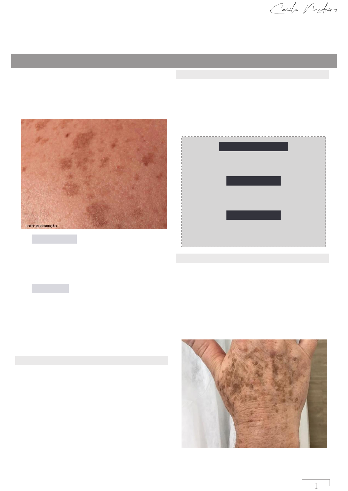 Existem dois tipos principais de lentigos: lentigo simples e lentigo solar. Ambos são lesões benignas. Embora sejam idênticos sob o aspecto clínico, esses dois tipos surgem em situações clínicas totalmente diferentes . Lentigo simples surge na infância várias máculas castanhas ou negras bem- demarcadas podem surgir em qualquer região da pele ou das mucosas Lentigo solar mais conhecidos como manchas hepáticas várias máculas marrons bem-definidas que aparecem em adultos nas áreas expostas ao sol aumentam quantitativamente com a idade são mais comuns no dorso das mãos, nos ombros e na face EPIDEMIOLOGIA Incidência: muito comuns, principalmente em pacientes de pele clara. Idade: distribuição bimodal na infância e idade adulta na pele exposta ao sol. Raça: mais comuns nos caucasoides. Sexo: mesma distribuição. Fatores desencadeantes: a exposição ao sol está diretamente associada aos lentigos solares. Os lentigos múltiplos estão associados a algumas genodermatoses, inclusive as síndromes LEOPARD, LAMB e de Peutz-Jeghers. PATOLOGIA Há um alongamento uniforme das cristas interpapilares da epiderme, além de aumento da melanina nos melanócitos e nos queratinócitos basais. Além disso, observa-se um número aumentado de melanócitos na camada basal. Melanófagos estão presentes na derme papilar. LESÕES FÍSICAS Máculas castanhas bem-definidas; Máculas do lentigo simples tendem a distribuir- se uniformemente e são pequenos; Máculas do lentigo solar mostram predileção pelas áreas expostas ao sol do dorso das mãos e da face; essas últimas lesões podem ser maiores do que as do lentigo simples. QUERATINÓCITOS Os queratinócitos tem como função principal a produção de queratina. MELANÓCITOS Os melanócitos são responsáveis pela produção de melanina, o pigmento que dá cor a pele. MELANÓFAGOS Os melanófagos são macrófagos soltos na derme que fagocitam melanina. lentigos DISTÚRBIOS DA PIGMENTAÇÃO introdução DIAGNÓSTICO DIFERENCIAL Essas patologias citadas podem ser semelhantes aos lentigos: Ceratose seborreica; Nevos juncionais; Efélides; Lentigo maligno; Melanoma. Lentigo versus efélide Lentigo solar Efélide Presente na infância Não Sim Permanente Sim Não Diminui com a idade Não Sim Recidiva frequentemente depois do tratamento Sim Sim Aumento da melanina Sim Sim Aumento dos melanócitos Sim Não EXAME LABORATORIAL A biopsia está indicada quando há suspeita de lentigo maligno ou melanoma. A investigação clínica é apropriada se houver suspeita de uma genodermatose. EVOLUÇÃO Não há indicação médica para o tratamento dos lentigos. Contudo, o aspecto estético incomoda alguns pacientes porque acredita-se que os lentigos estejam associados ao envelhecimento. A crioterapia e o tratamento a laser são as modalidades terapêuticas principais o tratamento a laser é mais eficaz que a crioterapia em uma única aplicação. outras opções de tratamento são os peelings químicos, tretinoína tópica, dermoabrasão local e agentes clareadores tópicos. MEDICAMENTOS TÓPICOS Os cremes clareadores como a hidroquinona a 4% podem clarear as lesões por alguns meses; A tretinoína tópica pode clarear as lesões; A combinação de hidroquinona com retinoide, isto é, Triluma (hidroquinona a 4%, tretinoína a 0,05% e fluocinolona acetonida a 0,01%) pode ser eficaz. Em geral, é necessário repetir o tratamento. CRIOTERAPIA É um método barato, rápido e eficaz de tratamento dos lentigos; A aplicação da crioterapia pode ser realizada com um pequeno aplicador com ponta de algodão por cerca de 5s; Em geral, essa modalidade é menos eficaz do que uma sessão de tratamento com laser Q- switched; A crioterapia foi considerada mais eficaz que os lasers de argônio e CO2 no tratamento dos lentigos. PEELINGS QUÍMICOS Os peelings com TCA (ácido tricloracético) a 35% podem ser eficazes.
