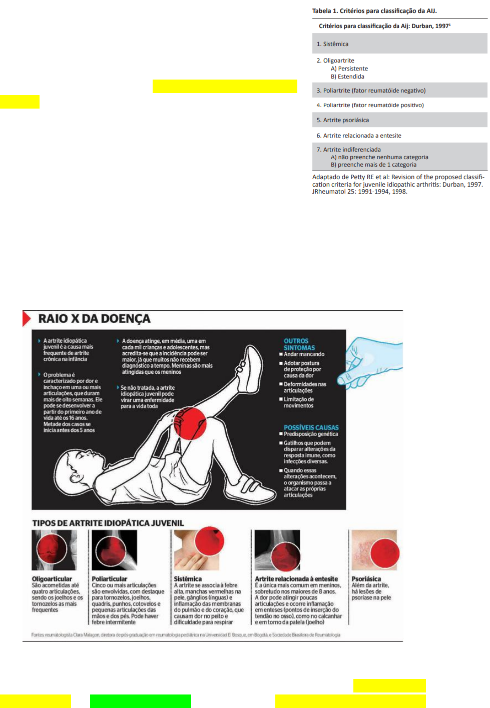 Artrite Idiopática Juvenil Larissa Reis 2021.1 Artrite idiopática juvenil (AIJ) é a denominação escolhida pela Liga Internacional de Associações de Reumatologia (ILAR) para definir um grupo heterogêneo de doenças autoimunes caracterizadas pela presença de artrite crônica (com duração maior do que seis semanas), de origem desconhecida e que se inicia antes dos 16 anos de idade. Prevalência de aproximadamente 1 para cada 1000 crianças; Maior incidência no sexo feminino; o Exceto na forma sistêmica, onde não há diferença entre os sexos; o Artrite Relacionada a Entesite (ARE) onde predomina o sexo masculino. Relação de prevalência entre os sexos feminino e masculino é de 3 para 1. Essa condição clínica acomete pacientes de qualquer raça, embora não existam dados fidedignos sobre as diferenças raciais. Uma distribuição bimodal para a idade de início indica um pico em crianças com menos de cinco anos e outro no grupo de 10 a 16 anos de idade. A AIJ é a doença reumática crônica mais comum em crianças. Os principais biomarcadores utilizados no diagnóstico e prognóstico são os anticorpos anti- nucleares (FAN) e o Fator Reumatoide (FR), sendo o primeiro marcador de desenvolvimento de Artrite Idiopática Juvenil Larissa Reis 2021.1 uveíte crônica, e o segundo, quando positivo, marcador de pior prognóstico e envolvimento articular severo, com maior risco para o desenvolvimento de deformidades. A sinovite persistente poderá resultar em lesão articular com diminuição do desempenho nas atividades cotidianas, retardo motor de grandes e pequenas articulações, o que irá interferir no desempenho escolar e na qualidade de vida. COMPLICAÇÕES 1. Cegueira: Uveíte 2. Assimetria de MMII 3. Síndrome de ativação macrofágica 4. Deformidade articular AIJ Oligoarticular (MAIS COMUM) Inicia < 8 anos o pico de incidência é entre 1 e 3 anos de idade ≤ 4 articulações (MAIS COMUM: JOELHO) Característico: Assimetria de MMII e Uveíte o A artrite é em geral assimétrica, de grandes articulações e início precoce (antes dos seis anos), com frequência aumentada de FAN positivo (70-80%), e maior risco de iridociclite. A AIJ oligoarticular se caracteriza pela presença de artrite em uma a quatro articulações, nos primeiros seis meses de doença. Se após este período o número de articulações acometidas ultrapassar cinco, será denominada como AIJ oligoarticular estendida (porém somente após 6 Artrite Idiopática Juvenil Larissa Reis 2021.1 meses da doença); se permanecer com menos de cinco articulações, será denominada de AIJ oligoarticular persistente. A AIJ oligoarticular é o subtipo mais comum e benigno, compreendendo 50% dos casos de AIJ, tendo predomínio em crianças pré-escolares e no gênero feminino. O subtipo AIJ mais frequentemente associado à uveíte anterior assintomática ou crônica é a oligoarticular, que é o subtipo mais frequente de AIJ. Nesses casos, a uveíte pode ser até mais grave que a artrite, ser concomitante, anteceder ou preceder a artrite. A iridociclite acomete cerca de 30% destes pacientes, com início insidioso e assintomático, podendo afetar um ou ambos os olhos. Poliarticular FR+ Inicia na adolescência ≥ 4 articulações o A artrite é simétrica, principalmente em pequenas articulações das mãos e dos pés. Artrite crônica que acomete cinco ou mais articulações nos primeiros 6 meses de doença e presença de FR positivo em duas ocasiões com pelo menos 3 meses de diferença. Com pico bimodal , o primeiro entre 3 e 4 anos e o segundo entre 12 e 16 anos, com predominância no sexo feminino. Artrite Idiopática Juvenil Larissa Reis 2021.1 Na artrite reumatoide, o sistema imunológico do corpo ataca seus próprios tecidos, incluindo articulações. Em casos graves, ele ataca os órgãos internos. A artrite reumatoide afeta o revestimento das articulações, causando inchaços doloridos. Com o passar do tempo, a inflamação causada pela artrite reumatoide pode levar à erosão do osso e deformidade da articulação. Semelhante a AR Característico: Semelhança clínica AR (ARJ) o Potencial erosivo Poliarticular FR- Inicia entre os 8 a 12 anos ≥ 4 articulações o A artrite é assimétrica, com alta frequência de FAN e risco aumentado de iridociclite. Grandes articulações Característico: Extra-articular incomum e baixo potencial erosivo TRÊS TIPOS DE APRESENTAÇÕES Doença é semelhante à forma oligoarticular, exceto pelo número de articulações acometidas nos primeiros 6 meses, que é maior do que cinco. Também é caracterizada por artrite assimétrica, início precoce, predominância do sexo feminino, aumento da frequência de FAN e maior risco de iridociclite Similaridade com a artrite reumatoide FR negativo do adulto, com sinovite simétrica de pequenas e grandes articulações, início na idade escolar, aumento de VHS, negatividade para FAN, e prognóstico variável. Ocorre sinovite com edema insignificante, porém com contraturas, rigidez articular e VHS normal ou levemente aumentado. Esta forma tem curso destrutivo e é pouco responsiva ao tratamento. Quanto mais velha for a criança, maior tende a ser o número de articulações acometidas, mais frequente é a simetria e a positividade do fator reumatoide. Artrite Idiopática Juvenil Larissa Reis 2021.1 Entesite Relacionada Inicia entre os 8 a 12 anos Acomete principalmente sexo masculino (6:1) acima de 6 anos, sendo a maioria HLA B27 positivo (76-85%), e é caracterizada por artrite associada à entesite. Sacroileíte (Envolvimento axial) A artrite geralmente é de membros inferiores, e o quadril pode ser envolvido precocemente. Em alguns pacientes a artrite axial pode ser grave e afetar articulação sacroilíaca e coluna vertebral, levando a espondilite anquilosante. Periférico MMII É definida por artrite e entesite ou artrite ou entesite e mais dois dos seguintes critérios: 1) História de dor em sacroilíacas e/ou dor inflamat