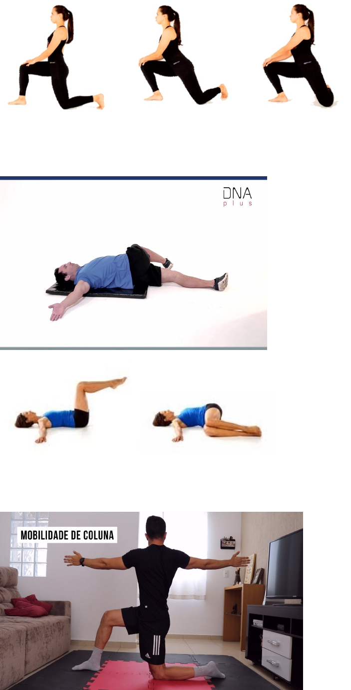 Exercícios de mobilidade – Quadril e coluna 1. Levando o corpo a frente ajoelhado (2x10 cada lado) 2. Torção de tronco (2x20 segundos cada lado) 3. Torção de tronco ajoelhado (5x10 segundos cada lado) 4. Alongamento de glúteos (2x20 segundos cada lado) 5. Mobilidade de coluna Gato Arrepiado (10 vezes) 6. Alongamento de coluna (3x30 segundos) 7. Alongamento lateral (2x10 segundos cada lado)