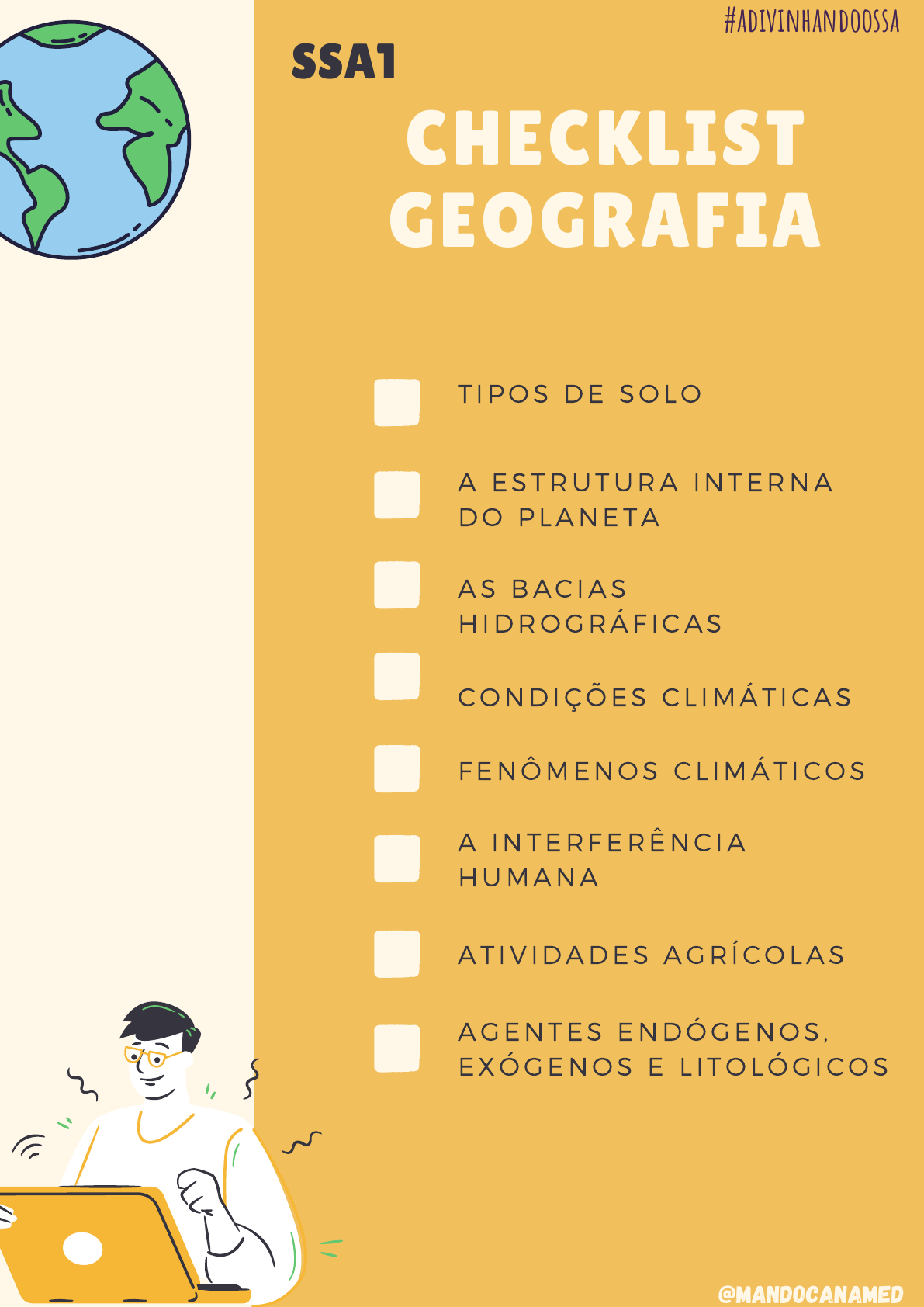 T IPOS DE SOLO A ESTRUTURA INTERNA DO PLANETA AS BACIAS H IDROGRÁF ICAS CONDIÇÕES CL IMÁT ICAS CHECKLIST GEOGRAFIA FENÔMENOS CL IMÁT ICOS A INTERFERÊNCIA HUMANA SSA1 #adivinhandoossa @mandocanamed AT IV IDADES AGRÍCOLAS AGENTES ENDÓGENOS , EXÓGENOS E L I TOLÓGICOS