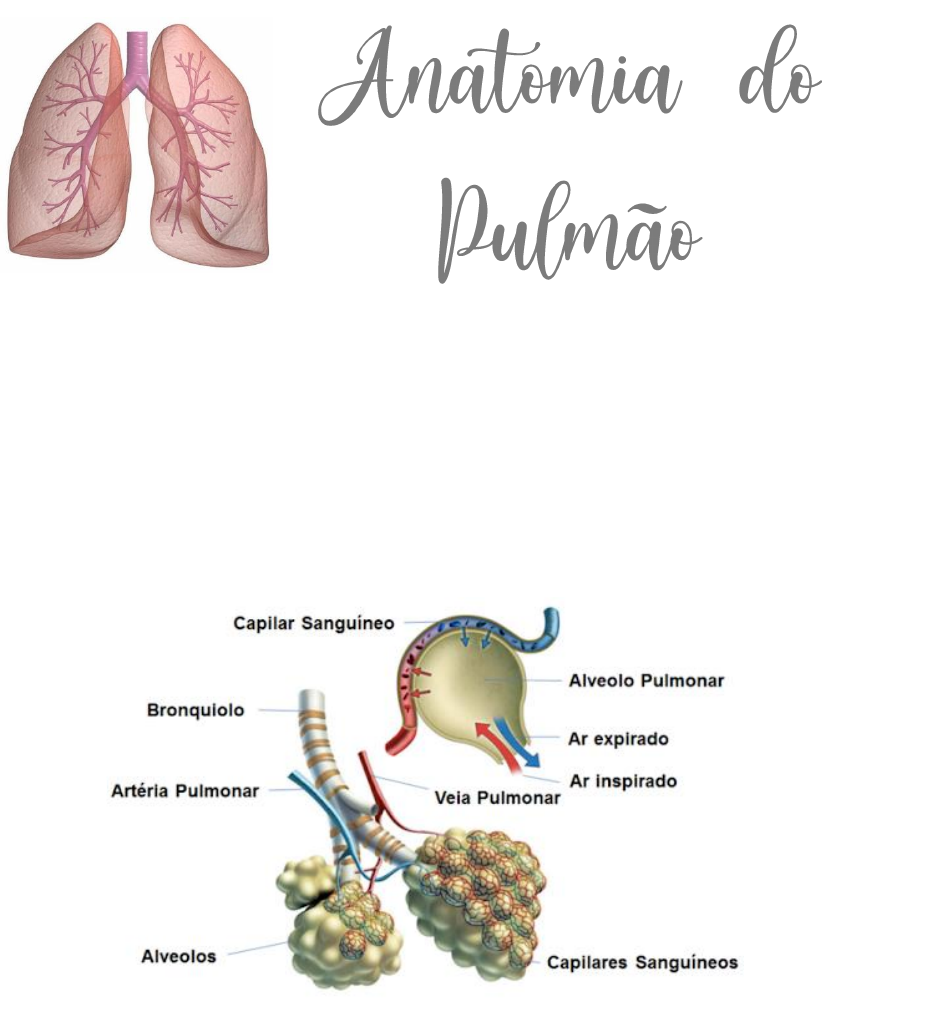 Por Jhennifer Pereira Ramos (instagram @jhennipereira_) Por Jhennifer Pereira Ramos (instagram @jhennipereira_) OS PULMÕES Os pulmões são órgãos vitais da respiração, cuja principal função é oxigenar o sangue durante a hematose, nome dado ao processo de troca gasosa. A troca gasosa acontece quando o ar inspirado é colocado próximo do sangue venoso nos capilares pulmonares, ou seja, será trocado gás carbônico (sangue venoso) por moléculas de oxigênio (sangue arterial). LOCALIZAÇÃO Os pulmões ficam localizados na cavidade torácica pulmonar e são separados um do outro pelo mediastino. As cavidades pulmonares é um espaço duplo (direito e esquerdo), bilateral e que contém os pulmões e as pleuras, ocupando quase todo o tórax. Já o mediastino, é uma região única e central, interpondo as duas cavidades pulmonares. Essa região é responsável por abrigar o coração, grandes vasos, traqueia, esôfago, timo e linfonodos torácicos. Por Jhennifer Pereira Ramos (instagram @jhennipereira_) ANATOMIA DOS PULMÕES Diferente das autópsias, um pulmão saudável é leve, macio e esponjoso, ocupando totalmente as cavidades pulmonares. Também possuem uma capacidade elástica e complacente consideráveis e retraem-se a aproximadamente um terço do tamanho original quando a cavidade torácica é aberta. Cada pulmão apresenta: • Um ápice: extremidade superior, arredondada, que ascende acima do nível da primeira costela até a raiz do pescoço; geralmente, é recoberto pela cúpula da pleura; • Uma base: face inferior côncava do pulmão, oposta ao ápice, que acomoda a cúpula ipsilateral do diafragma e se apoia nela; • Dois ou três lobos, criados por uma ou duas fissuras; • Três faces: costal, mediastinal e diafragmática; • Três margens: anterior, inferior e posterior; LEGENDA: Os pulmões são mostrados separados em vistas anterior (A) e laterais (B), sendo possível ver os lobos e as fissuras. C. O coração e os pulmões são mostrados in situ. O pulmão esquerdo está afastado do coração (coberto pelo pericárdio fibroso) revelando o nervo frênico em sua passagem anterior à raiz do pulmão, enquanto o nervo vago (NC X) segue posteriormente à raiz. FONTE: Moore – Anatomia Orientada para a Clínica, 2018 Por Jhennifer Pereira Ramos (instagram @jhennipereira_) PULMÃO DIREITO O pulmão direito apresenta duas fissuras: a obliqua e a horizontal, que o dividem em três lobos direitos: superior, médio e inferior. Esse pulmão é maior e mais pesado que o esquerdo, porém mais curto e mais largo pois a cúpula direita do diafragma é mais alta devido a localização do fígado, e o coração e o pericárdio estão mais voltados para a esquerda. Sua margem anterior é relativamente reta. PULMÃO ESQUERDO O pulmão esquerdo tem uma única fissura: a oblíqua, que o divide em dois lobos esquerdos: superior e inferior. A margem anterior do pulmão esquerdo tem uma incisura cardíaca profunda, uma impressão deixada pelo desvio do ápice do coração para o lado esquerdo. Essa impressão situa-se principalmente na face ântero-inferior do lobo superior. Com frequência, ele molda a parte mais inferior e anterior do lobo superior o transformando em um prolongamento estreio e linguiforme, a lingula, que se estende abaixo da incisura cardíaca e desliza pra dentro e pra fora do recesso costomediastinal durante a inspiração e expiração. FACES PULMONARES Os pulmões possuem três faces: 1. FACE COSTAL DO PULMÃO Face grande, lisa e convexa. Relacionada a parte costal da pleura, que a separa das costelas, cartilagens costais e dos músculos intercostais íntimos. Sua porção posterior está relacionada aos corpos das vértebras torácicas e, devido isso, é denominada as vezes por parte vertebral da face costal. 2. FACE MEDIASTINAL DO PULMÃO Porção côncava, pois, está relacionado com o mediastino médio, onde é localizado o pericárdio e o coração. Compreende ao hilo, que recebe a raiz do pulmão. 3. FACE DIAFRAGMÁTICA DO PULMÃO Parte côncava e que forma a base do pulmão, que repousa e se apoia sobre a cúpula do diafragma. A concavidade é mais profunda no pulmão direito devido posição mais alta da cúpula do diafragma. Na porção lateral e posterior, a face diafragmática é limitada por uma margem fina e aguda que se projeta o recesso costodiafragmático da pleura. As impressões pulmonares, o hilo e a face mediastinal (com mais achados anatômicos), podem ser vistos na imagem abaixo. Por Jhennifer Pereira Ramos (instagram @jhennipereira_) LEGENDA: As impressões surgem em pulmões fixados pelo contato com estruturas adjacentes. Superiormente à raiz do pulmão direito (A), forma-se um sulco enquanto o arco da veia ázigo segue anteriormente para entrar na veia cava superior (VCS); no pulmão esquerdo (C), um sulco semelhante, porém maior, se forma superiormente à raiz, enquanto o arco da aorta se curva posteriormente e desce como a parte torácica da aorta. O hilo de cada pulmão está centralizado na face mediastinal. No hilo (B e D), a raiz de cada pulmão é circundada por uma bainha pleural que desce inferiormente à raiz como o ligamento pulmonar. As veias pulmonares são as mais anteriores e inferiores na raiz, com os brônquios em posição central e posterior. FONTE: Moore – Anatomia Orientada para a Clínica, 2018 Por Jhennifer Pereira Ramos (instagram @jhennipereira_) MARGENS PULMONARES O pulmão possui três margens: 1. MARGEM ANTERIOR Marca o ponto de encontro entre as faces costal e mediastinal, que recobre o coração. A incisura cardíaca deixa uma impressão nessa margem do pulmão esquerdo. 2. MARGEM INFERIOR: Circunscreve a face diafragmática do pulmão, separando-a das faces costal e mediastinal. 3. MARGEM POSTERIOR: Marca o ponto de encontro posterior das faces costal e mediastinal; é larga e arredondada e situa-se no espaço ao lado da parte torácica da coluna vertebral. RAÍZES E HILO PULMONAR Os pulmões, localiz