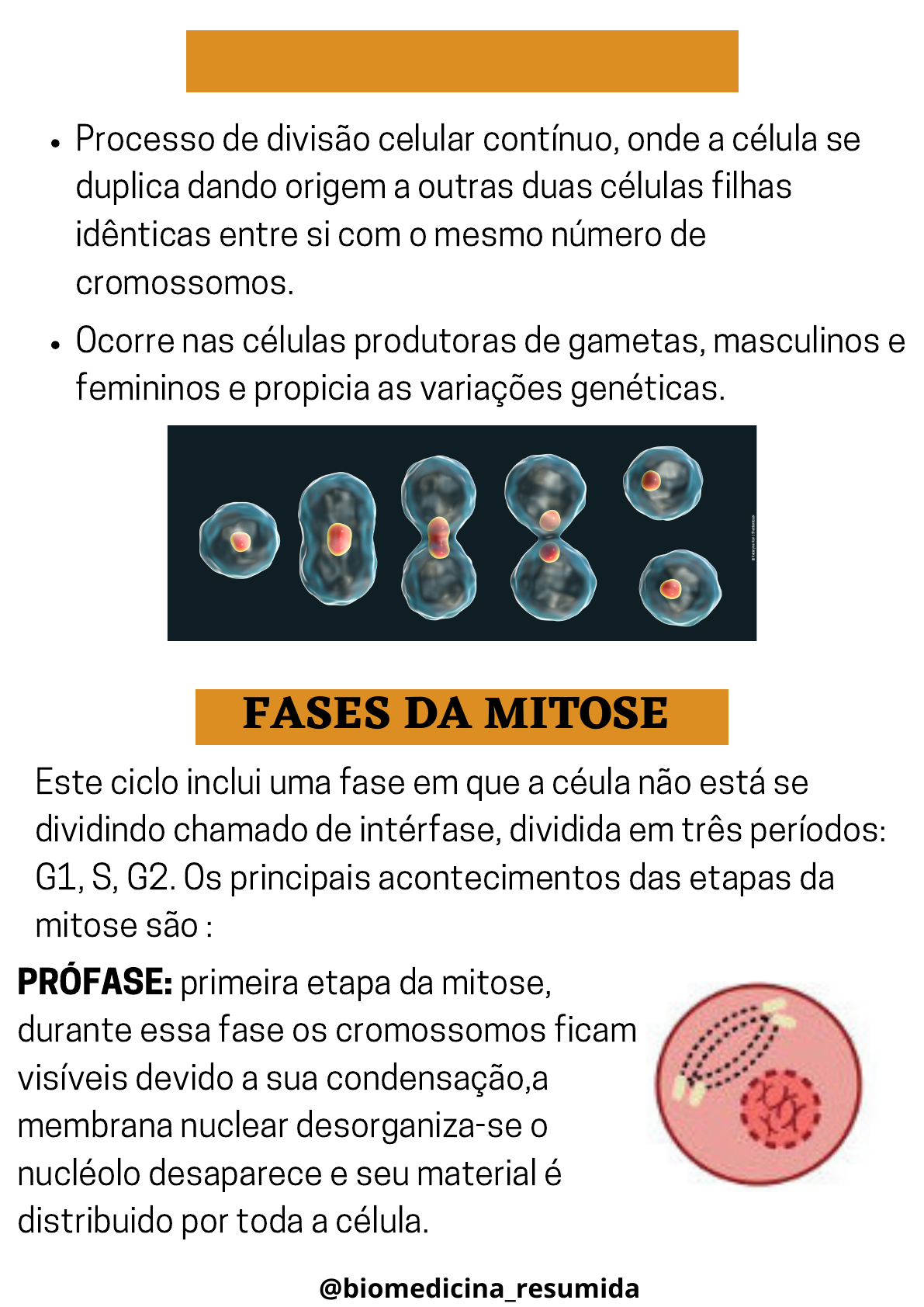 MITOSE Processo de divisão celular contínuo, onde a célula se duplica dando origem a outras duas células filhas idênticas entre si com o mesmo número de cromossomos. Ocorre nas células produtoras de gametas, masculinos e femininos e propicia as variações genéticas. FASES DA MITOSE Este ciclo inclui uma fase em que a céula não está se dividindo chamado de intérfase, dividida em três períodos: G1, S, G2. Os principais acontecimentos das etapas da mitose são : PRÓFASE: primeira etapa da mitose, durante essa fase os cromossomos ficam visíveis devido a sua condensação,a membrana nuclear desorganiza-se o nucléolo desaparece e seu material é distribuido por toda a célula. @biomedicina_resumida METÁFASE: os cromossomos presos ao fuso pelo centrômero se no plano equatorial da célula formando a chamada placa equatorial, possuem condensação máxima, permitindo a visualização das cromátides ANÁFASE: inicia-se no momento em que o centrômero de cada cromossomo duplicado divide-se longitudinalmente, separando as cromátides-irmãs. Logo em seguida são puxados para os polos opostos da célula TELÓFASE: é a última fase da mitose, carioteca se reorganiza, os cromossomos se descondensam, o cinetócoro e as fibras cimetocóricas desaparecem e o nucléolo se reorganiza. Células filhas @biomedicina_resumida CÉLULA EM MITOSE @biomedicina_resumida