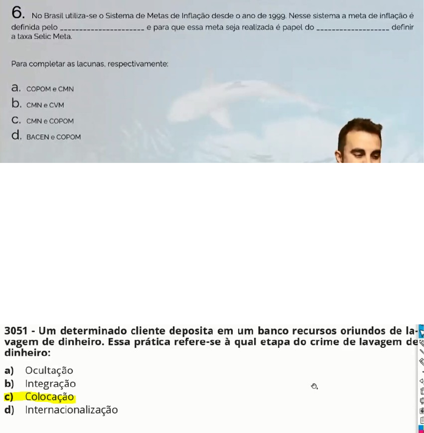 QUESTÃO 1: Meta de inflação: quem define meta de inflação e o CMN Selic Meta: Quem define o COPOM, pois quem define a meta de inflação a ser perseguida e o chefão, CMN, e quem busca seguir e o COPOM. Resposta: CMN E COPOM QUESTÃO 2: Ou seja o dinheiro acabou de entrar no sistema econômico, esta tapa da lavagem de dinheiro e chamada de Colocação e a 1° fase da lavagem de dinheiro. Meta de inflação = CMN SELIC META = COPOM QUESTÃO 3: O valor máximo é de R$20 MILHÕES. QUESTÃO 4: 5 anos da realização da operação, exemplo se ele encerrar a conta em 2021 o banco vai ter que cancelar o cadastro dele em 2026. QUESTÃO 5: O CMN e composto por: Ministro da economia, secretário especial da fazenda, e presidente do BANCEN QUESTÃO 6: No caso de uma movimentação finaiceira atípica a instituição financeira deve avisar ao COAF que é o orgão responsável pela prevenção e combate a lavagem de dinheiro. QUESTÃO 7: Pode ser reduzida até 2/3 se você dedurar a pessoa. QUESTÃO 8: SCTVM/SDTVM = Corretora SELIC = Titulos Públicos Quem concede crédito imobiliário e uma empresa de crédito imobiliário, não uma correta. Quem realiza intermediação na bolsa de valores e a corretora. Quem administradora fundos de investimento e a corretora ou bancos de investimento. QUESTÃO 9: Títulos Públicos Federais e CDB’S são produtos de investimento, Ações e derivativos são produtos de investimento. Produtos de previdência complementar (VGBL E PGBL) não são produtos de investimento conforme a anbima são SEGUROS e administrados por uma seguradora, poupança também não é produtos de investimento. QUESTÃO 10: Deve ser verificada as informações junto ao cliente antes de taxar alguma coisa, para ver da onde que veio o dinheiro, pode ter vindo de herança ou algo do tipo. Não informa o COAF acima de R$50.000,00 pois não entrou em espécie. QUESTÃO 11: Neste caso por formar quadrilha, ele terá aumentada ema té 2/3 Se fosse sozinho seria de 3 até 10 anos. QUESTÃO 12: EFPC – Faz a administração dos fundos de pensão, então não é este caso, pois quem fiscaliza eles e a PREVIC. Quem Autoriza o funcionamento e faz a fiscalização das entidades fechadas de previdência complementar é a PREVIC. A PREVIC É UM ORGÃO EXECUTOR. QUESTÃO 13: Pois tem muitos imóveis e bens de luxo, joias sendo usado para lavagem de dinheiro, pois quem comercializa esses itens levou pressão também para fiscalizar da onde vem os recursos. QUESTÃO 14: Ele colocou uma ordem na frente da outra, essa prática e chamada de Front Running e uma prática ilegal e anti-ética. QUESTÃO 15: Não impacta na situação financeira do cara. QUESTÃO 16: Tudo o que for em espécie, movimentações pagamentos em espécie suspeita e de valores altos deve ser avisado ao COAF, quando temos transações bancárias fica muito mais fácil da instituição rastrear. QUESTÃO 17: É conhecido como venda casada essa prática. QUESTÃO 18: Eu tenho que informar a ele eventuais conflitos de interesses, exemplo informar que eu ganho comissão ao passar para ele aquele produto. QUESTÃO 19: Colocação e a 1° etapa da lavagem de dinheiro, é onde o dinheiro entra no mercado econômico, no caso na compra de imóvel. QUESTÃO 20: COAF – e o órgão responsável pela prevenção e fiscalização de lavagem de dinheiro no Brasil. QUESTÃO 21: Dentro do banco ele pode transitar com as informações do cliente entre as áreas, e óbvio, agora ele não pode passar a informação do cliente para uma pessoa de fora. QUESTÃO 22: Anbima quer que a comunicação seja padrão, e tem que ser mais clara possível, pois quanto mais claro possível, mais as pessoas vão entender, mais elas vão vir para o mercado. QUESTÃO 23: QUESTÃO 24: QUESTÃO 25: Insider trader e quando eu tenho informação privilegiada e uso para uso próprio ou para terceiros. QUESTÃO 26: QUESTÃO 27: QUESTÃO 28: QUESTÃO 29: Know your client e para conhecer o cliente e saber de onde vem a origem do recurso do cliente, para tentar dificultar e prever a lavagem de dinheiro. QUESTÃO 30: É R$50.000 em espécie mesmo se for suspeito ou não deve avisar. QUESTÃO 31: QUESTÃO 32: Pena de 3 a 10 anos mais multa e a punição para quem praticar lavagem de dinheiro. QUESTÃO 33: QUESTÃO 34: Títulos públicos não passam pela regulamentação da CVM. CMV Regulamenta o mercado de ações não autoriza a entrada de investidores estrangeiros. O objeto da CVM e fiscalizar quem emite ações para proteger os clientes. QUESTÃO 35: Para ser um banco múltiplo ele tem que obrigatoriamente ter uma carteira comercial ou uma de investimento. Ele está autorizado a captar por depósito a vista e também conceder crédito para aquisição de bens. QUESTÃO 36: QUESTAÕ 37: QUESTÃO 38: COI – Comite Olimpico Internacional Colocação, Ocultação, Integração Colocação: Dinheiro entrando no mercado econômico Ocultação: esconder o dinheiro, dificultar o rastreio Integração: Quando o recurso após passar por essa fases volta para a sociedade com aparência limpa. CMN – Cara que manda neles Funções: Regular – A constitução e fiscalização das I.F Autorizar: Emissão de papel moeda Limitar: sempre que necessário as taxas de juros, desconto comissões Disciplinar: O crédito em todas suas modalidades. CMN – Orgão 100% normativo Não executa nada CMN – Conselho que só manda, só da as diretrizes, só autoriza as coisas, só da permissão, só fixa metas. Banco central do Brasil – BACEN Principal executor do SFN Principais funções: Formular e executar: Politica monetária, de crédito e cambial Emitir: Papel moeda Receber: depósitos compulsórios dos bancos Fiscalizar: as instituições financeiras Autoriza: o funcionamento das instituições financeiras autoriza bancos a funcionar. Redesconto bancário: Empréstimo realizado pelo Bacen, quando um banco está sem dinheiro. SFN – Sistema financeiro nacional Composto por: Agentes superavit