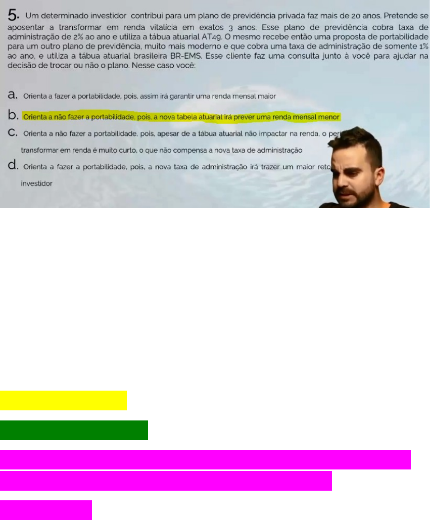 e Tabua Atuarial é uma perspectiva de vida, taxa de mortalidade. Nos anos 40 a taxa de perspectiva de vida era menor, ou seja o cara se aposentava e recebia uma boa aposentadoria pois não iria viver muito, hoje com a qualidade de vida ele vive muito então as seguradoras de previdência pagam menos pois vão ter que pagar por mais tempo dinheiro para a pessoa. Atuais pagam mais Antigas pagam menos Então oriento ele a não faz a portabilidade pois indo pra uma tabua aturial mais recente, ele vai receber menos mensalmente. O banco e obrigado a fazer portabilidade. Não incide tributação. Na tabela progressiva do PGBL sempre fica 15% na fonte. VGBL – Tributa sobre os juros PGBL – Tributa sobre o capital os rendimentos mais o juros. Então neste caso é progressiva porque ta deduzindo 15% e PGBL porque ta tributando sobre o capital e os rendimentos tudo, PGBL tributa sobre o total. Taxa de carregamento = Taxa de entrada Taxa de entrada pode ser cobrada no resgate ou na aplicação, Base de calcúlo da taxa de carregamento – Valor da Aplicação Mas o momento de cobrança pode ser antecipado ou postecipado no resgate ou na aplicação. VGBL – Tributa somente sobre os juros (Rendimento) VGBL Progressivo – O que fica na fonte é sempre 15% Eu tenho que saber quanto dos R$40.000 e juros. Pois VGBL incide sobre os juros. Informações: R$100.000,00 6% ao ano Prazo 12 anos Resgata 40.000,00 NA CALC: 1° descobrir quanto esse montante é hoje 100.000,00 CHS PV 12 N 6 I e aperto FV = 201.219,64 desse valor um pedaço de capital próprio e o outro pedaço e juros. Agora preço saber quanto é de capital próprio e quanto é de juros. E so fazer enter no valor que deu 101,219 que e meu juros e aperta 50.30% e juros e capital próprio é 49,70% Agora pego os 40.000,00 e vejo quanto vai ter de capital próprio e de juros. Sabemos que de juros terá 50,30% e de capital 49,70% precisamos saber isso pois em VGBL o imposto e sobre os juros (rendimento) 40.000 enter 50.30 e aperta %, ai vou chegar em 20.120 essa e a base de calculo para chegar ao valor do imposto, ai desse valor coloca 15% que e o valor do IR no VGBL PROGRESSIVA e vou chegar ao valor do imposto 20.120 enter 15 % = 3018 e o valor do meu imposto. Quando tem resgate parcial eu tenho que descobrir qual do total parcial e de juros e qual é de capital proprópio, e descobrindo isso vou chegar na base de calcúlo do imposto. Não interessa o prazo, pois se eu estou na tabela regressiva o que interessa e o prazo, e se estou na progressiva o que interessa e o valor. Progressiva sempre na fonte é de 15% Pode ocorrer sim complementação ou restituição pois já declaramos na fonte 15% e precisamos saber se precisamos pagar 27,5% ou se ele for isento pede devolta os 15% que pagou. Formulário completo pode ter despesas dedutiveis, e o PGBL pode ser uma dessas despesas, e pode ser até 12% da renda tributável. Taxa de carregamento – taxa de entrada Taxa de administração – valor pago para o gestor administrar o fundo e os recursos. As únicas rendas que vão para os beneficiários e quando tiver as palavras “Extensível para os benefíciarios ou renda mensal por prazo garantido” Se não tiver a palavra extensivel ou garantido aos beneficiarios, não irá para ninguém esse benefício. A taxa de carregamento (taxa de entrada) pode ser ou antecipada ou postecipada se for antecipada e no ato da entrada e se for postecipada e no ato da saída, mas ela continua sendo taxa de entrada, mesmo sendo cobrada na saída. A base de calcúlo da taxa de carregamento (entrada) e o valor do aporte e não os rendimentos que vão ocorrer Ele então vai pagar 2% de taxa de carregamento, e aportou 100k então pagará R$2.000,00 PGBL O imposto é de 15% e calculado sobre a rentabilidade mais o aporte total e calculado tanto o aporte quanto a rentabilidade os juros, nesse caso ele resgatou 10.000,00 ali dentro tem o aporte e os juros (rentabilidade) e sobre tudo isso que vai calcular os 15% de imposto Lembrando que o VGBL PROGRESSIVO o calculo do imposto é 15% sobre a rentabilidade (juros) neste caso dos 3.000.00 – 30% e de rendimento seria 900 como base de calcúlo para calcular o imposto, mas esse valor de 900 conforme tabela do VGBL É ISENTO PGBL NÃO POSSO MIGRAR PARA VGBL E NEM IR DO VGBL PARA O PGBL Se o plano não for extensivel ao beneficiario ou se não for garantido também quando ele morrer vai cerrar a renda. Em plano de previdência hoje só pode 2 entradas taxa de entrada (carregamento) e taxa de administração para administrar o fundo. VGBL – VISH NÃO PODE DEDUZIR BASE DE CALCÚLO DO IR, E SÃO TRIBUTADOS SOBRE A RENTABILIDADE NO MOMENTO DO RESGATE Migração de regime de tributação pode ser feito, pode ser feito só do Progressivo para o Regressivo, em ordem alfábetica veja, ir do regressivo para o progressivo não pode. Um profissional liberal que passa a contrubuir para o INSS (RGPS) ele passa a ter todos os direitos do INSS. (Aposentadoria por idade, pensão porte morte, auxilio doença) Formulário Completo – PGBL Formulário Simples – VGBL Tributação regressiva o que importa e o prazo, e a progressiva o que importa e a renda. Regressiva pela seguradora saber o prazo ela tributa 100% na fonte, já na tributação progressiva eu não sei a renda, então eu tiro 15% na fonte Exclusiva – fonte = Regressiva Pessoa júridica = progressiva VGBL não há a possibilidade de dedução da base de cálculo do I.R somente no PGBL A portabilidade e enviar do banco A para o banco B e com o meso CPF, e de progressiva para regressiva, não pode trocar as titularidades do VGBL e nem PGBL. Ela retém 15% na fonte a seguradora e compensa ou restitui no maximo 27,5% 12% e o limite do PGBl de contribuição e ele e formulário completo, ele pode colocar mais PGBL, mas não pode mais deduzir. Tabua atuarial – taxa de perspectiva de vida. Um fundo com maior excedente financeiro e melhor porq uma parte desse excedente financeiro va