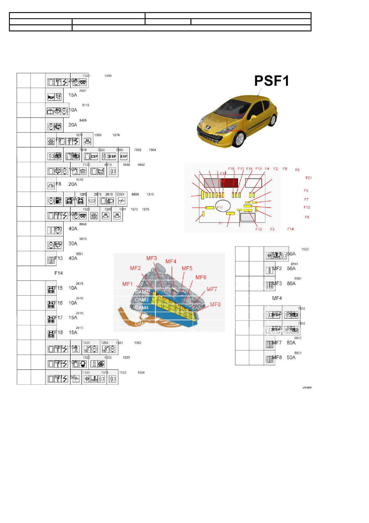 vehicle : 308 OPR : 0 domain General points function allocation of PSF1 fuses component null property of PSA Peugeot Citroën 10/05/2014 page 1 sur 2print item code description information 1010 null starter 1208 null / diesel injection pump 1211 null fuel gauge pump 1233 null turbocharger pressure regulation solenoid valve 1263 null butterfly + EGR electrovalve 1273 null oil breather re-heat resistor 1 1276 null diesel fuel heater 1283 null fuel additive pump 1310 null air flowmeter 1320 null engine ECU / 1361 null turbocharged air heater electrovalve 1 1362 null turbocharged air heater electrovalve 2 1522 null 2-speed cooling fan electrical control unit 1524 null supply cut-off relay / 1630 null automatic gearbox ECU / 1642 null gear lever blocking actuator control relay 2521 null low note horn 2610 null left-hand headlamp 2615 null right-hand headlamp 4010 null engine coolant level switch 4050 null water in fuel sensor 5015 null windscreen wiper motor 5115 null front/rear wash-wipe pump 5405 null headlamp wash pump 6606 null dynamic headlamp beam correction unit 7018 null ABS ECU relay 7020 null anti-lock brake control unit 7122 null power steering electric pump assembly / 7800 null ESP ECU 7802 null ESP relay 7804 null ESP accelerometer gyroscope 8049 null additional air conditioning blower resistor / BFH1 null passenger compartment 1 fuse box 1 BSI1 null built-in systems interface BSR1 null Trailer Fuse Box C001 null diagnostic connector / PSF1 null engine compartment fusebox panel page 2 sur 2print