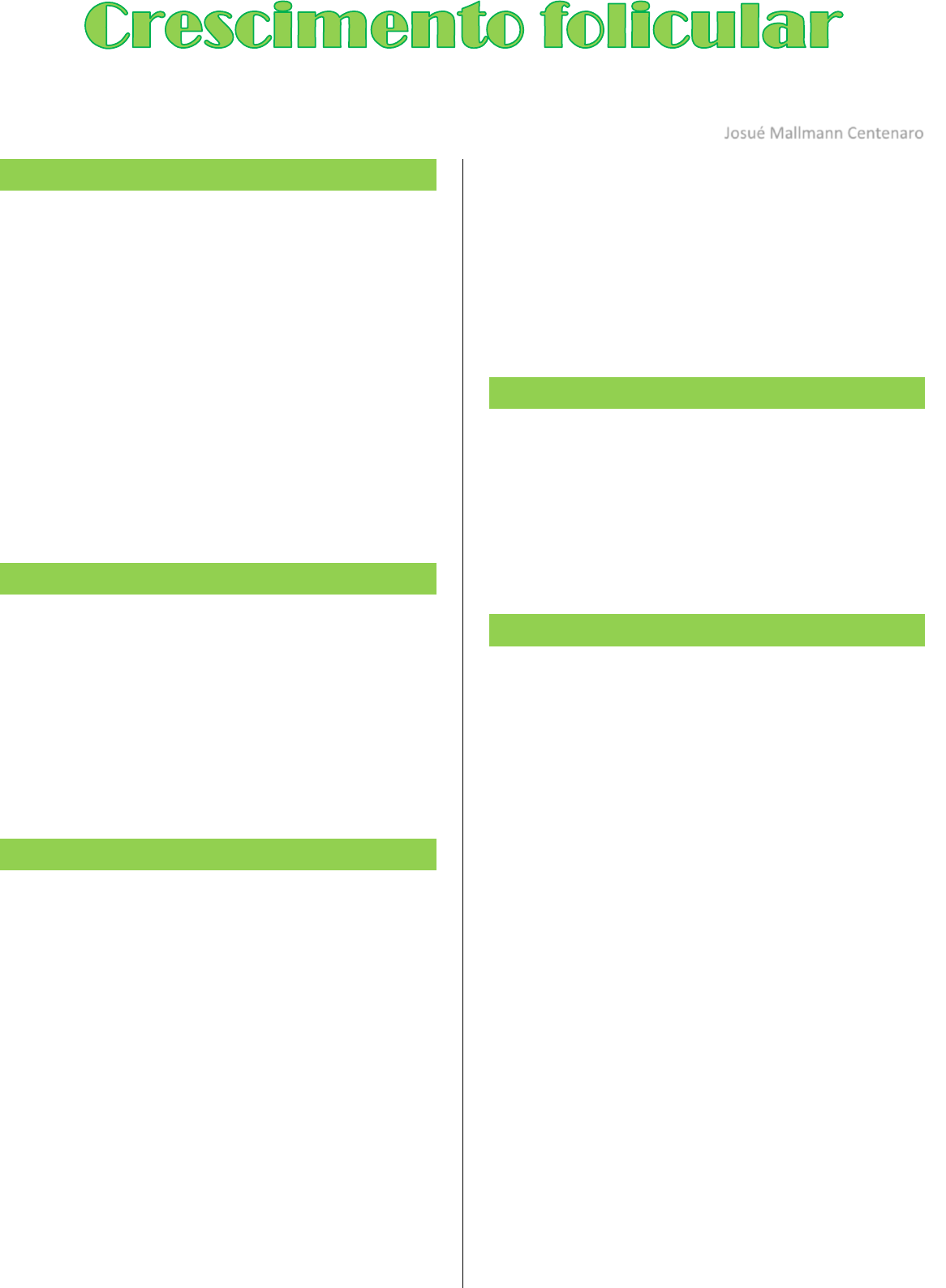 Josué Mallmann Centenaro Ovários Os ovários são as glândulas reprodutivas das fêmeas. Produzem os óvulos, que são transportados pelas tubas uterinas para o útero, onde são fertilizados começando assim o desenvolvimento do feto. Além disso, os ovários são a principal fonte produtora dos hormônios femininos (estrógeno e progesterona). Os ovários estão localizados na pelve, um de cada lado do útero. É nos ovários, também, que estão localizados os folículos ovarianos, eles estão mergulhados no tecido conjuntivo chamado de estroma, o qual mantém fibroblastos dispostos em um arranjo muito característico, formando redemoinhos. Desenvolvimento do ovário Ao redor do primeiro mês de vida embrionária, uma pequena população de células germinativas primordiais (CGP) migra do saco vitelino até os primórdios gonadais, onde as gônadas estão começando a se desenvolver. Nas gônadas, essas células se dividem e se transformam nas ovogônias, que são equivalentes às espermatogônias do testículo. Folículos ovarianos O folículo ovariano consiste em um ovócito envolvido por uma ou mais camadas de células foliculares, também chamadas de células da granulosa. Os folículos primordiais, que foram formados durante a vida fetal, consistem em um ovócito primário envolvido por uma única camada de células foliculares achatadas. A maioria desses folículos se localiza na região cortical, próximo a túnica albugínea (mais externa em relação ao ovário). O ovócito do folículo primordial é uma célula esférica com um grande núcleo esférico e um nucléolo bastante evidente. Essas células estão na etapa da primeira prófase da meiose. Os cromossomos estão em grande parte desenrolados e não se coram intensamente. As organelas citoplasmáticas tendem a se aglomerar próximo do núcleo. Há numerosas mitocôndrias, vários complexos de Golgi e cisternas de retículo endoplasmático. Uma lâmina ou membrana basal envolve as células foliculares e marca o limite entre folículo e o estroma conjuntivo adjacente. Crescimento folicular A partir da puberdade, a cada dia um pequeno grupo de folículos primordiais inicia um processo chamado crescimento folicular, que compreende modificações do ovócito, das células foliculares e dos fibroblastos do estroma conjuntivo que envolve cada um desses folículos. O crescimento folicular é estimulado por FSH secretado pela hipófise. Folículos primários O crescimento do ovócito é muito rápido durante a primeira fase do crescimento folicular. O núcleo aumenta de volume, as mitocôndrias aumentam em número e são distribuídas uniformemente pelo citoplasma; o retículo endoplasmático cresce e os complexos de Golgi migram para próximo da superfície celular. As células foliculares aumentam de volume e se dividem por mitose, formando uma camada única de células cuboides - neste momento, o folículo é chamado de folículo primário unilaminar. As células foliculares continuam proliferando e originam um epitélio estratificado também chamado de camada granulosa, cujas células (células da granulosa) frequentemente se comunicam por junções comunicantes (gap). O folículo é então chamado folículo primário multilaminar ou folículo pré-antral. Uma espessa camada amorfa, chamada zona pelúcida, composta de várias glicoproteínas, é secretada e envolve todo o ovócito. Folículos secundários À medida que os folículos crescem, principalmente em virtude do aumento (em tamanho e número) das células da granulosa, eles ocupam as áreas mais profundas da região cortical. O líquido chamado líquido folicular começa a se acumular entre as células foliculares. Os pequenos espaços que contêm esse fluido se unem e as células da granulosa gradativamente se reorganizam, formando uma grande cavidade, o antro folicular. Esses folículos são chamados folículos secundários ou antrais. O líquido folicular contém componentes do plasma e produtos secretados por células foliculares. Nele são encontrados glicosaminoglicanos, várias proteínas (inclusive proteínas ligantes de esteroides) e altas concentrações de esteroides (progesterona, andrógenos e estrógenos). Durante a reorganização das células da granulosa para formar o antro, algumas células dessa camada se concentram em determinado local da parede do folículo, formando um pequeno espessamento, o cumulus oophorus, que serve de apoio para o ovócito. Além disso, um pequeno grupo de células foliculares envolve o ovócito, constituindo a corona radiata. Este conjunto de células acompanha o ovócito quando este abandona o ovário por ocasião da ovulação. A grande maioria de células foliculares forma uma camada multicelular que reveste internamente a parede do folículo - camada granulosa. Tecas foliculares Durante essas modificações que ocorrem no folículo, o estroma situado imediatamente em sua volta se modifica para formar as tecas foliculares, com duas camadas - a teca interna e a teca externa. As células da teca interna, quando completamente diferenciadas, são poliédricas, têm núcleos arredondados e citoplasma acidófilo, e suas características ultraestruturais são de células produtoras de esteroides. As células da teca externa são semelhantes às células do estroma ovariano, porém se arranjam de modo organizado concentricamente em volta do folículo. O limite entre as duas tecas é pouco preciso, o mesmo ocorrendo com o limite entre a teca externa e o estroma ovariano. O limite entre a teca interna e a camada granulosa, por outro lado, é bem evidente, pois suas células são distintas morfologicamente; além disso, entre a teca interna e a granulosa existe uma lâmina basal. Pequenos vasos sanguíneos percorrem a teca interna, provenientes do estrema circundante, e formam um rico plexo capilar ao redor das células secretoras dessa camada que, como todos os órgãos de função endócrina, é muito vascularizada. Não há 