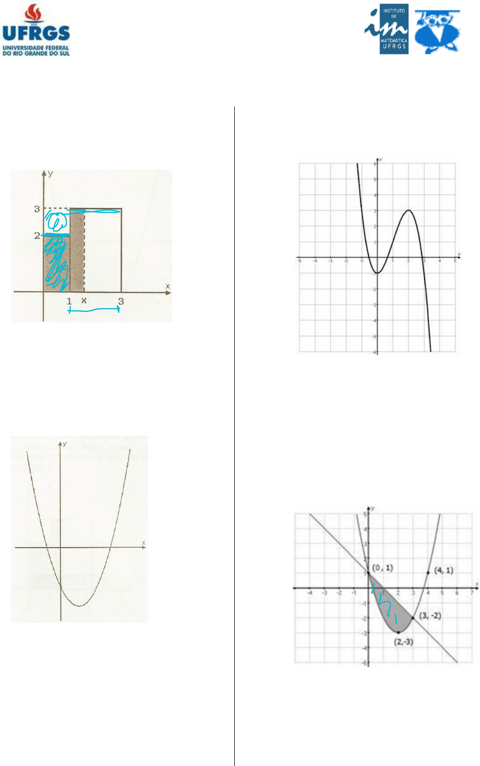 UNIVERSIDADE FEDERAL DO RIO GRANDE DO SUL COLÉGIO DE APLICAÇÃO - INSTITUTO DE MATEMÁTICA LABORATÓRIO DE PRÁTICA DE ENSINO EM MATEMÁTICA Acadêmicos: Bruna Souza, Cássio Volpato, Diego de Freitas, Ezequiel Bampi, Fábio Jardim e Marcelo Souza Lista 4 - Pré-Vestibular 1) (UFRGS/2011) – Para cada número real x, tal que 0≤x≤3, definimos função f tal que f(x)=A(x), sendo A(x) área da superfície sombreada dos retângulos da figura abaixo, limitada pelos eixos coordenados e pela reta vertical de abscissa x. Então, f(x) ≥ 5 se e somente se (A) 0≤x≤1. (B) 1≤x≤2. (C) 1≤x≤3. (D) 4/3≤x≤3. (E) 2≤x≤3. 2) (UFRGS/2011) – O gráfico do polinômio de coeficientes reais p(x)= ax² + bx + c está representado abaixo. Com base nos dados desse gráfico, é correto afirmar que os coeficientes a, b e c satisfazem as desigualdades (A) a > 0; b < 0; c < 0. (B) a > 0; b < 0; c > 0. (C) a > 0; b > 0; c > 0. (D) a > 0; b > 0; c < 0. (E) a < 0; b < 0; c < 0. 3) ( UFRGS/2006) – Considere o gráfico abaixo, que representa uma função polinomial f, de terceiro grau e domínio R. Sendo g(x) = f(x) – 5, o número de raízes da equação g(x) = 0 é (A) 0. (B) 1. (C) 2. (D) 3. (E) 4. 4) (UFRGS/2010) - Considere, na figura abaixo, a região sombreada limitada por uma reta e pelo gráfico de uma função quadrática. As coordenadas dos pontos (x , y) dessa região verificam as desigualdades (A) x² – 4x + 1 ≤ y ≤ 1 – x. (B) x² – x + 4 ≥ y ≥ 1 – x. (C) x² – 2x + 1 ≤ y ≤ 1 – x. (D) x² – 2x + 1 ≥ y ≥ 1 – x. (E) x² – 2x + 1 ≥ y ≥ 1 – x. 5) (UFRGS/2009) - Assinale a alternativa que pode representar o gráfico de f (x) = sen |x|. (A) (B) (C) (D) (E) 6) (PUCRS/2009) - Em uma animação, um mosquitinho aparece voando, e sua trajetória é representada em um plano onde está localizado um referencial cartesiano. A curva que fornece o trajeto tem equação y = 3cos(bx + c). O período é 6π, o movimento parte da origem e desenvolve-se no sentido positivo do eixo das abscissas. Nessas condições, podemos afirmar que o produto 3.b.c é a) 16π b) 9π c) π d) π²/2 e) π/2 7) (UFRGS/2007) Considere a função f que a cada número real x positivo faz corresponder a área do triângulo ABP, como representado na figura abaixo. Entre os gráficos das alternativas, o que melhor representa o gráfico da função f é (A) (B) (C) (D) (E) 8) (UFRGS/2007) - A parábola na figura abaixo tem vértice no ponto (–1, 3) e representa a função quadrática f(x) = ax2 + bx + c. Portanto, a + b é a) -3 b) -2 c) -1 d) 0 e) 1 9) (ENEM 2009) Um posto de combustível vende 10.000 litros de álcool por dia a R$ 1,50 cada litro. Seu proprietário percebeu que, para cada centavo de desconto que concedia por litro, eram vendidos 100 litros a mais por dia. Por exemplo, no dia em que o preço do álcool foi R$ 1,48 foram vendidos 10.200 litros. Considerando x o valor em centavos, do desconto dado no preço de cada litro, e V o valor, em R$, arrecadado por dia com a venda do álcool, então a expressão que relaciona V com x é a) V = 10.000 + 50x – x² b) V = 10.000 + 50x + x² c) V = 15.000 – 50x – x² d) V = 15.000 + 50x – x² e) V = 15.000 – 50x + x² 10- (ENEM 2010) Nos processos industriais, como na indústria de cerâmica, é necessário o uso de fornos capazes de produzir elevadas temperaturas e, em muitas situações, o tempo de elevação dessa temperatura deve ser controlado, para garantir a qualidade do produto final e a economia no processo. Em uma indústria de cerâmica, o forno é programado para elevar a temperatura ao longo do tempo de acordo com a função (7/5)t + 20, para 0 ≤ t < 100 T(t) (2/125)t² – (16/5)t + 320, para t ≥ 100 em que T é o valor da temperatura atingida pelo forno, em graus Celsius, e t é o tempo, em minutos, decorrido desde o instante em que o forno é ligado. Uma peça deve ser colocada nesse forno quando a temperatura for 48 °C e retirada quando a temperatura for 200 °C. O tempo de permanência dessa peça no forno é, em minutos, igual a a) 100 b) 108 c) 128 d) 130 e) 150 GABARITO : 1)E 2)A 3)B 4)A 5)B 6)E 7)C 8)A 9)D 10)D 1. (Uepg-pss 3 2021) Sabendo que o número real m e os números complexos 1z e 2z são as soluções da equação 3x x 10 0, assinale o que for correto. 01) 1 2z z 5. 02) 1 2z z 2. 04) 1 2m z z é um número positivo. 08) 21 2(z z i) é um número imaginário puro. 2. (Unicamp 2020) Sabendo que a é um número real, considere a equação quadrática 22x ax 10 0. Se as soluções dessa equação são números inteiros, o módulo da soma das soluções é igual a a) 3. b) 4. c) 5. d) 6. 3. (Famema 2020) Sabendo-se que o número complexo 2 i é raiz do polinômio 3 2x ax bx 5, em que a e b são números reais, conclui-se que a b é igual a a) 7. b) 5. c) 8. d) 6. e) 4. 4. (Ueg 2020) As raízes do polinômio 3 2P(x) x 2x x 2 são a) 2, i e i b) 2, 1 e 1 c) 2, i e i d) 2, 1 i e 1 i e) 2, 1 i e 1 i 5. (Uece 2020) Sobre a equação 4 2x 5x 36 0, é correto afirmar que a) possui quatro raízes reais. b) não possui raízes reais. c) a soma das suas raízes é igual a 5. d) possui quatro raízes complexas, das quais somente duas são reais. 6. (Espcex (Aman) 2020) Sabe-se que as raízes da equação 3 2x 3x 6x k 0 estão em progressão aritmética. Então podemos afirmar que o valor de k 2 é igual a a) 5 . 2 b) 4. c) 7 . 2 d) 3. e) 9 . 2 FUNDAÇÃO ESCOLA TECNICA LIBERATO SALZANO VIEIRA DA CUNHA POLINÔMIOS - AULA 3 – II TRIMESTRE – MATEMÁTICA – PROFª FRANCINE NUMER NOME: __________________________________________ Nº: _____ TURMA: ________ 7. (Fgv 2020) A equação polinomial 3 2x 14x 56x 64 0 tem raízes reais em progressão geométrica quando colocadas em ordem crescente. A razão desta progressão é: a) 1 2 b) 1 4 c) 1 d) 1 3 e) 1 9 8. (Espcex (Aman) 2020) Se a equação polinomial 2x 2x 8 0 tem raízes a e b e a equação 2x mx n 0 tem raízes (a 1) e (b 1), então m n é igual a