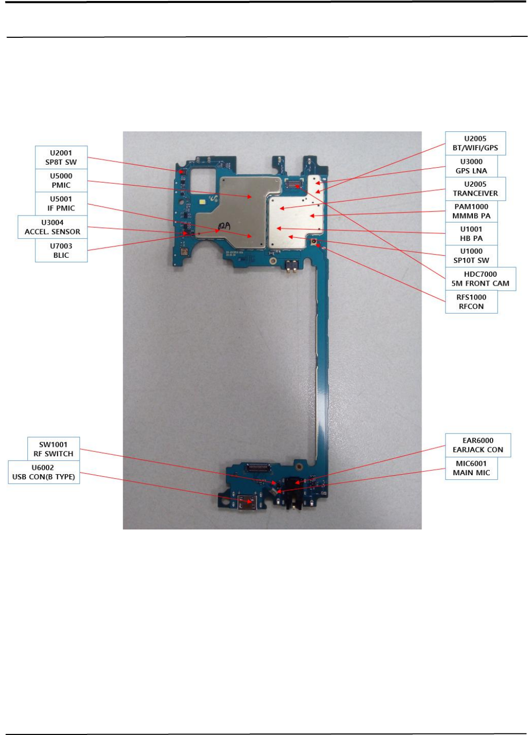Confidential and proprietary-the contents in this service guide subject to change without prior notice Distribution, transmission, or infringement of any content or data from this document without Samsung’s written authorization is strictly prohibited. 8. Level 3 Repair 8-1. Components Layout PBA (TOP SIDE) Confidential and proprietary-the contents in this service guide subject to change without prior notice Distribution, transmission, or infringement of any content or data from this document without Samsung’s written authorization is strictly prohibited. 8. Level 3 Repair PBA (BOTTOM SIDE) MXD83E4W DRX LNA BANK WIPS33232-01 HB PA SKY77621-31 MMMB PA MT6177M TRANCEIVER SP4T TX_TR_OUT_HB SP5T DRX_TR_IN_HB Coupler SUB ANT SM-A013F_REV0.1 RF Block Diagram Main ANT [SM-A013F_REV0.1 RF BAND] (MEA/CIS/AFR/SWA/SEA) 2G : 850/900/1800 3G : W1, W5, W8 LTE FDD : B1,B3,B5,B7,B8,B20,B28 LTE TDD : B38,B40,B41 TX_PA_OUT_B5 TX_PA_OUT_GSMHB TX_PA_OUT_B8 TX_PA_OUT_B20 TX_PA_OUT_B28 RXTD1 HBTD1 HBFD1 HBTD2 DRX_TR_IN_B3 DRX_TR_IN_B1 DRX_TR_IN_LB DRX_B7_LNA_IN DRX_B40_LNA_IN DRX_B38_41_LNA_IN DRX_B3_LNA_IN DRX_B1_LNA_IN DRX_B20_LNA_IN DRX_B28_LNA_IN DRX_B8_LNA_IN DRX_B5_LNA_IN MXD86A7S SP10T TRX_B7 SFDG93AQ902 TRX_B38_41 B7519 TRX_B40 TXO1 HB3G4G_IN HB2G_IN LB2G_IN LB3G4G_IN TX_TR_OUT _B1_B3 TX_TR_OUT _GSMHB TX_TR_OUT _GSMLB TX_TR_OUT_B5 _B8_B20_B28 TX_PA_OUT_B3 TX_PA_OUT_B1 TX_PA_OUT_GSMLB RF1 RF2 RF3 RF4 RF5 RF6 RF7 RF8 RF9 RF10 SFX G50CY902 Duplexer PRX1 SFHG40AA002 MXD8921HS SAYEY1G74BC0B3K Duplexer PRX2 PRX3 PRX4 PRX5 PRX6 PRX7 PRX8 PRX_TR_IN_B1 PRX_TR_IN_B3_DCS PRX_TR_IN_B8_G900 PRX_TR_IN_B5_G850 PRX_TR_IN_B28 PRX_TR_IN_B38_40_41 PRX_TR_IN_B7 PRX_TR_IN_B20 BGS12P2L6 SP2T SFX836DYJ02 Duplexer B1250 Duplexer SAYEY897MBG0F3K Duplexer SAYEY806MBA0B3K Duplexer SAYRZ2G53BB0E3K Duplexer SFHG56BA002MXD8921HS MXD8921HS RFS1000 TXDET1 MXD8680S SP8T RF1 RF2 RF3 RF4 RF5 RF6 RF7 RF8 DRX1 DRX2 DRX3 DRX4 R F IC _ P D E T _ IN SFRM81GBB02 SFHG52AA002 SFH806BA002 SFHG56BA002 B7502 SAWFG1G84AA0F3K 2020.04.17 SAMSUNG CONFIDENTIAL SM-A013F_REV0.1 BB Block Diagram 2020.04.17 SAMSUNG CONFIDENTIAL MT6739 AP LM36274YFFR BLIC BLIC_I2C_SCL_1P8/ BLIC_I2C_SDA_1P8 5.31" HD+ TFT-LCD LCD_PWM_CON LCD_BL_EN LCD_RST TP_IO_SPI_ CS_N/MOSI/CLK/MISO LCD_ID LCD_DET MIPI_DSI0_D0~3_N/P TSP_INT LCD_BC_CTRL 5M FRONT CAM 8M REAR CAM FCAM_MIPI_D0~1_N/P FCAM_MIPI_CLK_N/P FCAM_MCLK FCAM_RST_N RCAM1_MIPI_D0~3_N/P RCAM1_MIPI_CLK_N/P RCAM_SENSOR_I2C_SCL_1P8/ RCAM_SENSOR_I2C_SDA_1P8 FCAM_SENSOR_RCAM_A FEEP_I2C_SDA_1P8/ FCAM_SENSOR_RCAM_A FEEP_I2C_SCL_1P8 RCAM_SENSOR_I2C_SCL_1P8/ RCAM_SENSOR_I2C_SDA_1P8 FCAM_SENSOR_RCAM_ AFEEP_I2C_SDA_1P8/ FCAM_SENSOR_RCAM_ AFEEP_I2C_SCL_1P8 AP7341D-12FS4-7R LDO ET53028YB LDO VDD_RCAM_DVDD_1P2 VDD_RCAM_AVDD_2P8 SPK AMP EARJACK CONN MT6357 PMIC EAR_OUT_L/R EAR_OUT_FB EAR MIC EAR_L_DET EAR_MIC_3.5_P EAR_MIC_P/N ACCDET1 MAIN MIC MAIN_MIC_P/N SPK_AMP_I2C_SCL_1P8/ SPK_AMP_I2C_SDA_1P8 SPK_I2S3_DI/O SPK_I2S3_BCLK/WS SPK_AMP_RST MEMORY F : 1GB+16GB G : 2GB+16GB VOL UP VOL DN POWER KEY VOL_UP VOL_DN POWER_KEY_SW SIM/SD CARD SIM1/2_RST SIM1/2_CLK SIM1/2_DATA T_FLASH_D(0)~(3) T_FLASH_CMD T_FLASH_CLK SIM_DET TFLASH_DET S2MU005X03-6030 IF PMIC USB CONN USB_D_P/N USB_ID FG_I2C_SCL_1P8/ FG_I2C_SDA_1P8 IF_I2C_SCL_1P8/ IF_I2C_SDA_1P8 IFPMIC_MRSTB IF_PMIC_INT USB_AP_D_P/N FG_ALERT_N CAM_FLASH_EN CAM_TORCH_EN RTC32K_CK SRCLKENA0~1 SYSRSTB WATCHDOG PWRAP_SPI0_MISO/MOSI/CK/CS_N AUD_SYNC_MISO/MOSI AUD_CLK_MISO/MOSI AUD_DAT_MISO/MOSI 0~1 AP JTAG AP_UART_TXD/RXD CAM_CORE_EN RCAM_A2P8_EN SENSOR PART PROXY SENSOR ACCEL. SENSOR PROXY_INT SENSOR_SCL_1P8/ SENSOR_SDA_1P8 SENSOR_SCL_1P8/ SENSOR_SDA_1P8 ET51518YB LDO ET51533YB LDO VDD_SENSOR_1P8 SENSOR_LDO_EN SENSOR_LDO_1P8_EN ET51518YB LDO VDD_LCD_1P8 LCD_EN_1P8 VDD_MOTOR_3P3 MOTOR MT6625L BT/WIFI/GPS SM-A013F_REV0.1 Connectivity Block Diagram FM ANT 2020.04.17 SAMSUNG CONFIDENTIAL MT6739 AP WIFI ANT SAFFB2G45MA0F3K WB_RF_2G WB_RXIP/N WB_RXQP/N GPS ANT SFHG89BF302 SFHG89BF302 GPS_RF_IN WB_TXIP/N WB_TXQP/N GPS_RXIP/N GPS_RXQP/N BGU6009 LNA GPS_LNA_EN AN T1 00 1 ANT1002 AN T1 00 3 AN T2 00 1 AN T2 00 2 AN T3 00 0 AN T3 00 1 C1000 C1001 C1002 C1003 C1 00 4 C1 00 5 C1006 C1007 C1008 C1009 C1010 C1011 C1012 C1013 C1014 C1015 C1016 C1017 C1018 C1 01 9 C1 02 0 C1021 C1022 C1023 C1024 C1025 C1026 C1 02 7 C1 02 8 C1 02 9 C1030 C1031 C1032 C1033 C1034 C1035 C1037 C1038 C1039C1040 C1 04 1 C1 04 2 C1 04 3 C1044 C1045 C1047 C1048 C1049 C1050 C1051 C1 05 2 C1053 C1054 C1055 C1056 C1057 C1058 C1 05 9 C1060 C1 06 1 C1062 C1063 C1 06 4 C1065 C1066 C1067 C1069 C1070 C1071 C1 07 2 C1073 C1074 C1075 C1 07 6 C1 07 7 C1 07 8 C1079 C1 08 0 C1081 C1082 C1083 C1084 C1085 C1086 C1087 C1088 C1089 C1 09 0 C1091 C1092 C1093 C1094 C1 09 5 C1096 C1098 C1099 C1100 C1103 C1104 C1 11 1 C1117 C1 11 9 C1125 C1 12 7 C1 12 8 C1 13 2 C1135 C1148 C1 15 2 C1 16 2 C1163 C1176 C2 00 0 C2001 C2002 C2 00 3 C2004 C2 00 5 C2 00 6 C2 00 7 C2008 C2 00 9 C2010 C2011 C2012 C2013 C2014 C2 01 5 C2016 C2017C2018 C2019 C2020 C2 02 1 C2 02 2 C2023 C2024 C2025 C2026C 20 27 C2 02 8 C2029 C2030 C2031 C2 03 2 C2033 C2 03 4 C2035 C2 03 6 C2037 C2038 C2039 C2040 C2 04 1 C2042 C2043 C2044 C2045 C2046 C2047 C2048 C2049 C2050 C2051 C2052 C2053 C2 05 4C2055 C2056 C2057 C2058 C2059 C2060 C2061 C2 06 3 C2064 C2065 C2 06 6 C2067 C2068 C2069 C2 07 0 C2071 C2072 C2089 C2 09 1 C2092 C2093 C2094 C2097 C2099 C2105 C3000 C3 00 1 C3 00 2 C3003 C3004 C3005C3006 C3007 C3 00 8 C3 00 9 C3 01 0 C3 01 1 C3 01 2 C3 01 3 C3014 C3 01 5 C3016 C3017 C3018 C3019 C3020 C3 02 3 C3024 C3025 C3026 C3 02 7 C3028 C3 02 9 C3 03 0 C3031 C4 00 0 C4 00 1 C4002 C4003 C4004 C4007 C4017 C4 01 8 C4 02 1 C4 02 5 C4 03 0 C4033 C4034 C4037 C4038 C4055 C4058 C4059 C4060 C4061 C4063 C4065 C5001 C5 00 2 C5004 C5005 C5006 C5007 C5 00 8 C5012 C5013 C5014 C5 01 5 C5 01 6 C5017 C5020 C5021 C5022 C5023 C5 02 4 C5025 C5026 C5027 C5028 C5 02 9 C5030 C5031 C5032C5033 C5034 C5035 C5036 C5040 C5041 C5042 C5043 C5047 C5048 C5049 C5050 C5 05 1 C5052 C5 05 5 C5056 C5 05 8 C5 05 9 C5060 C5061 C5062 C5063 C5066 C5068