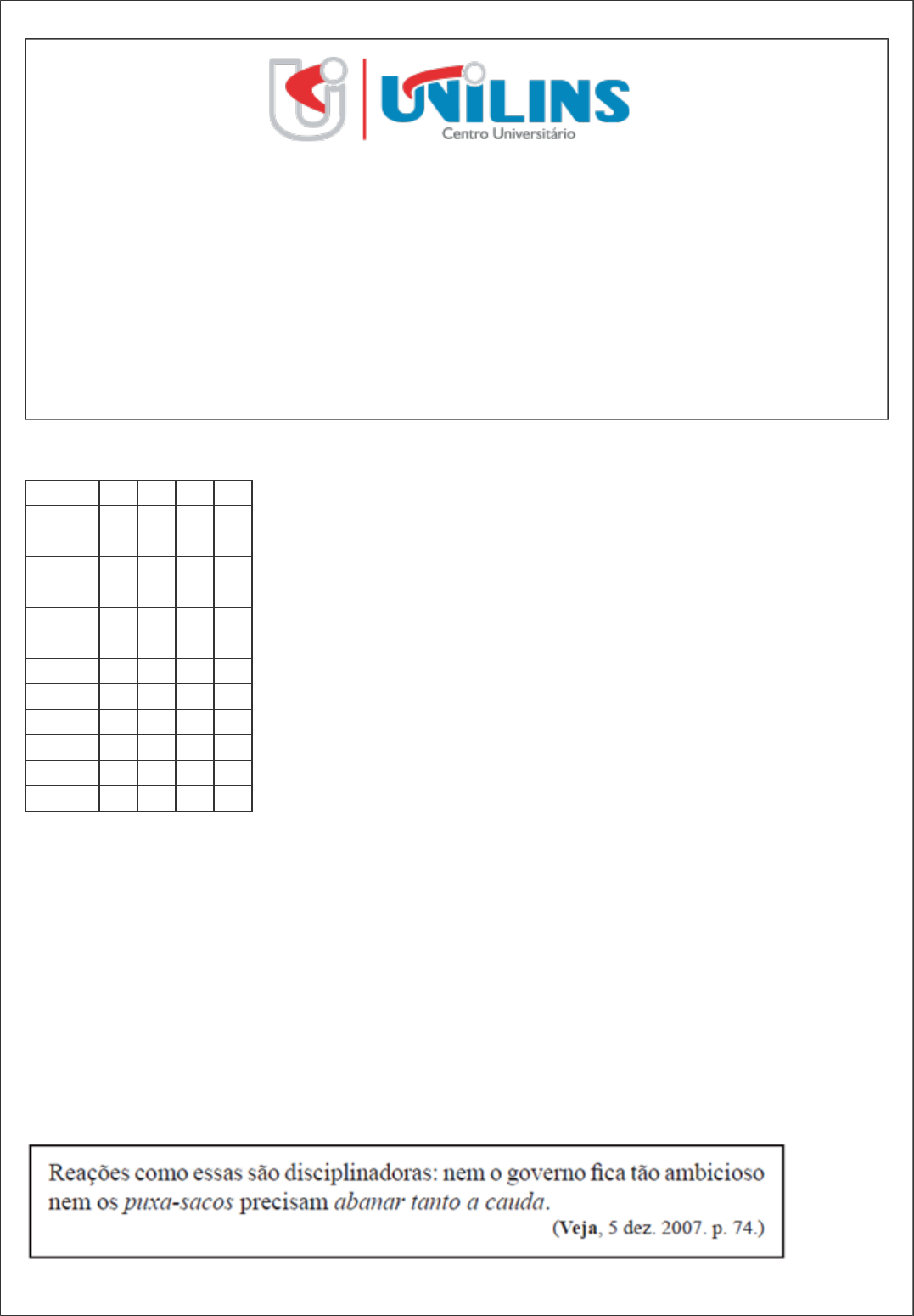 Requisição: 3632996 Matricula: 647189 Data: 27/07/2021 14:57 Página: 1/5 Prova presencial regular Curso: 48 MESES - BACHARELADO EM ADMINISTRAÇÃO - UNILINS EAD Módulo: 1 Grupo: 199 Município: SÃO PAULO - SP Disciplina(s): 100750 - PRÁTICA TEXTUAL EM LÍNGUA PORTUGUESA Nome: 647189 - FERNANDA APARECIDA OLMEDILHA DE BARROS Data: ___/___/_________ Assinatura do aluno: ________________________________________________________ Preencha o gabarito abaixo com X na coluna correta. Atente para a coluna de numeração e das alternativas. Questões A B C D 1 2 3 4 5 6 7 8 9 10 11 12 1 ) Em qual das alternativas a seguir temos um exemplo de substituição lexical por sinônimo? A ) A casa não era muito grande, mas representava um lar para seus moradores. B ) A casa não era muito grande, mas fora pintada recentemente. C ) A casa não era muito grande, mas abrigava bem seus moradores. D ) A casa não era muito grande e lá, no entanto, todos eram muito felizes. 2 ) Assinale a alternativa que apresenta opções mais adequadas para substituir as expressões em itálico, tendo em vista um vocabulário mais formal. A ) Subalternos - portar-se tão servilmente Requisição: 3632996 Matricula: 647189 Data: 27/07/2021 14:57 Página: 2/5 B ) Oposicionistas - abanar excessivamente a cauda C ) Bajuladores - portar-se tão servilmente D ) Aduladores - abanar o rabo 3 ) No fragmento a seguir, qual metarregra não foi empregada adequadamente? A ) Metarregra da não contradição. B ) Metarregra da progressão. C ) Metarregra da relação. D ) Metarregra da repetição. 4 ) Entre as alternativas abaixo, assinale a que apresenta sequências argumentativas. A ) Editorial. B ) Instruções de montagem. C ) Bula de remédio. D ) Fábula. 5 ) Leia atentamente os textos a seguir. Requisição: 3632996 Matricula: 647189 Data: 27/07/2021 14:57 Página: 3/5 Agora, assinale a afirmativa correta. A ) Apesar de subverter o texto fonte ("Poema de sete faces"), constituindo, assim, uma paródia, o poema de Adélia Prado presta-lhe uma homenagem. B ) Comparando os poemas de Drummond e de Adélia Prado, percebemos que o segundo "copia" o primeiro, configurando um caso de plágio. C ) Tanto a paráfrase quanto a paródia mantém a mesma linha argumentativa presente no texto fonte. D ) O poema "Com licença poética" foi elaborado estabelecendo intertextualidade das semelhanças. 6 ) Após a leitura do fragmento abaixo, assinale a alternativa correta. A ) Uma citação e o desenvolvimento por exemplificação compõem o segmento apresentado. B ) No segmento, temos uma declaração inicial e seu desenvolvimento por fundamentação da proposição. C ) O segmento de parágrafo anterior é construído a partir de alusão histórica. Requisição: 3632996 Matricula: 647189 Data: 27/07/2021 14:57 Página: 4/5 D ) O segmento anterior exemplifica a construção de parágrafo por omissão de dados identificadores. 7 ) Indique a sequência textual predominante no texto a seguir. A ) Argumentativa. B ) Dialogal. C ) Descritiva. D ) Narrativa. 8 ) Sobre a intertextualidade é possível afirmar que A ) é um fenômeno que pode ocorrer em todos os gêneros textuais verbais - orais ou escritos -, mas pouco comum em textos não verbais. B ) é um importante fator de coerência, produzindo, assim, a legibilidade do texto. C ) só ocorre quando é possível recuperar o texto fonte de forma explícita. D ) na leitura de um texto a intertextualidade é um fator muito importante, mas na produção esse fator já não é tão significativo. 9 ) Assinale a alternativa que apresenta o melhor vocábulo para completar o enunciado a seguir. A ) recomendou. B ) prometeu. Requisição: 3632996 Matricula: 647189 Data: 27/07/2021 14:57 Página: 5/5 C ) ordenou. D ) anunciou. 10 ) Em qual das alternativas a seguir temos um exemplo de substituição lexical por elipse? A ) Nova linha X. O produto que você sempre sonhou em ter. O produto que a concorrência nunca conseguiu imitar. B ) Nova linha X. O produto que você sempre sonhou em ter. E mercadoria com as melhores vantagens. C ) Nova linha X. O produto que você sempre sonhou em ter. E a qualidade que você esperava. D ) Nova linha X. O produto que você sempre sonhou em ter. E a concorrência também. 11 ) Sobre as várias formas de intertextualidade, é correto afirmar que A ) a intertextualidade explícita ocorre quando não se faz menção ao texto fonte. B ) a intertextualidade implícita ocorre quando não se faz menção ao texto fonte. C ) a intertextualidade das semelhanças ocorre quando não é possível recuperar o texto que serviu de inspiração para a nova produção. D ) a intertextualidade das diferenças ocorre quando é possível recuperar o texto que serviu de inspiração para a nova produção. 12 ) A partir do fragmento a seguir, assinale a alternativa correta. A ) Nesse fragmento, temos um exemplo de coesão por associação. B ) Roçadeiras e campo promovem a coesão por estabelecerem paralelismo sintático. C ) Os vocábulos roçadeiras e campo se aproximam por elementos coesivos. D ) No período dado, a coesão ocorre por repetição propriamente dita.