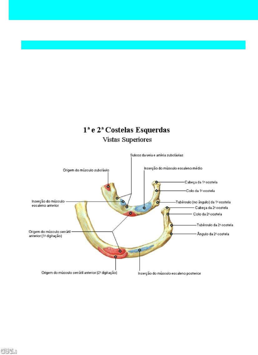 Anatomia – prática com explicações. OSSOS, ARTICULAÇÕES E MÚSCULOS DO TÓRAX E ABDOME COSTELAS (I-XII) Identificar as costelas: Verdadeiras (I-VII) Falsas (VIII-X) Flutuantes (XI-XII) 1. Cartilagem costal – todas as costelas possuem cartilagem costal. 2. Cabeça da costela 3. Colo da costela 4. Corpo da costela Sempre que aparecer a palavra JUGULAR associar a pescoço 5. Tubérculo da costela 6. Sulco da costela ESTERNO 7. Manúbrio do esterno: articula o primeiro par de costelas. 8. Incisura clavicular 9. Incisura jugular: pescoço 10. Ângulo do esterno (de Louis): é uma linha abaixo do manúbrio. 11. Corpo do esterno 12. Processo xifoide: não é um ponto de fixação: CAIXA TORÁCICA Identificar: Aberturas superior e inferior do tórax Arco costal Espaço intercostal Ângulo infraesternal (de Charpy): § Quando possui uma abertura menor que 90° = longilíneo § Quando possui uma abertura igual a 90° = medilíneo § Quando possui uma abertura maior que 90° = brevilíneo ARTICULAÇÕES DO TÓRAX Articulações costovertebrais: 13. Articulação da cabeça da costela (entre cabeça da costela e corpo vertebral) 14. Articulação costotransversária (entre tubérculo da costela e processotransverso) 15. Articulações esternocostais (entre esterno e cartilagens costais) 16. Articulações costocondrais (entre costelas e cartilagens costais) 17. Sínfise (sincondrose) manubrioesternal: possui essa variação de nome, apesar de ambas (sínfise e sincondrose) pertencerem a classe de articulações cartilagíneas e a primeira não calcificar enquanto a segunda calcifica, pois na velhice esta articulação possui a tendência de calcificação. 18. Sínfise xifosternal MÚSCULOS DO TÓRAX 19. M. peitoral maior 20. M. peitoral menor: logo abaixo do músculo peitoral maior 21. M. serrátil anterior: é responsável pelo movimento da escápula, possui 9 feixes que se fica na escápula e costela. 22. M. subclávio: abaixo do osso da clavícula. 23. Mm. intercostais externos 24. Mm. intercostais internos 25. M. diafragma (partes: lombar, costal e esternal) 26. Pilar direito do diafragma 27. Pilar esquerdo do diafragma 28. Centro tendíneo 29. Hiato aórtico 30. Hiato esofágico: lado esquerdo 31. Forame da veia cava: lado direito MÚSCULOS DO ABDOME 32. M. reto do abdome: 33. Intersecções tendíneas: fibras verticais 34. Bainha do músculo reto do abdome (lâmina anterior e lâmina posterior): fixada na linha alba Estão entre as costelas e se diferenciam na direção das fibras, o segundo termina no colo da costela. Se localiza entre o hiato aórtico 35. M. oblíquo externo do abdome: fibras mão no bolso 36. M. oblíquo interno do abdome: fibras mão no coração 37. M. transverso do abdome 38. Fascia transversalis 39. Linha alba 40. Canal inguinal: é um buraco por onde passa a linha inguinal. 41. Ligamento inguinal 42. M. quadrado do lombo: se localiza na parte posterior (costas). OBS.: o canal vertebral possui vários forames, um forame entra em contato com o outro formando este canal. OSSOS, ARTICULAÇÕES E MÚSCULOS DO DORSO COLUNA VERTEBRAL 43. Canal vertebral 44. Forames intervertebrais: onde passam os nervos, localizado entre uma vértebra e outra. Vai do sacro ao crânio. CARACTERÍSTICAS DE UMA VÉRTEBRA TÍPICA 45. Corpo vertebral 46. Forame vertebral 47. Arco vertebral 48. Processo espinhoso 49. Processo transverso 50. Processo articular superior 51. Processo articular inferior IDENTIFICAR AS VÉRTEBRAS CERVICAIS (C I – C VII) Pontas que saem dos ossos, a primeira é posterior e a segunda é lateral. Encaixam-se formando articulação dos processos articulares ou articulação zigoapofisária. 52. Forame transversário (ou transverso): não possui corpo vertebral, em seu lugar há um arco ATLAS (C I) 53. Face articular superior: redonda 54. Face articular inferior: achatada 55. Arco anterior do atlas: fóvea pequena 56. Fóvea do dente 57. Arco posterior do atlas ÁXIS (C II) 58. Dente do áxis: encaixa-se no corpo vertebral do Atlas e é responsável pela rotação da cabeça. IDENTIFICAR AS VÉRTEBRAS TORÁCICAS (T I – T XII) 59. Fóvea costal superior 60. Fóvea costal inferior 61. Fóvea costal do processo transverso IDENTIFICAR AS VÉRTEBRAS LOMBARES (L I – L V) 62. Processo costiforme: tem localização costal, é o prolongamento dos processos das vértebras costais. Possui o processo transverso longo e fino Exclusividade dessas vértebras, articulam a costela. IDENTIFICAR O SACRO (S I – S V) 63. Base do sacro 64. Promontório sacral: SI 65. Processo articular superior Parte lateral 66. Face auricular: lisa em formato de orelha. 67. Tuberosidade sacral Face pélvica 68. Forames sacrais anteriores Face dorsal 69. Crista sacral mediana: processo espinhoso 70. Forames sacrais posteriores: lateral a crista 71. Canal sacral: medula espinal 72. Hiato sacral: abertura que afunila o canal IDENTIFICAR O CÓCCIX (CO I – CO IV) ARTICULAÇÕES DA COLUNA VERTEBRAL Articulações Cartilagíneas 73. Sínfise intervertebral (Disco intervertebral) Face posterior = irregular e convexa Face anterior = lisa e côncava Articulações Sinoviais 74. Articulação atlantoaxial mediana (tipo trocóidea): em forma de pivô, permite a rotação Atlas e Axis. 75. Articulação atlantoaxial lateral (tipo plana): responsável pelo deslizamento. 76. Articulação dos processos articulares (tipo plana) 77. Articulação lombossacral (tipo plana) OBS.: vértebra acima = suprajacente e vértebra abaixo = infrajacente. LIGAMENTOS DA COLUNA VERTEBRAL 78. Ligamento longitudinal anterior 79. Ligamento longitudinal posterior 80. Ligamentos interespinais: entre os processos espinhosos 81. Ligamento supraespinhal: parte de fora, passa sobre os processos espinhosos 82. Ligamentos intertransversários 83. Ligamentos amarelos (entre as lâminas dos arcos vertebrais) MÚSCULOS DO DORSO 84. M. trapézio (partes descendente, transversa e ascendente):abre para cima 85. M. latíssimo do dorso: abre 