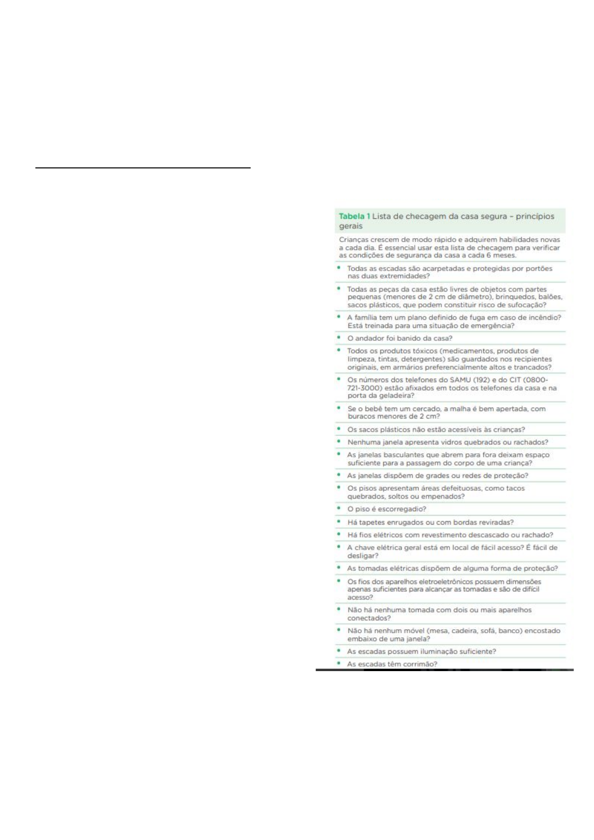 Segurança da criança 01- Compreender os elementos que compõem a segurança da criança nos ambientes domésticos, trânsito, lazer e meio rural SEGURANÇA NO AMBIENTE DOMÉSTICO O maior número de eventos traumáticos com crianças pequenas, até o fim da idade escolar, acontece no seu próprio domicílio No Brasil, segundo o Datasus, em 2014 Cerca de 6% de todas as hospitalizações de crianças até 9 anos de idade foram por causas externas (307/100.000 habitantes) As quedas foram responsáveis por 39% desses casos Um número 4 vezes maior que o das internações por traumatismos de trânsito e por choque elétrico E 10 vezes maior do que por queimaduras e intoxicações As quedas também predominam entre os atendimentos de emergência, correspondendo a cerca de 2/3 dos atendimentos Determinados tipos de eventos traumáticos são característicos de certas idades 1º ANO Asfixias e quedas predominam Seguidas por queimaduras e aspiração de corpo estranho 2º ANO As quedas passam a liderar o ranking Asfixias, queimaduras e afogamentos em menores de 5 anos PRÉ-ESCOLARES Atropelamento, queimaduras e intoxicações Ocorrem principalmente na cozinha A prevenção de lesões que ocorrem no lar Segundo os especialistas, apoia-se na orientação e na conscientização dos pais Para que promovam mudanças no seu comportamento, no sentido de uma supervisão mais efetiva e da eliminação dos riscos dentro de casa Além das orientações para tornar a casa mais segura, ainda é recomendável educar as famílias sobre medidas específicas de prevenção dos diferentes tipos de injúrias, mesmo que se trate de proteção ativa, menos efetiva 1- PARA PREVENIR ASFIXIA Alimentar a criança sentada à mesa ou em cadeira alta Não permitir brincar ou correr durante as refeições Cortar os alimentos em pedaços pequenos Ter cuidado com objetos muito pequenos, como grãos de cereais, caroços de frutas, gomas de mascar, balas duras, botões, moedas, baterias em disco e outros Brinquedos devem ser apropriados para cada idade e não devem destacar partes pequenas Não usar talco perto de crianças Não usar cordão ou presilha de chupeta ao redor do pescoço Não deixar sacos plásticos ao alcance das crianças Usar lençóis, mantas e cobertores bem presos ao colchão 2- PARA PREVENIR AFOGAMENTOS Jamais deixar a criança sozinha durante o banho, principalmente quando estiver utilizando banheira Nunca deixar baldes, bacias ou tanques com água ao alcance das crianças Frequentar piscinas somente com vigilância contínua 3- PARA PREVENIR QUEDAS Banir o uso de andadores Instalar grades ou redes de proteção nas janelas de andares altos Instalar portões com tranca em escadas 4- PARA PREVENIR QUEIMADURAS Testar a temperatura da água do banho com o cotovelo Sempre verificar a temperatura de mamadeiras e outros alimentos quentes Não manusear líquidos ou alimentos quentes com a criança no colo Esconder fósforos, velas e isqueiros Evitar o uso de roupas de tecidos sintéticos que sejam facilmente inflamáveis Não fumar dentro da casa 5- PARA PREVENIR CHOQUES ELÉTRICOS Não ligar vários aparelhos em uma mesma tomada Não deixar soquete sem lâmpada 6- PARA EVITAR INTOXICAÇÕES Não utilizar medicamentos sem orientação médica Nunca utilizar produtos clandestinos Seguir as orientações do fabricante para o uso adequado dos produtos Preferir produtos químicos que tenham embalagens com tampa de segurança para crianças Manter os produtos em sua embalagem original e nunca reutilizar frascos Evitar o uso indiscriminado de inseticidas Conhecer bem as plantas ornamentais da casa e dos jardins E não manter dentro de casa plantas que são consideradas tóxicas, como comigo-ninguém-pode, costela-de-adão, saia branca, espada-de- -são-jorge, chapéu de Napoleão e outras SEGURANÇA NO TRÂNSITO No mundo inteiro, o trânsito ocasiona, a cada ano, mais de 1 milhão de mortes E cerca de 10 milhões de lesões incapacitantes e permanentes A grande maioria desses casos está nos países pobres, sendo os pedestres e as crianças os grupos mais vulneráveis Traumatismos de pedestres e ocupantes de veículos automotores predominam como causa de morte a partir da idade pré-escolar FATORES DIRETAMENTE RELACIONADOS AO AUMENTO DO NÚMERO DE MORTES Aumento progressivo do número de automóveis circulantes Crescimento urbano e industrial da população Falta de cultura popular voltada para a segurança Impunidade Falta de legislação efetiva Más condições das vias de circulação EM RELAÇÃO À CRIANÇA Falta de noção de perigo Sua curiosidade Autonomia Controle motor ainda em desenvolvimento Inexperiência Falta de preocupação com seu corpo Vontade de imitar os mais velhos → A energia envolvida é a mecânica, com transmissão de energia cinética maior do que a capacidade da criança de absorvê-la O pediatra conheça os recursos de segurança desenvolvidos para minimizar os efeitos da transmissão de energia cinética nos diferentes tipos de trauma A) PRIORIDADE PARA A SEGURANÇA DE CRIANÇAS E JOVENS PEDESTRES A criança e o adolescente têm alto risco de atropelamento FATORES DE RISCO PARA ATROPELAMENTO Meninos Faixa etária de 3 a 12 anos Número de ruas que a criança atravessa Atravessar a rua fora da faixa de pedestre Horários escolares Moradias sem quintal ou área de recreação Crianças na situação de pedestres que correm riscos maiores de sofrerem traumas graves e até morte geralmente vivem em áreas - Urbanas densamente povoadas - Economicamente desfavorecidas MENORES DE 5 ANOS → São atropeladas em geral por veículos a motor dando marcha à ré em vias de circulação Menores de 10 anos jamais devem enfrentar qualquer tipo de trânsito sem a supervisão direta de um adulto Uma vez que os perigos do trânsito excedem suas habilidades físicas, cognitivas, sensoriais e de comportamento B) PRIORIDADE PARA A SEGURANÇA DE CRIANÇAS E JOVENS PASSAGEIROS DE AUTOMÓVEIS De acordo com esp