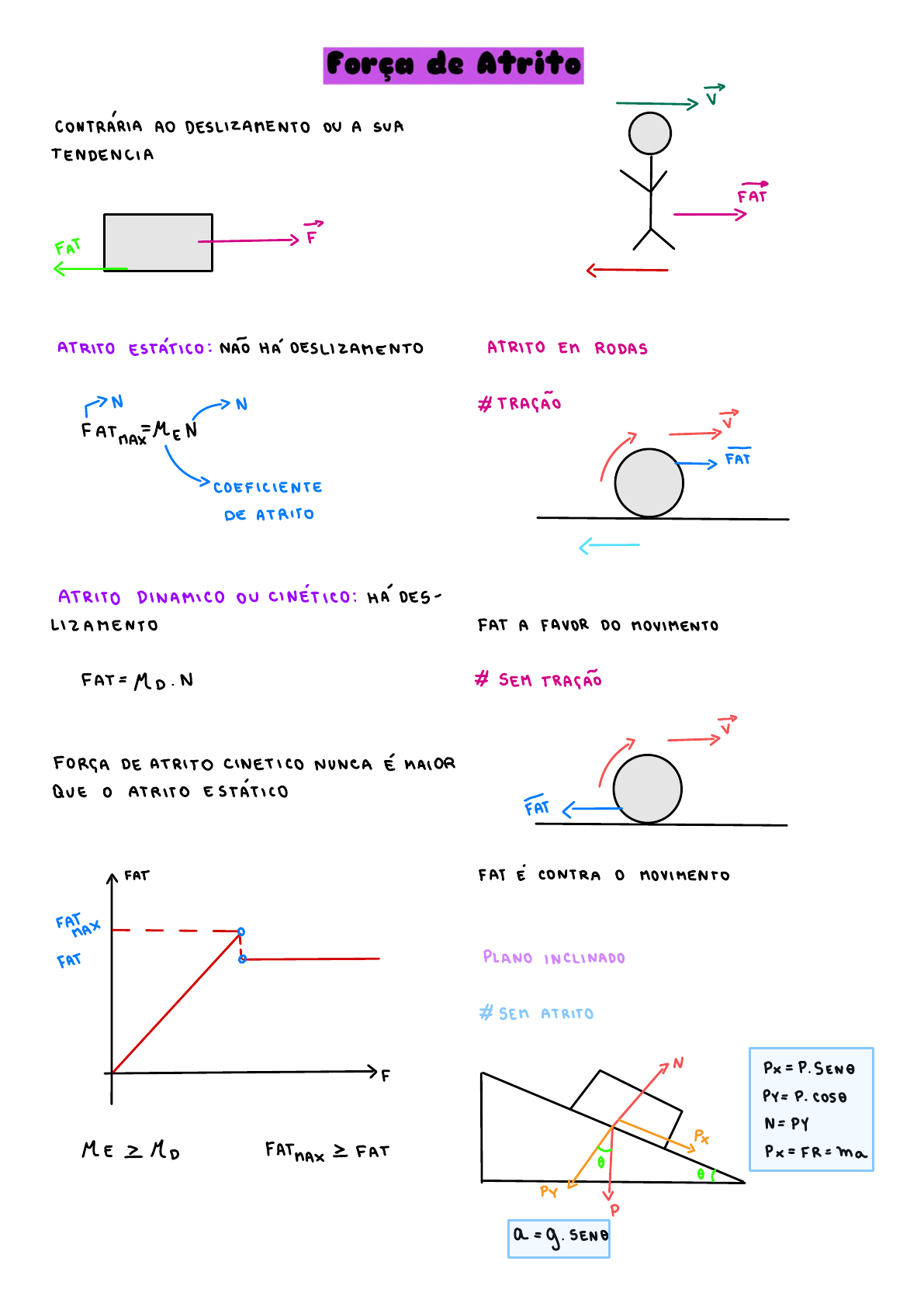 J > CONTRÁRIA AO DESLIZAMENTO OU A SUA TENDENCIA FATO FAT E > ATRITO ESTÁTICO : NAÕ HÁ DESLIZAMENTO ATRITO EM RODAS N N TRAÇÃO j > FATMA MEN FAT COEFICIENTE DE ATRITO ATRITO DINAMICO OU CINÉTICO : HÁ DESLIZAMENTO FAT A FAVOR DO MOVIMENTO FAT _- MD . N SEM TRAÇÃO J > FORÇA DE ATRITO CINETICO NUNCA É MAIOR QUE O ATRITO ESTÁTICO FÃT FAT FAT É CONTRA O MOVIMENTO FAT PLANO INCLINADO "" . SEM ATRITO N Px =P . SENO PY=P. COSO N -- PY Px ME ZMD FATMA✗ ZFAT Px _- FR _- ma - - PY P A = G. SENO COM ATRITO N FAT Px PY NA IMINENCIA DO DESLIZAMENTO N = py =P. COSO FATMA Px =P. SENO E- Tgo ATRITO CI FLUIDOS VELOCIDADE TERMINAL af Vo - O P FAT af µ FATLP P FAT FAT =P P