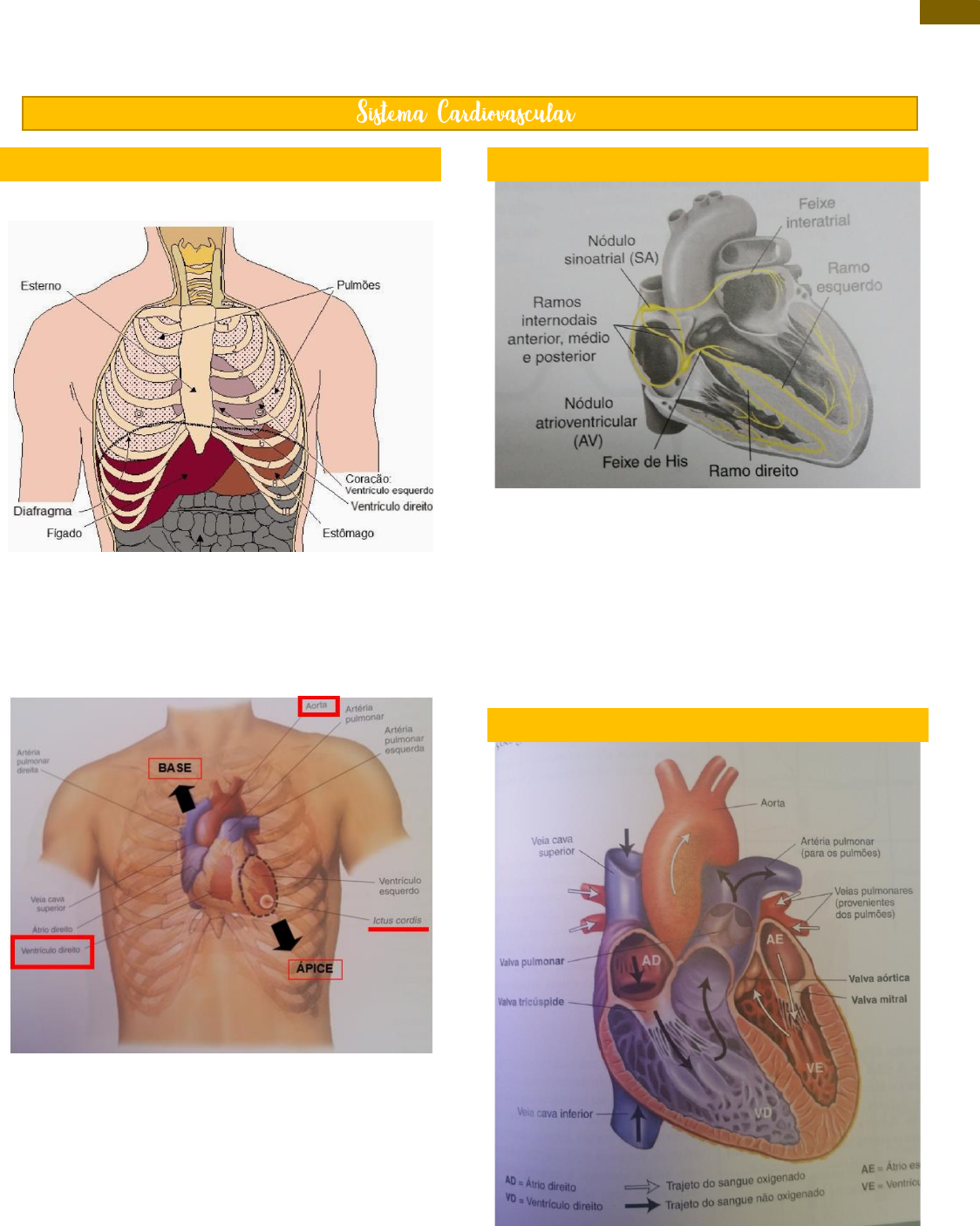 1 Aline David – ATM 2025/B SEMIOLOGIA – AULA 8 REVISANDO ANATOMIA ❖ Projeções superficiais do coração. - 5º espaço intercostal → topografia do ventrículo direito e mais posterior o ventrículo esquerdo. - O ápice do coração fica em torno do 5º espaço intercostal. - A base do coração é composta pelos grandes vasos -- : a. pulmonar direita, a. pulmonar esquerda, cajado da aorta, v. cava superior. - O ápice do coração é composto pelo ventrículo esquerdo. A pontinha do coração é o ictus cordis. SISTEMA DE CONDUÇÃO - Entra as doenças de artérias coronárias, as arritmias, e as doenças mais internas que são dos ventrículos, dos átrios e das artérias. - Nodo sinoatrial gera o potencial de ação e conduz para o nodo atrioventricular que vai retardar a despolarização dos ventrículos. A partir disso o PA segue o potencial de ação em direção aos ventrículos. FISIOLOGIA CARDÍACA - O sangue entra pelas veias e sai pelas artérias. O sangue entra pela VCS e VCI no AD passa pela valva tricúspide e atinge o VD. O VD manda sangue para os pulmões. O sangue retorna para o coração pelas veias pulmonares chegando até o AE, passa pela valva mitral 2 Aline David – ATM 2025/B e atinge o VE, que ejeta o sangue para a aorta com uma maior pressão, logo, é mais potente. ❖ Valvas atrioventriculares: mitral e tricúspide. ❖ Valvas semilunares: aórtica e pulmonar. ÁREAS NA PAREDE TORÁCICA - Região mitral: no 5º espaço intercostal → batimento visível do ictus cordis. - Região paraesternal: região tricúspide. - Região aórtica: segundo espaço intercostal. - Região pulmonar: segundo espaço intercostal esquerdo. ❖ O fechamento da valva mitral quando tem alguma patologia, a gente escuta mais na região mitral. Quando tem patologia na valva tricúspide, a gente ausculta melhor na região paraesternal. FOCOS DA AUSCULTA ANAMNESE ❖ Idade; ❖ Sexo; ❖ Procedência (doença de chagas, causa miocardiopatica dilatada, logo, é importante saber se o paciente veio de áreas endêmicas ou não) e Ocupação (trabalhos que tem um nível de esforço muscular maior). ❖ Cor; ❖ História da doença atual (entra mais afundo nos sinais e sintomas). ❖ História patológica pregressa (o que o paciente nos traz se já teve alguma doença na infância, procedimentos, alergias, imunizações, mulheres esquecem de relatar o uso de anticoncepcional, medicações (tempo que usa)). ❖ Antecedentes pessoais e familiares (sempre relatar doenças cardiovasculares principalmente em jovens e relacionar com hábitos de vida) → pesquisar a obesidade familiar e procurar pesquisar desde quando ele é obeso. ❖ Hábitos (dieta (pão, salada, carne, doces, refrigerante – saber frequência), exercícios, tabagismo, álcool). - Dieta rica em carboidratos, pobre em proteínas, rica em gorduras trans, uso de alimentos processados ou ricos em açúcar, rica em sal. - Sociedade americana de cardiologia preconiza que as pessoas façam 150 minutos de atividade aeróbica por semana (30 min por 3 Aline David – ATM 2025/B 5 vezes na semana). Lembrar que mulheres donas de casa e da limpeza falam que fazem atividade física o dia inteiro limpando e tals, mas isso não é exercício físico. Quando estimula a questão de a caminhada sempre lembrar a questão do sapato adequado, caso contrário pode desenvolver problemas de coluna e outras lesões. - Tabagismo é um grande fator de risco, bem como o álcool. Lembrar de investigar a quantidade e a frequência. SINAIS E SINTOMAS COMUNS Dor torácica: ❖ Parede torácica: incluindo sistema musculoesquelético e pele. ❖ Pulmões ❖ Coração ❖ Vasos (aorta). ❖ Esôfago ❖ Órgãos abdominais (estômago, vesícula). Dor Precordial: ❖ É uma dor em aperto, pressão, peso, queimação, sufocação (paciente se sente sufocado com a dor). Em geral é de origem isquêmica → infarto ou angina. 7 atributos da dor precordial oriunda de patologias cardíacas: ❖ Local mais comum: retroesternal. ❖ Caráter: constritivo. ❖ Intensidade: leve, moderada ou intensa. ❖ Duração: depende da patologia (angina estável, instável, IAM). ❖ Situação que ocorre: atividade ou repouso (lembrar de saber se o paciente tem dor pós relação sexual). ❖ Fatores de alívio e piora: alivia com repouso, uso de medicamentos, se piora com atividade física, banho. ❖ Irradiação/sintomas associados: a dor precordial típica do infarto tem dor retroesternal com irradiação para o ombro esquerdo. AUMENTO DO TRABALHO CARDÍACO ❖ Fatores desencadeantes do aumento do trabalho cardíaco da dor precordial: - Taquicardia: investigar se é súbita, por estresse, por exercícios. - Estresse; - Frio: por vasoconstrição. - Após refeições: FATORES ATENUANTES ❖ Uso de vasodilatadores; ❖ Alívio com repouso; FATORES ASSOCIADOS ❖ Náuseas, vômitos, sudorese. ANGINA ESTÁVEL ❖ Dor retroesternal, em aperto (ou ardência, queimação) com irradiação para o MSE e cervical, agravada pelo exercício, estresse, relação sexual, clima frio, refeições e alívio no repouso e com nitrato (3-4 min). ❖ Sinal de Levine: é a dor no momento do exercício. O paciente aperta o peito e melhora com repouso. ❖ Síndrome coronariana crônica. ANGINA INSTÁVEL ❖ Dor retroesternal em aperto (ou ardência, queimação), com irradiação para MSE (ulnar), cervical e mandibular, no repouso, alivia com nitrato (5-10min). ❖ Síndrome coronariana aguda. INFARTO AGUDO DO MIOCÁRDIO ❖ Acontece no repouso, não alivia no repouso e nem com uso de nitratos. Essa dor pode durar mais de 20 min e estar associada com sudorese, dispneia, náusea e vômito. ❖ Tem um coágulo obstruindo o lúmen além da placa de aterosclerose. ❖ Cuidar com mulheres, idosos (circulação colateral já formada) e diabéticos (neuropatia diabética): sintomas atípicos (mortalidade maior); infarto silencioso (mesmo prognóstico dos sintomáticos). 4 Aline David – ATM 2025/