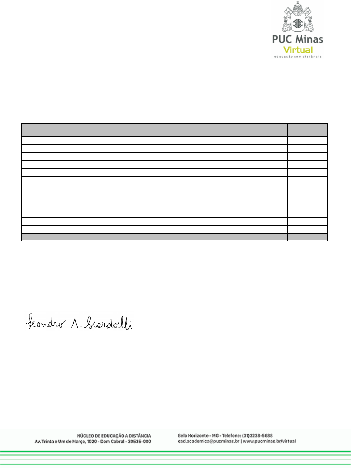 DECLARAÇÃO Declaramos para os devidos fins, que MARCUS VINÍCIUS SILVA, matrícula 1119195, está regularmente matriculado no Curso de Pós-graduação "lato sensu" - Especialização em INTELIGÊNCIA ARTIFICIAL E APRENDIZADO DE MÁQUINA*, promovido pelo Núcleo de Educação a Distância da Pontifícia Universidade Católica de Minas Gerais, no período de 16 de março de 2020 a 30 de outubro de 2021, perfazendo uma carga horária total de 360 (trezentas e sessenta) horas. Disciplinas que compõem a grade curricular: DISCIPLINA CH Análise de Imagem e Visão Computacional 30 Dataops e Implantação de Sistemas de Machine Learning 30 Estatística Geral - Teoria e Aplicações 30 Linguagens de Programação para Ciência de Dados 30 Machine Learning 30 Modelagem e Preparação de Dados para Aprendizado de Máquina 30 Modelos Estatísticos 30 Processamento de Linguagem Natural 30 Recuperação da Informação na Web e Redes Sociais 30 Redes Neurais e Aprendizagem Profunda 30 Tópicos Especiais em Machine Learning 30 Visualização de Dados 30 360 hCARGA-HORÁRIA TOTAL Mínimo para aprovação: 70 pontos Durante o curso, há atividades avaliativas de caráter obrigatório, como provas e desenvolvimento do Trabalho de Conclusão de Curso, imprescindíveis para a certificação. Área de conhecimento: CIÊNCIAS EXATAS E DA TERRA Belo Horizonte, 27 de julho de 2020. Secretário Acadêmico Leandro Ângelo Scardoelli *Este curso obedece ao disposto da Resolução CNE/CES nº 1, de 06 de abril de 2018, do Conselho Nacional de Educação e Lei 9.394/96, recredenciada através da Portaria MEC nº 699, de 20 de julho de 2016.