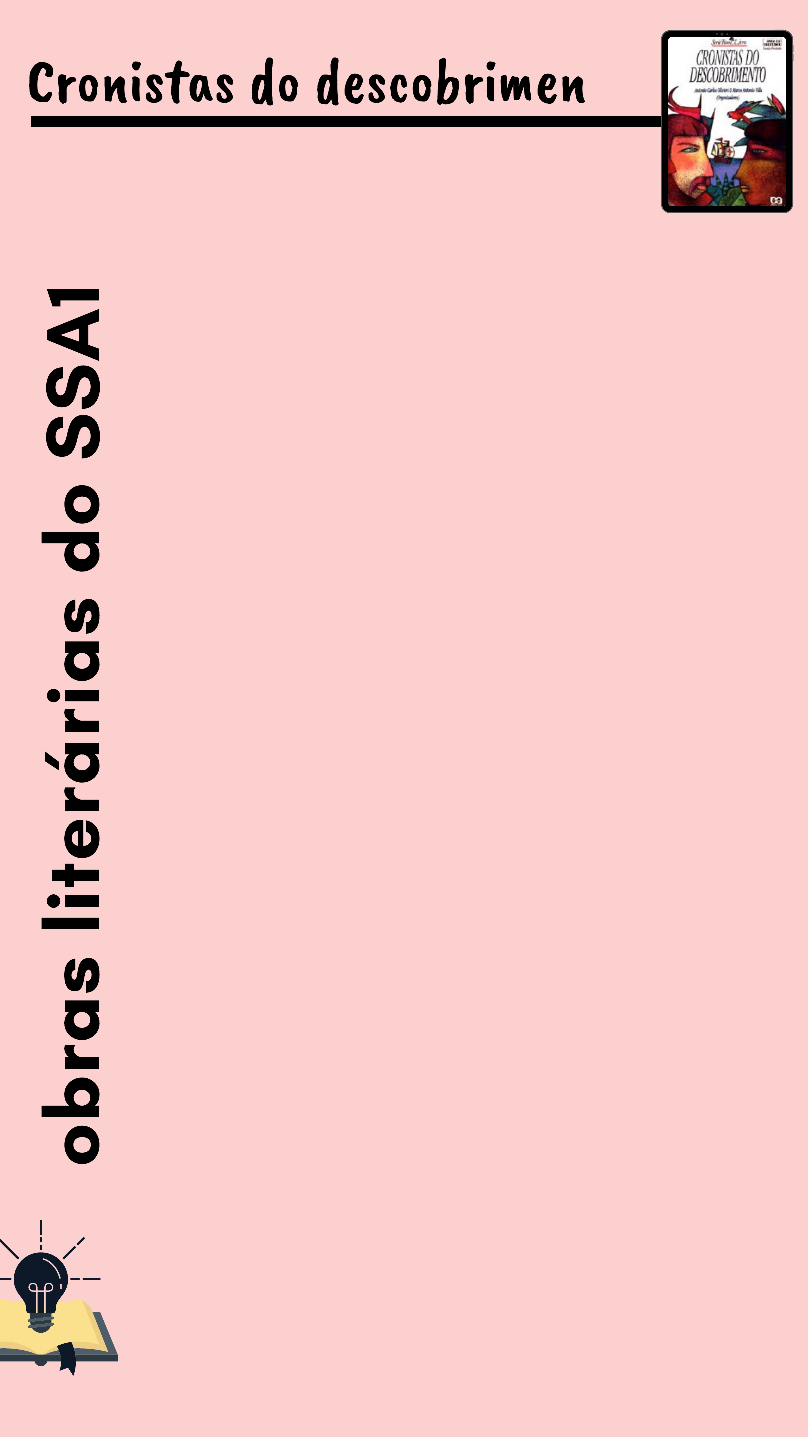 A obra reúne trechos começando pela Carta de Achamento de Pero Vaz de Caminha, e encontramos entre outros, trechos de obras de Hans Staden, cartas de jesuítas como José de Anchieta e Manuel da Nóbrega. Ela descreve os hábitos e as riquezas naturais do Brasil de quinhentos anos atrás; uma natureza ricaem pau-brasil, árvores frutíferas, diversidade de animais que não eram conhecidos pelo homem europeu e que despertou o interesse de conhecer cada vez mais o que era realmente o Brasil. Com isso, começou-se um processo de exploração, retirando da nossa terra o que ela possuía de melhor, através do intenso trabalho dos índios, que entregavam nossas riquezas em troca de utensílios sem valor. A admiração dos portugueses pelos índios transformou-se em ambição e avareza, levando-os a acabar com a cultura indígena, provocando assim a aculturação: o índio abandona seus hábitos e costumes para absorver acultura européia imposta a eles. @mandocanamed o b r a s l it e r á r ia s d o S S A 1 Cronistas do descobrimento Análise da obra Personagens O livro, por se tratar de uma coletânea de documentos, não possui personagens e sim, vários autores ( nomes na página seguinte ). livro disponível no nosso drive msha.ke/mandocanamed Cronistas do Descobrimento é um livro divido com vários autores, autores da época do descobrimento do Brasil, como assim? Na verdade o livro tem documento, textos, cartas que foram escritas naquela época, que foram enviadas para o rei de Portugal, ou que foram apenas escritas como uma forma de diário. Uma bem clássica e com certeza mais conhecida por todos que devem estar lendo essa resenha e que conhece a história do Brasil, é a carta de Pero Vaz de Caminha, onde além de ter a carta você vai ter uma explicação sobre o assunto, vai ter uma explicação sobre as palavras que raramente são utilizadas hoje em dia, mas que na época era bem usada, aquela escrita bem formal, bem clássica, eu não sei a palavra certa, mas utilizaria formal mesmo. (risos) Você também vai encontrar Piloto Anônimo, Pero Lopes de Sousa, Manuel da Nóbrega, André Thevet, Jean de Léry, Hans Staden, José de Anchieta, Pero de Magalhães Gândavo, Fernão Cardim, Gabriel Soares de Sousa. Sim, esses são os nomes dos autores das “obras” que você irá encontrar nesse livro. Eles realmente tratam não só do descobrimento do Brasil, mas também daquela fazer de transição, digamos assim, onde estão chegando pessoas de outros lugares e conhecendo o Brasil. Eles falam sobre os vários nomes que o Brasil teve, cidades que agora a gente conhece por um nome e antes era outro. Conta como foi a chegada deles até aqui, qual foi a reação dos índios ao ver eles, como os índios tratavam eles, como foi a igreja tentando e conseguindo converter alguns dos índios e mostrando que outros se negavam completamente, mostra alguns dos rituais dos índios, fala sobre as plantas, frutos, animais que são encontrados aqui nesse país. E o livro mostra tudo isso, a relação entre eles, como tudo era novidade, como aconteceu às coisas, como alguns dos autores ficam se confundindo com as coisas que realmente aconteceram. E enquanto eu estava lendo, eu fiquei pensando que teria sido muito legal se os índios daquela época tivessem relatado como foi para eles ver aquelas pessoas, que tinham coisas diferentes, agia de jeito diferente, se vestiam, seria legal se tivesse o relato dos índios, vocês não acham? o b r a s l it e r á r ia s d o S S A 1 @mandocanamed Cronistas do descobrimento Resumo do livro