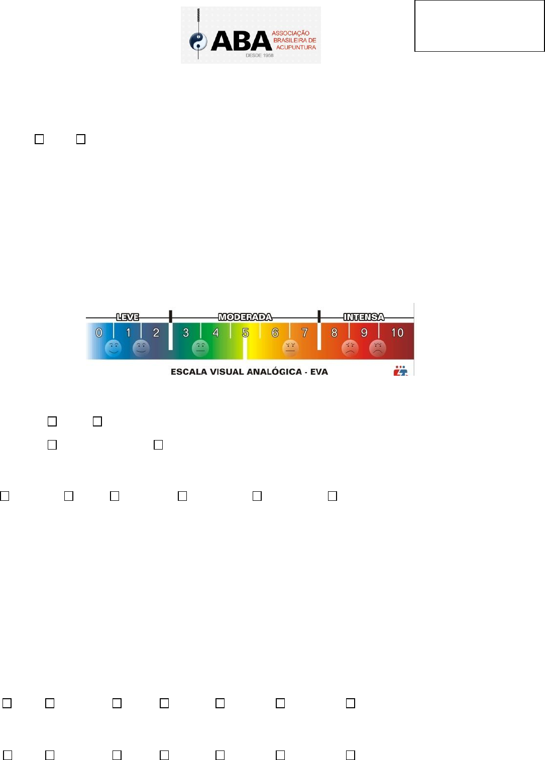 FICHA DE ANAMNESE EM ACUPUNTURA 1. Dados de identificação Nome: ______________________________________________________________________________ Sexo: M F Data de nascimento: ___/___/_____ Hora do nascimento: _________ Filhos:________ Data da avaliação: ___/___/_____ Hora da avaliação: _________ Naturalidade: ______________________ Profissão: ______________________________________ Estado civil: ____________________________ Endereço: ___________________________________________________________________________ Cidade: ___________________________ Estado: ____________ Telefone: ________________________ Email: _______________________________________________ 2. Queixa principal (QP) ___________________________________________________________________________________________ ___________________________________________________________________________________________ ___________________________________________________________________________________________ 2.1 Em caso de dor indique o nível da dor no momento da avaliação de acordo com a escala abaixo: 2.2 Local da dor Externo: pele músculos e tendões Interno: órgãos e vísceras ossos 2.3 Tipo de dor Pontada surda latejante queimação migratória pesada 3. História da doença atual (HDA) ___________________________________________________________________________________________ ___________________________________________________________________________________________ ___________________________________________________________________________________________ ___________________________________________________________________________________________ ___________________________________________________________________________________________ ___________________________________________________________________________________________ ___________________________________________________________________________________________ ____________________________________________________________________________________ 3.1 O que piora os sintomas? Frio Umidade Calor Vento Secura Atividade Repouso 3.2 O que melhora os sintomas? Frio Umidade Calor Vento Secura Atividade Repouso Ficha nº: ___________ 4. História da doença pregressa ___________________________________________________________________________________________ ___________________________________________________________________________________________ ___________________________________________________________________________________________ ___________________________________________________________________________________________ ___________________________________________________________________________________________ ___________________________________________________________________________________________ _____________________________________________________________________________________ 5. História familiar ___________________________________________________________________________________________ ___________________________________________________________________________________________ ___________________________________________________________________________________________ ____________________________________________________________________________________ 6. História social ___________________________________________________________________________________________ ___________________________________________________________________________________________ ___________________________________________________________________________________________ ____________________________________________________________________________________ 7. Medicação ___________________________________________________________________________________________ ___________________________________________________________________________________________ ___________________________________________________________________________________________ ____________________________________________________________________________________ 8. Estado geral 8.1 Alterações nos aparelhos: Respiratório : ____________________________________________________________________________ Digestório: _________________________________________________________________________ Circulatório: __________________________________________________________________________ Urinário: ___________________________________________________________________________ Intestinal: __________________________________________________________________________ Transpiração: muito pouco Horário que mais transpira: _________________________________ Libido: _______________________________________________________________________________ Realiza atividades físicas? ____________________________________________________________________ Memória: _____________________________________________________________________________ Dores de cabeça? __________________________________________________________________________ Órgãos dos sentidos: ____________________________________________________________________ Excreções:____________________________________________________________________________ 8.2 Compleição Yin yang 8.3 Aspecto geral do corpo (forma, postura, locomoção, astenia) ___________________________________________________________________________________________ ____________________________________________________________________________________ 9. Sono e disposição Dorme bem tem insônia sono restaurador sonha mas não lembra sonhos tranqüilos Sonhos agitados Obs.: _______________________________________________________________________________________ ____________________________________________________________________________________ 10. Menstruação Ciclo regular ciclo adiantado ciclo atrasado dor antes do fluxo Dor durante o fluxo dor após o fluxo 11. Características 11.1 Perfil emocional Qual das 5 emoções o paciente mais se identifica? Preocupação medo raiva alegria tristeza 11.2 Face e pele Face brilhante (normal) Pele seca Face es
