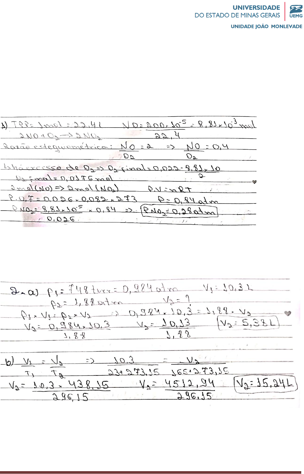 DSc. Jussara Aparecida de Oliveira Cotta. Professora da UEMG, João Monlevade – MG. E-mail: japcotta@hotmail.com DISCIPLINA DE FÍSICO-QUÍMICA I ATIVIDADE 1 - Gases Questão 1. Considere a seguinte reação: 2NO + O2 → 2NO2 200 mL de NO nas TPP reagem com 500 mL de O2 na TPP. Calcule a pressão parcial de NO2 após a reação se completar. Admita um volume constante. Questão 2. Uma quantidade fixa de gás a 23°C exibe pressão de 748 torr e ocupa um volume de 10,3 L. (a) Use a lei de Boyle para calcular o volume que o gás ocupará a 23oC se a pressão for aumentada para 1,88 atm. (b) Use a lei de Charles para calcular o volume que o gás ocupará se a temperatura for aumentada para 165°C enquanto a pressão for mantida constante. DSc. Jussara Aparecida de Oliveira Cotta. Professora da UEMG, João Monlevade – MG. E-mail: jussara.cotta@uemg.br 2 Questão 3. Suponha que lhe sejam dados dois frascos e lhe seja dito que um contém um gás de massa molar 30, o outro um gás de massa molar 60, ambos a mesma temperatura. A pressão no frasco A é X atm, e a massa de gás no frasco é 1,2 g. A pressão no frasco B é 0,5X atm, e a massa de gás no frasco é 1,2 g. Qual frasco contém o gás de massa molar 30 e qual contém o de massa molar 60? Questão 4. Calcule cada uma das seguintes grandezas para um gás ideal: (a) O volume de gás, em litros, se 2,46 mol tiver pressão de 1,28 atm a temperatura de -6°C; (b) a temperatura absoluta do gás na qual 4,79 x 10-2 mol ocupa 135mL a 720 torr; (c) a pressão, em atmosferas, se 5,52 x 10-2 mol ocupa 413 mL a 88°C; (d) a quantidade de gás, em mols, se 88,4 L a 54°C tem pressão de 9,84 kPa. DSc. Jussara Aparecida de Oliveira Cotta. Professora da UEMG, João Monlevade – MG. E-mail: jussara.cotta@uemg.br 3 Questão 5. Um tanque de um aparelho de mergulhador contem 0,29 kg de O2 comprimido em um volume de 2,3 L. (a) Calcule a pressão de gás dentro do tanque a 9oC. (b) Que volume esse oxigênio ocuparia a 26°C e 0,95 atm? Questão 6. (a) Coloque os seguintes gases em ordem crescente de velocidade molecular média a 300 K: CO2, N2O, HF, F2, H2. (b) Calcule e compare as velocidades vmq das moléculas de H2 e CO2 a 300 K. DSc. Jussara Aparecida de Oliveira Cotta. Professora da UEMG, João Monlevade – MG. E-mail: jussara.cotta@uemg.br 4 Questão 7. O gás de oxigênio com um volume de 1000cm3 a 40oC e uma pressão de 1,01x105Pa se expande até atingir o volume de 1500cm3 e uma pressão de 1,06x105Pa. Encontre: (a) o número de moles de oxigênio no sistema e (b) sua temperatura final. Questão 8. Qual o número de moléculas por cúbico no ar a 20oC e à pressão de 1,0 atm (=1,01 x 105 Pa)? Qual a massa de 1,0m3 desse ar? Suponha que 75% das moléculas sejam de nitrogênio (N2) e 25% de oxigênio (O2). Questão 9. Certo gás contido em um recipiente de 1m³ com êmbolo exerce uma pressão de 250Pa. Ao ser comprimido isotermicamente a um volume de 0,6m³ qual será a pressão exercida pelo gás? Questão 10. Qual é o volume ocupado por um mol de gás perfeito submetido à pressão de 5000N/m², a uma temperatura igual a 50°C? Dado: 1atm=10000N/m² e 0,082 atm. L/mol.K. DSc. Jussara Aparecida de Oliveira Cotta. Professora da UEMG, João Monlevade – MG. E-mail: jussara.cotta@uemg.br 5 Questão 11. (a) Seria possível que uma amostra de 25g de argônio gasoso, num vaso de volume igual a 1,5 dm3, exercesse uma pressão de 2,0 bar, a 30ºC, se o seu comportamento fosse de um gás perfeito? Em caso negativo, que pressão ele exerceria? Que pressão teria o argônio se ele fosse um gás de van der Waals? Questão 12. Um gás perfeito sofre uma compressão isotérmica que reduz de 1,80dm3 o seu volume. A pressão final do gás é 1,97bar e o volume final é 2,14dm3. Calcule a pressão inicial do gás em (a) bar e (b) Torr. Questão 13. Uma amostra de hidrogênio gasoso tem a pressão de 125 kPa na temperatura de 23º C. Qual a pressão do gás na temperatura de 11ºC. DSc. Jussara Aparecida de Oliveira Cotta. Professora da UEMG, João Monlevade – MG. E-mail: jussara.cotta@uemg.br 6 Questão 14. A 100º C e 16,0 kPa, a massa específica do vapor de fósforo é 0,6388 kg m-3. Qual é a fórmula molecular do fósforo nessas condições? Questão 15. Uma mistura gasosa é constituída por 320mg de metano, 175mg de argônio e 225mg de neônio. A pressão parcial do neônio, a 300K, é 8,87kPa. Calcule (a) o volume da mistura e (b) a pressão total da mistura. Questão 16. Numa experiência para a determinação da massa molar de um gás, confirmou-se uma amostra do gás num balão de vidro de 250cm3, sob pressão de 152Torr e a 298K. A massa do gás, corrigida do efeito do empuxo do ar, foi 33,5mg. Qual é a massa molar do gás? DSc. Jussara Aparecida de Oliveira Cotta. Professora da UEMG, João Monlevade – MG. E-mail: jussara.cotta@uemg.br 7 Questão 17. Calcule a pressão exercida por 1,0mol de H2S, comportando-se como (a) um gás perfeito, (b) um gás de van der Waals quando está confinado nas seguintes condições: (i) a 273,15K em 22,414dm3; (ii) a 500K em 150cm3. Questão 18. Um gás a 350K e 12atm tem o volume molar 12% maior do que o calculado pela lei dos gases perfeitos. Calcule (a) o fato de compressibilidade nestas condições e (b) o volume molar do gás. Que forças são dominantes no gás, as atrativas ou as repulsivas. DSc. Jussara Aparecida de Oliveira Cotta. Professora da UEMG, João Monlevade – MG. E-mail: jussara.cotta@uemg.br 8 Questão 19. Um vaso de 22,4dm3 contém 1,5mol de H2 e 2,5 mol de N2, a 273,15 K. Calcule (a) as frações molares de cada componente da mistura; (b) as respectivas pressões parciais; e (c) a pressão total no vaso. Questão 20. Um certo gás segue a equação de van der Waals com a = 0,76 m6 Pa mol-2. O volume é de 4,00 x 10-4 m3 mol-1, a 288K e 4,0MPa. Com essa informação, calcule a constante b de van der Waals. Qual o fator de compressibilidade do gás nessas condições de temperatura e p