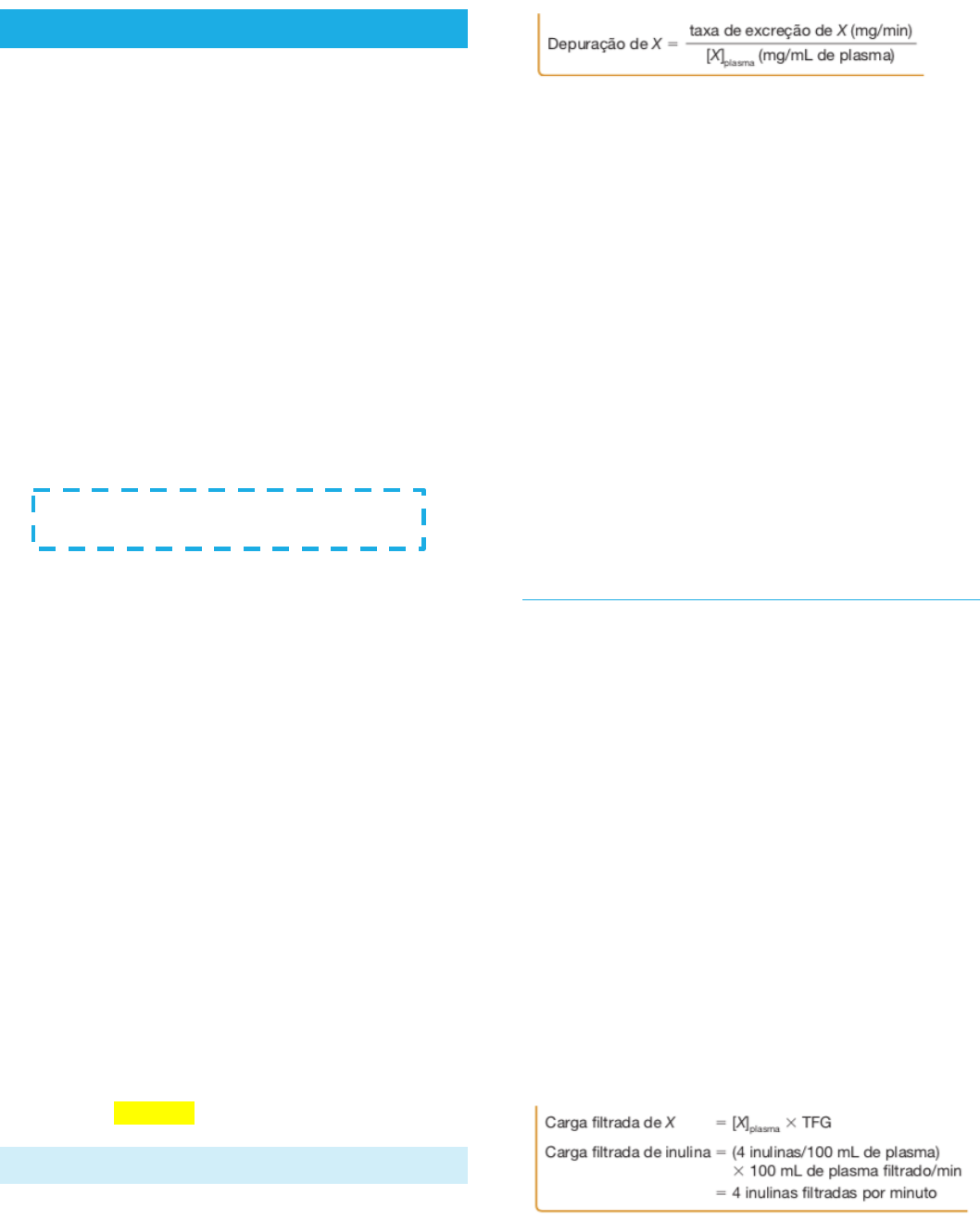 EXCREÇÃO A produção de urina é o resultado de todos os processos que ocorrem no rim. Quando o líquido chega ao final do néfron, ele apresenta pouca semelhança com o líquido que foi filtrado para a Capsula de Bowman. Glicose, aa e metabolitos uteis desaparecem, tendo sido reabsorvidos para dentro do sangue, e os resíduos orgânicos estão mais concentrados. A concentração de íons e água na urina é extremamente variável, dependendo do estado do corpo. Embora a excreção nos diga o que o corpo está eliminando, a excreção por si só não pode nos dar detalhes da função renal. Para qualquer substância: Apenas a taxa de excreção de uma substância não nos diz nada sobre como o rim maneja essa substância. A taxa de excreção de uma substância depende da taxa de filtração da substância e de se a substância é reabsorvida, secretada ou ambas, enquanto ela passa ao longo do túbulo renal. O manejo renal de uma substância e a TDF são, muitas vezes, de interesse clínico. Por exemplo, os médicos usam a informação sobre a TFG da pessoa como um indicador da função global do rim. Todavia, como os investigadores que lidam com seres humanos vivos podem avaliar a filtração, a reabsorção e a secreção em néfrons individuais? Eles não têm como fazer isso de maneira direta: os rins não são tão facilmente acessíveis e os néfrons são microscópicos. Por essa razão, os cientistas tiveram de desenvolver uma técnica que lhes permitisse avaliar a função renal usando apenas uma análise da urina e do sangue. Para fazer isso, eles aplicaram o conceito de depuração. DEPURAÇÃO A depuração é uma forma não invasiva de medir a TFG. A depuração (em inglês, clearance) de um soluto é a taxa na qual esse soluto desaparece do corpo por excreção ou metabolização. A equação geral para a depuração é: Em que a depuração consiste no volume do plasma (mL) depurados de X por minuto. Observe que as unidades para a depuração são mL de plasma e tempo. A substância X não aparece em nenhum lugar em relação as unidades da depuração. Para qualquer soluto que está sendo depurado somente pela excreção renal, a depuração é expressa como o volume de plasma passando pelos rins que foi totalmente limpo do soluto em um dado período de tempo. Devido a esta ser uma maneira indireta de se pensar na excreção (quanto sangue foi depurado de X, em que de quanto sangue de X foi excretado), a depuração frequentemente se torna um conceito difícil de ser compreendido. EX: INULINA Os cientistas descobriram, a partir de experimentos com néfrons isolados, que a inulina injetada no plasma é filtrada livremente para dentro do néfron. A medida que passa pelos túbulos renais a inulina não é nem reabsorvida nem secretada. Em outras palavras, 100% da inulina que é filtrada para o túbulo acaba sendo excretada. Como isso se relaciona com a depuração? A inulina foi injetada de modo que a concentração plasmática é de 4 moléculas de inulina por 100 mL de plasma. Se a TFG é 100 mL de plasma filtrado por minuto, podemos calcular a taxa de filtração, ou a carga filtrada de inulina usando a equação: A medida que a inulina e o plasma filtrados passam ao longo do néfron, todo o plasma é reabsorvido, mas toda a inulina permanece no túbulo. O plasma reabsorvido não contém inulina, de forma que dizemos que ele foi completamente depurado da inulina. Excreção = filtração – reabsorção + secreção Dessa forma, a depuração da inulina é de 100 mL de plasma depurados/min. Ao mesmo tempo, a taxa de excreção da inulina é de 4 moléculas de inulina excretadas por minuto. Essa informação é útil para podermos calcular a TFG. A depuração da inulina (100 mL de plasma depurado/min) é igual a TFG (100 mL de plasma filtrado/min). Assim, para qualquer substância que é livremente filtrada, mas não é reabsorvida nem secretada, sua depuração é igual a TFG. A depuração da insulina é igual a TFG. Também sabemos que 100% da inulina que é filtrada para dentro do túbulo é excretada. Em outras palavras: Devido a essa igualdade, podemos substituir a taxa de excreção pela carga filtrada: Essa equação pode ser rearranjada como: Isso mostra que o lado direito dessa equação é idêntico a equação da depuração da inulina. Assim, a equação geral para a depuração de qualquer substância X (mL de plasma depurados/min) é: Para a inulina: DEPURAÇÃO RENAL Essas figuras mostram a relação entre depuração e excreção. Cada figura representa os eventos que ocorrem em um minuto. Para simplificar considera-se que 100% do volume filtrado é reabsorvido EQUAÇÕES ÚTEIS EM FISIOLOGIA RENAL IMPORTANCIA DEPURAÇÃO TFG = depuração da inulina Por que isso é importante? O uso da inulina é restrito a pesquisa. Infelizmente nenhuma substância que existe naturalmente no corpo humano é manejada pelo rim exatamente da mesma forma que a inulina. No cenário clinico, médicos utilizam a creatinina para estimar a TFG. A creatinina é um produto da quebra da fosfocreatina, um composto que serve de fonte de energia que é encontrado principalmente nos músculos. A creatinina é constantemente produzida pelo corpo e não precisa ser administrada. A concentração de creatinina no plasma não varia muito. Embora a creatinina esteja sempre presente no plasma e seja facilmente medida, ela não é uma molécula perfeita para estimar a TFG porque uma pequena quantidade é secretada na urina. No entanto, a quantidade secretada é suficientemente pequena, para que, na maioria das pessoas, a depuração de creatinina seja rotineiramente usada para estimar a TFG. A DEPURAÇÃO NOS AUXILIA A DETERMINA O MANEJO RENAL Uma vez que conhecemos a TFG de uma pessoa, podemos determinar como o rim maneja qualquer soluto medindo a concentração do soluto no plasma e sua taxa de excreção. Se assumirmos que o soluto é livremente filtrado no glomérulo, sabemos pela equa
