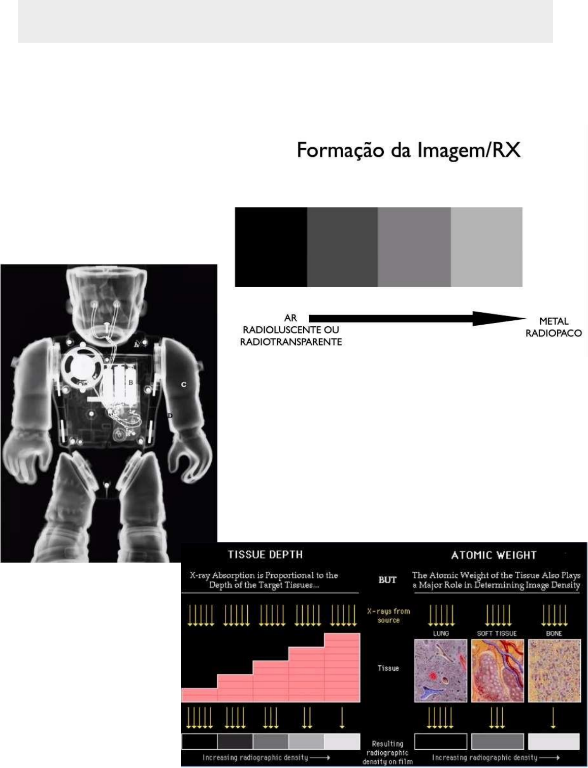 Imaginologia Semiologia Torácica e Anatomia Radiológica Aspectos básicos da imaginologia • Raio X É uma escala de preto ao branco passando pelo cinza. O Que fica muito preto→ radioluscente ou radiotransparente O que fica muito branco→ radiopaco Para definir se uma região com cor intermediária é radioluscente ou radiopaco dependerá da cor de um referencial. Por exemplo: na região C do boneco ao lado é radioluscente em relação ao B, mas é radiopaco em relação a A. Normalmente, a relação é descrito no laudo da imagem. A cor do raio X depende do tipo e espessura tecido que compõe a região/órgão do corpo: Quanto mais espessado e denso mais branco fica o raio X dessa região • Tomografia computadorizada A física da tomografia é a mesma do raio X, a diferença entre as duas é que a tomografia “fatia” a pessoa em diversas dimensões para obter imagens de forma rápida e depois e monta-se (junta) as imagens no computador, tornando a mais detalha que o raiox. Diferenças: ▪ Raio X→bidimensional ▪ TC→ tridimensional ▪ TC 50 a 100x mais radiação ▪ TC ainda é mais caro ▪ Raio X→ mais disponível Obs: Pediatra pede menos tomografia devido a radiação (acumulativa→ toda vida). Avalia as densidades dos tecidos/órgãos de forma quantitativa. Nessa imagem ao lado, mostra a densidade das regiões no TC de forma numerada (quantitativa). Quanto mais escuro (preto) na TC→ hipoatenuante E mais claro (branco)→ hiperatenuante. Radiologia do Tórax Usado em: - Avaliação pneumológica→ imprescindível contar com um estudo radiológico do tórax. - Saúde ocupacional, pré-operatório, diagnóstico e controle de tratamento, terapia intensiva, etc. Obs: Terapia intensiva→ risco grande de pneumonia aspirativa. • Técnicas de posição ➢ PA (Póstero- anterior) Raio entra por trás e sai na frente. Pede ao paciente para realizar inspirações máxima. A imagem é feita em pausas respiratórias. Obs: Somente se faz raio X AP em pacientes acamados, no caso é de frente para trás. Porque é melhor fazer PA em vez de AP? Porque retiira a escapula da visão do raio X e por causa do coração (a medida que aproxima o coração do filme, ele aproxima do seu tamanho real). Em AP o coração fica mais magnificado. ➢ Perfil Porque é importante fazer em duas incidências (PA e Perfil) em vez de uma? É importante para ter uma visão tridimensional, um tem noção de direito e esquerdo o outro de profundidade. E é importante para avaliar a lesão na questão espacial. ➢ Técnicas complementares Avaliação de Raio X de tórax fisiológico 1. Importante verificar: Nome da pessoa (identificação certa), lado (técnico é obrigado a colocar os lados) e posicionar o raio x (avalia o raio X como o paciente estivesse de frente para você). 2. Parede Torácica, ossos e abdome ➢ Escapula ➢ Processo coracóide da escapula ➢ Costelas Posteriores e anteriores Como saber se a costela é anterior ou posterior? A costela anterior tem uma parte cartilaginosa (menos denso que a parte óssea), dessa forma fica menos visível (radioluscente). ➢ Mamas ➢ Bolha gástrica ou flexura esplênica do colón. Essa costela em branco é posterior- questão anatômica→ todo ósseo (muito visível). Em azul: mamas. 3. Mediastino, coração e hilo 1. Traqueia Estrutura tubular radiopaco→ importante está centralizada. 3. Silhueta do mediastino Em PA: 1- V. cava superior 2. VCI 3- AD 4- Arco aórtico 5- tronco pulmonar 6, 7- VE 2. Coração Índice cardiotorácico (ICT) < 0,5 em adultos Crianças costumam ter maior de 0,5→ sendo normal. Raio X para avaliar o coração não é um método muito sensível. Claramente, aumento de ICT. Em Perfil VD e AE consegue visualizar 4. Hilo Pulmonar Lado direito BAV Lado Esquerdo ABV **Não consegue visualizar com clareza o brônquio (presença de ar), basicamente consegue ver é a artéria (caracteriza hilo pulmonar no raio X). Artéria E (ABV) é mais alta que a Artéria D (BAV). Hilos pulmonares = Artérias pulmonares Parâmetros técnicos - Simetria: linha mediana no mediastino e linha borda medial das clavículas→ essas linhas devem estar equidistantes. 4. Pulmões Avalia cada pulmão individualmente e depois avalia de forma comparativa os dois. 5. Contagem das Costelas - Inspiração: Pausas inspiratórias – pede o paciente para inspirar e segurar a respiração. Contagem dos arcos costais – pelo menos 9 arcos costais posteriores acima do diafragma Importante: Percepção de quantidade de tecido adiposo Anatomia Pulmonar 10 segmentos, 3 lobulos 10 segmentos, 2 lobulos 1 e 2 → apico-posterior Lesões Fundamentais Professor: Henrique Pereira Faria Imaginologia Lesões fundamentais Lesões do espaço aéreo • Consolidação - Espaço aéreo (alvéolo) preenchido por pus, células ou sangue. Esse preenchimento de vários alvéolos provocam uma opacidade homogênea na imagem apresentada no raio X. Características observadas: ✓ Lesão radiopaca – raio x mais branco ✓ Sinal de silhueta Contorno do mediastino → silhueta Estruturas de densidades semelhantes se tocam, passando a apresentar um contorno único. Perda do contorno mediastinal e diafragmático, utilizado para localiza lesões. ✓ Broncogramas aéreos - O brônquio não é usualmente visível - Se há algum fluido preenchendo alvéolos, ele se trona visível. - Broncograma aéreo: sinal de patologia do Espaço aéreo Imagens radioluscentes tubulares na seta preta-→são os broncos normais, porém os ácinos estão preenchidos com algum fluido (consolidação), isso torna os brônquios visíveis (radioluscentes) com ar (antes não visíveis). Observação: Consolidação→ maioria das vezes pneumonia→ infecção→ muco,pus, etc. Anatomia radiológica x Consolidação Lobos superiores Imagem radiopaca no lobo superior direito com broncoespasmo aéreo de permeio, sugestivo de consolidação. Lobo Médio Raio X com presença de sinal da silhueta na bord
