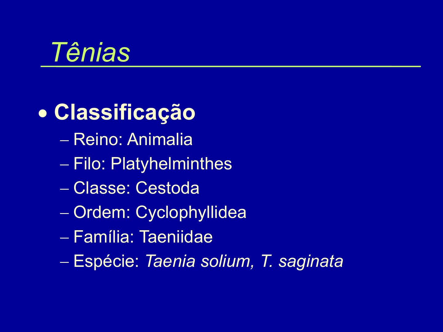 Classificação Reino: Animalia Filo: Platyhelminthes Classe: Cestoda Ordem: Cyclophyllidea Família: Taeniidae Espécie: Taenia solium, T. saginata Tênias Biologia Hospedeiros Homem (HD) Suíno (HI deTaenia solium) Bovino (HI deT. saginata) Morfologia O adulto apresenta o corpo formado por escólex, colo e estróbilo; apresentam tamanho variável entre 1, 5 a 12 m; A larva apresenta 10-15 mm e só é encontrada no HI. Tênias Escólex (cabeça) de T. solium Escólex Acúleos ou ¨ganchos¨. Ventosa Escólex Características gerais São vulgarmente denominadas tênias ou “solitárias”; As grandes tênias do homem são parasitos intestinais; Geralmente são assintomáticas; Outras tênias podem parasitar o homem em grau variado como Hymenolepis nana, H. diminuta, Dipylidium caninum e Difilobotrium latum. Tênias Taenia solium Escólex Proglote maduro de T. solium Ovos deTaenia sp. Taenia solium: ciclo evolutivo Biologia Ciclo evolutivo Proglotes com ovos são liberados pelas fezes do homem (HD); Herbívoros e suínos (HI) se contaminam pela ingestão de ovos liberados no ambiente; Após a ingestão do ovo ocorre liberação do embrião hexacanto (oncosfera) no intestino. Tênias Ciclo evolutivo O embrião atravessa a mucosa intestinal e ganha a circulação sanguínea; Pela circulação a oncosfera chega aos músculos onde se encista (cisticercose animal); O homem (HD) ingere a carne do HI contendo os cistos (formas infectantes); O cisto se rompe no intestino liberando a larva que se fixa à mucosa intestinal e forma o verme adulto. Biologia Período de incubação: 60-70 dias Nutrição: adultos euritróficos (nutre-se de várias substâncias do hospedeiro) Infectividade A imunidade específica do hospedeiro definitivo não evita a infecção; Após 3 a 4 meses do nascimento, a resposta imune de bovinos e suínos já é capaz de reagir contra os cisticercos; Os ovos resistem aos sistemas de biodegradação e às temperaturas de refrigeração por longo período; A cocção (cozimento) inviabiliza os cisticercos na carne dos animais; A ingestão de ovos de T. solium pelo HD provoca a cisticercose no homem. Tênias Patologia Na teníase - Ocorre por ingestão de carne crua ou mal cozida de suíno ou gado. A fixação da larva geralmente não promove alterações importantes no intestino do homem, além de uma tênue reação inflamatória no ponto de fixação do escólex. Tênias Na cisticercose - Ocorre por ingestão de ovos; - Compressão dos tecidos adjacentes; - Inflamação crônica com infiltrado mononuclear e eosinofílico, seguido de formação de granuloma e calcificação (cisticerco). Taenia Cisticercos em cérebro humano. Manifestações Teníase Dor epigástrica, inapetência ou apetite aumentado; astenia, perda de peso, náuseas e diarreia. Tênias T. solium Cisticercose Neurocisticercose: crises epileptiformes, cefaleia, vômitos, apatia, torpor ou excitação. Cisticercose oftálmica: desvio do globo ocular, exoftalmia, diminuição e até perda da acuidade visual. Cisticercose disseminada: cistos no subcutâneo ou na musculatura esquelética com manifestação variável. TC em caso de neurocisticercose Cisticercose ocular; notar a larva na câmara anterior do olho. Cisticercose muscular; RX mostrando cisticercos calcificados. Cisticercose subcutânea; notar pequenos nódulos calcificados sob a pele. Diagnóstico Teníase Anamnese pode levar ao diagnóstico direto de teníase, nos casos de relato da presença de proglotes nas fezes. Tênias do homem Diagnóstico Na cisticercose - Diagnóstico por imagem (presença de calcificações em 15-35% dos pacientes); - Exame fecal: pode ser negativo na cisticercose; - Exame do líquor: aumento da pressão, hipercitose moderada (eosinófilos), aumento das globulinas; IFI; - Imunodiagnóstico Provas de aglutinação/precipitação são pouco confiáveis devido a reações cruzadas com outros cestódeos; ELISA. - Biópsia. Tratamento Niclozamida, Praziquantel (Teníase) Albendazol (Cisticercose) Cuidado deve ser tomado com o uso da medicação em pacientes com cisticercose ocular ou medular, pelo risco de lesão irreparável; Substâncias com efeito purgativo (tenífugas), não acabam com a teníase, mesmo com uma grande eliminação de proglótides. Tênias Epidemiologia As teníases são cosmopolitas, tendendo a se apresentarem com maior número de casos relacionados aos hábitos culturais; T. saginata (África, Europa central e mediterrânea); T. solium (América Latina, África e sudeste asiático não islâmico). Tênias Dinâmica da transmissão - Poluição fecal humana (facilita o contágio dos HI e do homem); - Saneamento precário do peridomicílio; - Procedimentos de controle (legislação, inspeção em frigoríficos, consumo da carne mal cozida, educação sanitária e saneamento doméstico). Abate clandestino Abate regular inspecionado