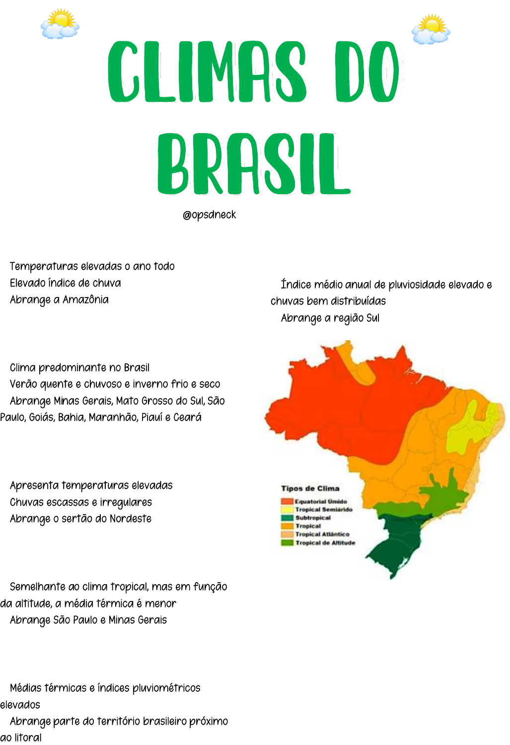 Equatorial úmido ⤿ ⤿ ⤿ Tropical ⤿ ⤿ ⤿ Tropical semiárido ⤿ ⤿ ⤿ Tropical de altitude ⤿ ⤿ Tropical atlântico ⤿ ⤿ Subtropical ⤿ ⤿